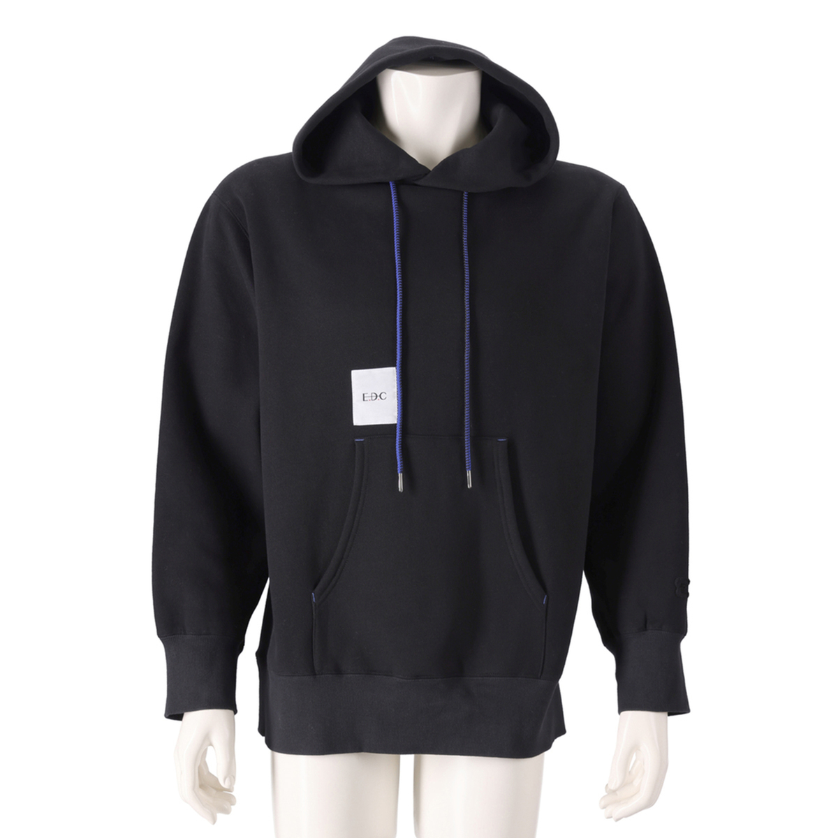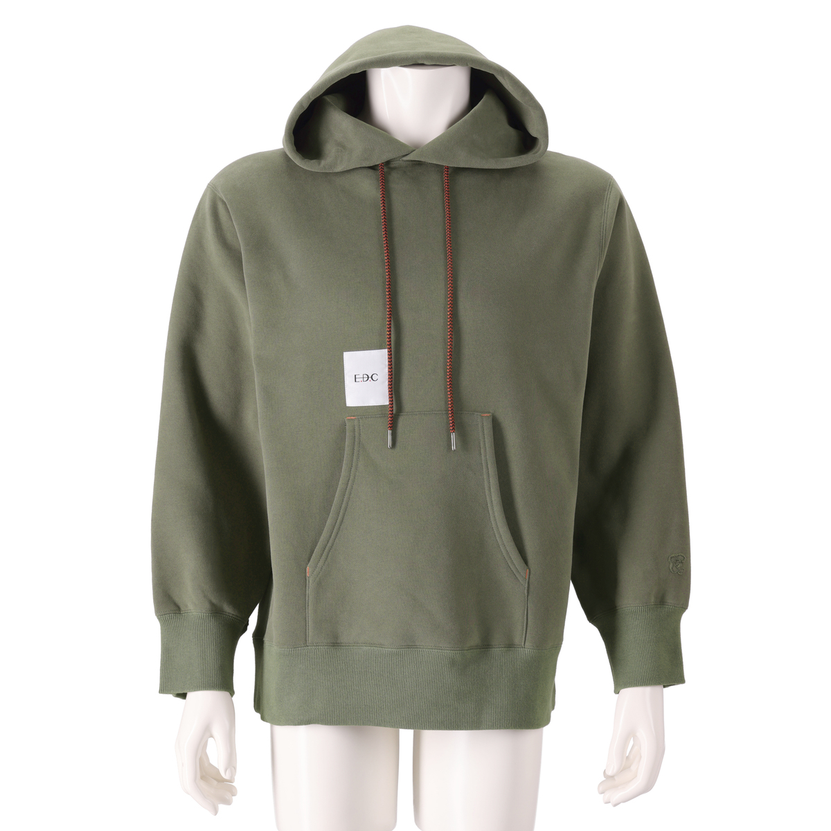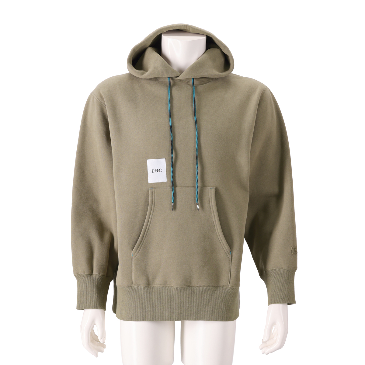 ブランドロゴEDCをモチーフにしたジャガードタグを前身頃に縫い付けてデザイン。2枚仕立てのフードは立ち上がりが綺麗で、顔まわりにボリュームが出るので、小顔効果にも期待。スピンドルは2色ミックスのカラーアクセントが特徴の丸紐コードで、先端には弾丸チップをデザインしました