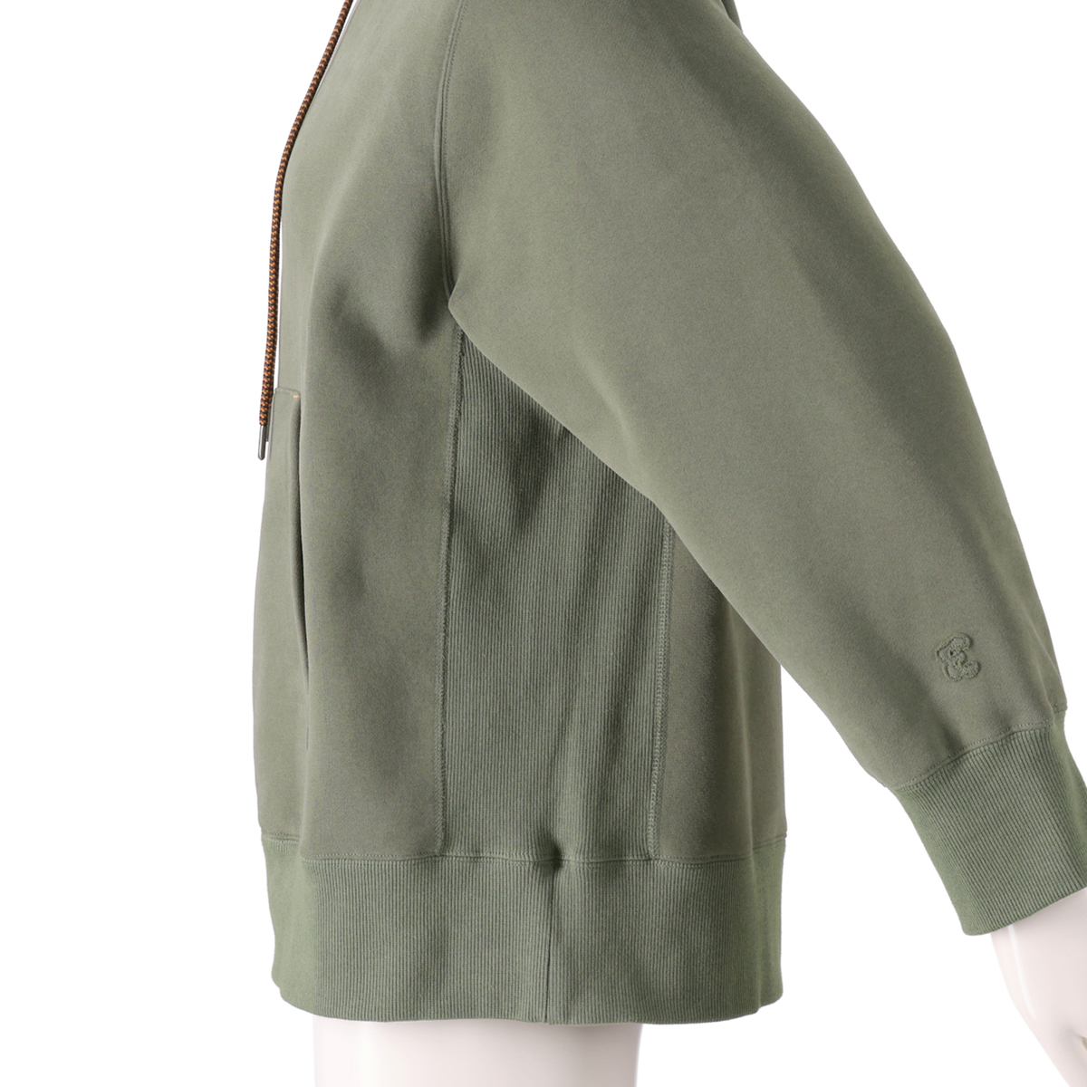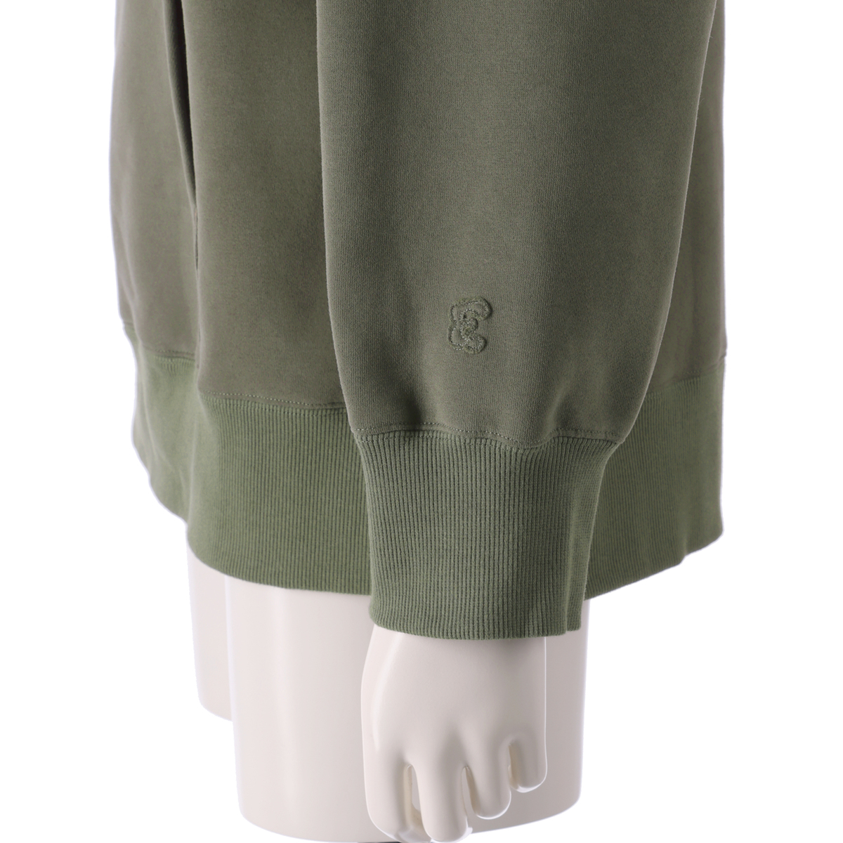 袖口は身頃同色のスパンリブで、袖捲りもしやすい設計。左袖口にブランドロゴの「E」をモチーフにした共生地のアップリケをさりげなくデザイン。切りっぱなしのモチーフをステッチで縫い付けたアップリケデザインが、カジュアルな印象です