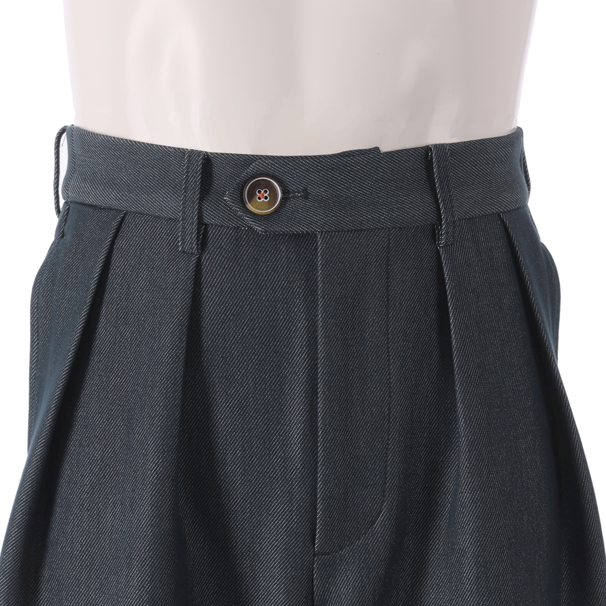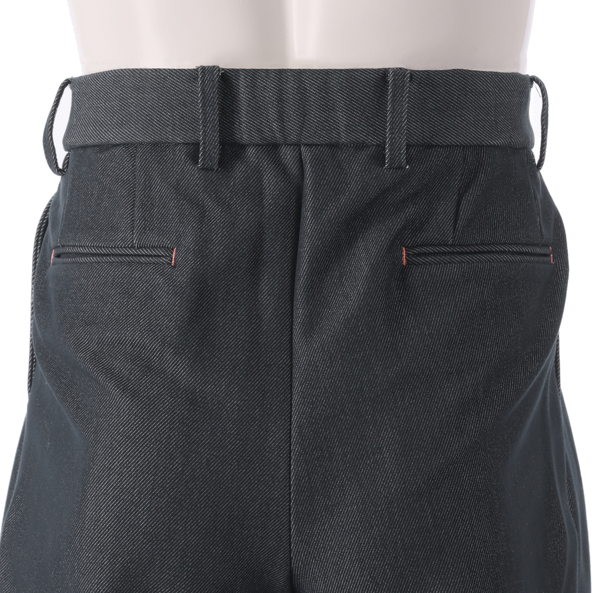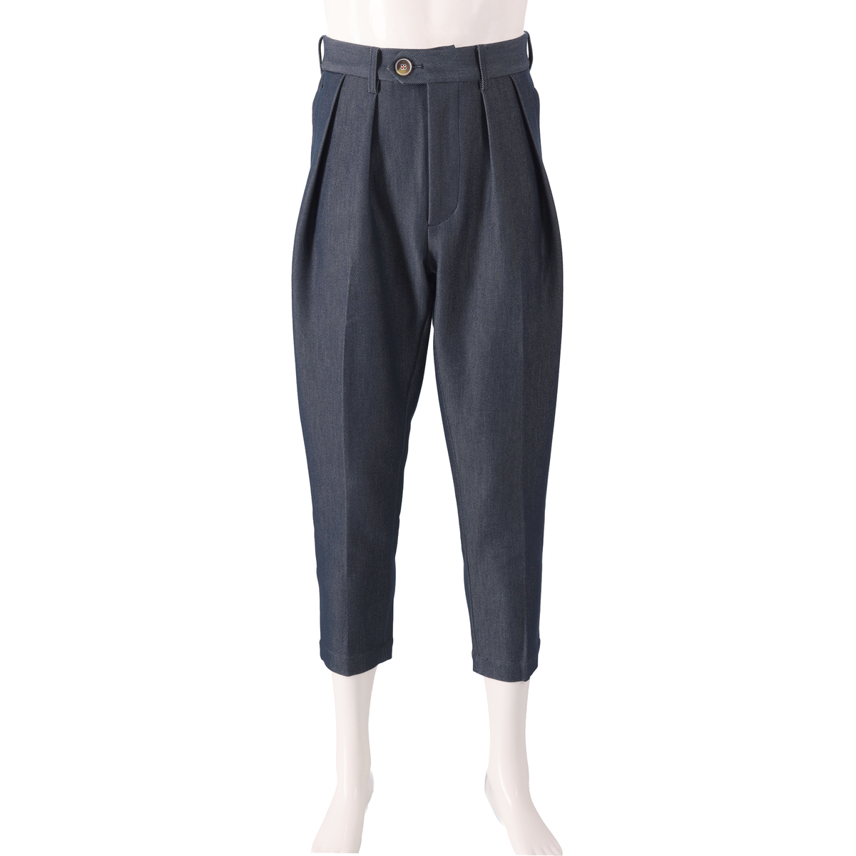 デニム風の先染めツイル生地を使用したタックパンツ。デニムよりも柔らかく、カジュアルさを抑えた大人の雰囲気を演出する素材を選びました。ウエストは2本タックで腰まわりはワイドに、裾にかけて窄めたテーパードシルエットがスタイリッシュです