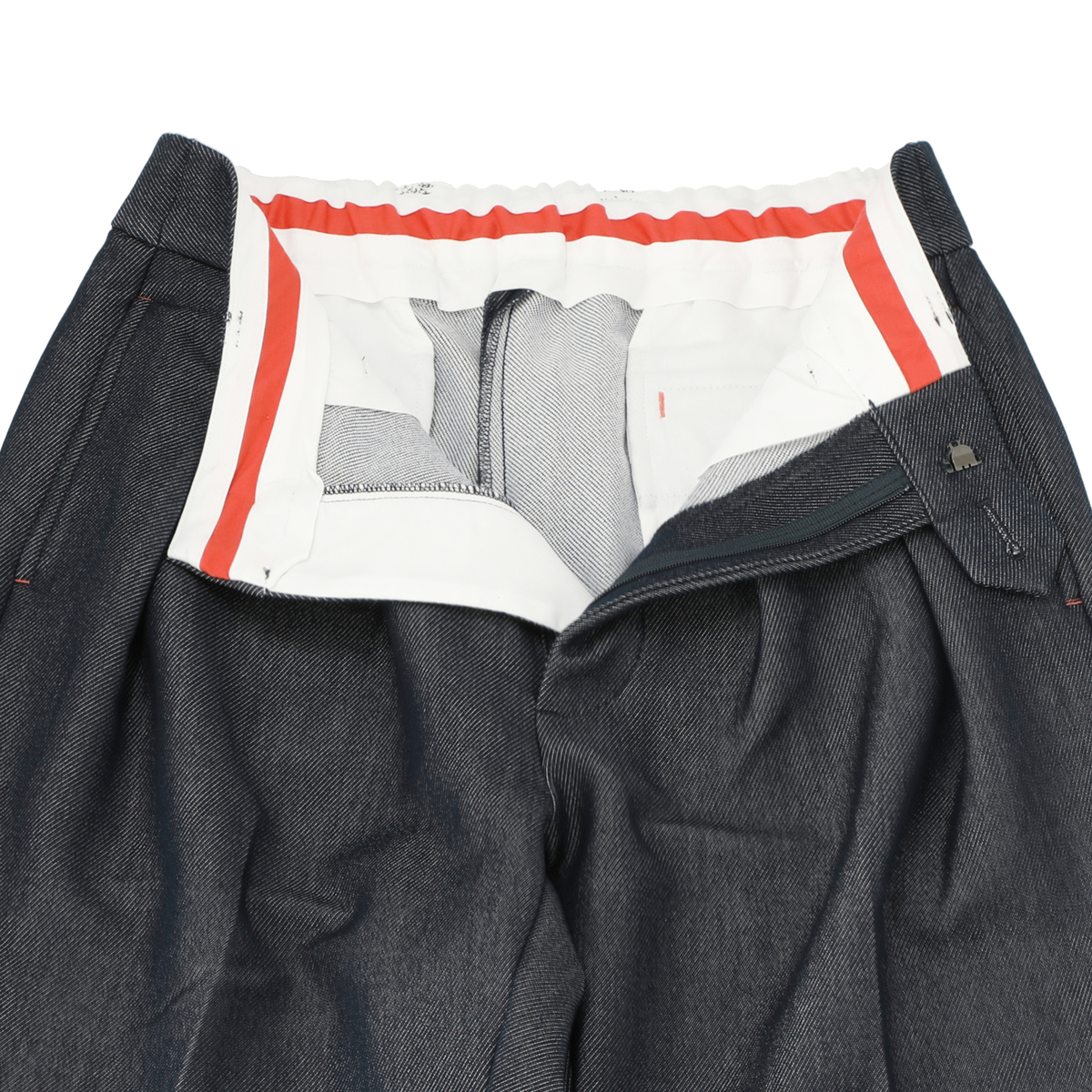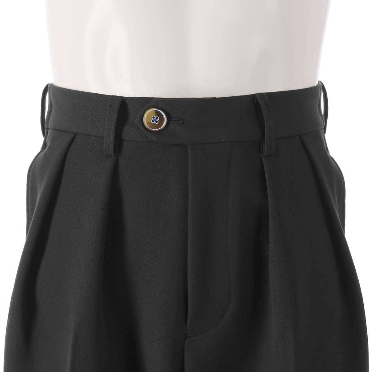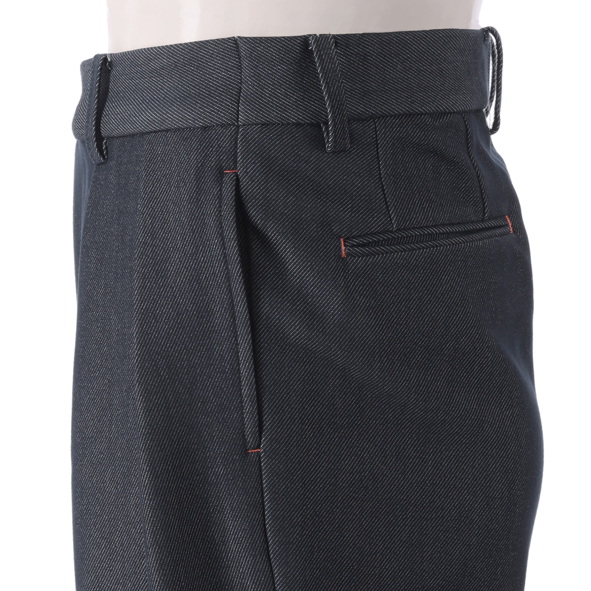 デニム風の先染めツイル生地を使用したタックパンツ。デニムよりも柔らかく、カジュアルさを抑えた大人の雰囲気を演出する素材を選びました。ウエストは2本タックで腰まわりはワイドに、裾にかけて窄めたテーパードシルエットがスタイリッシュです