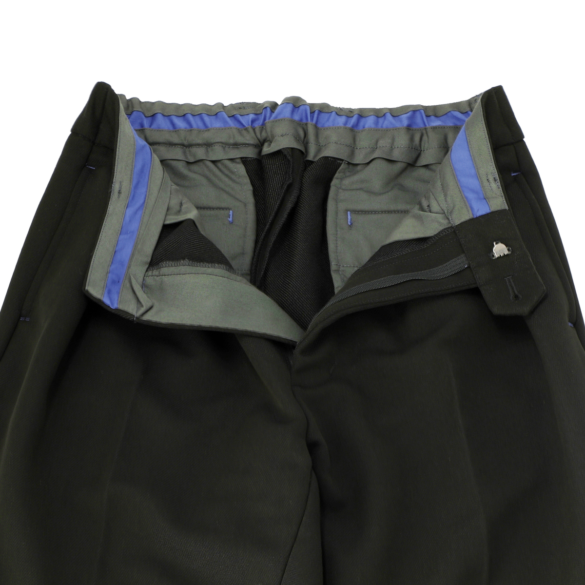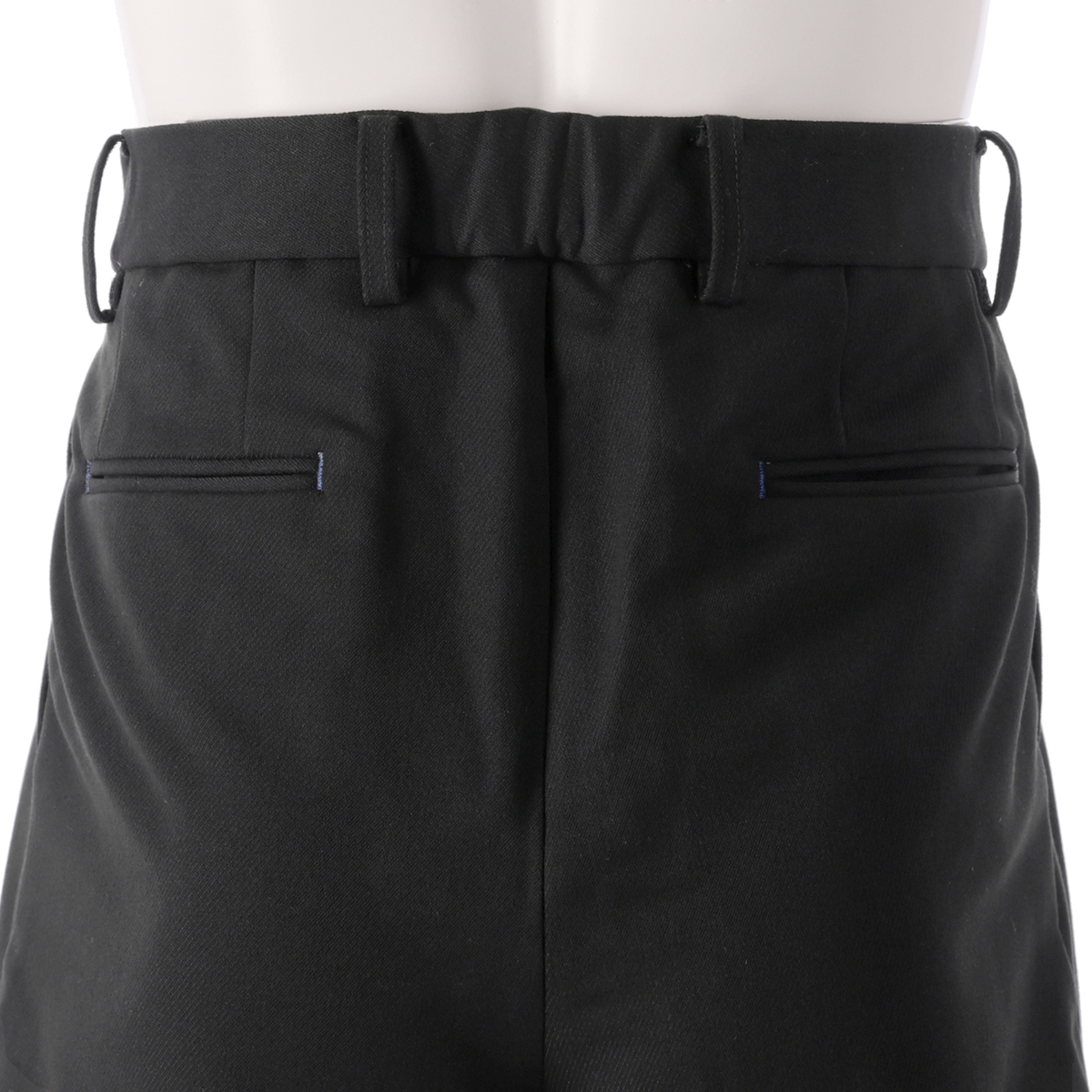 ウエストベルトは後ろ身頃側全体にゴムを使用し、ベルトループも付いています。マーベルト風仕立てで、ウエスト位置も穿き心地も安定。配色テープがアクセントを加えています