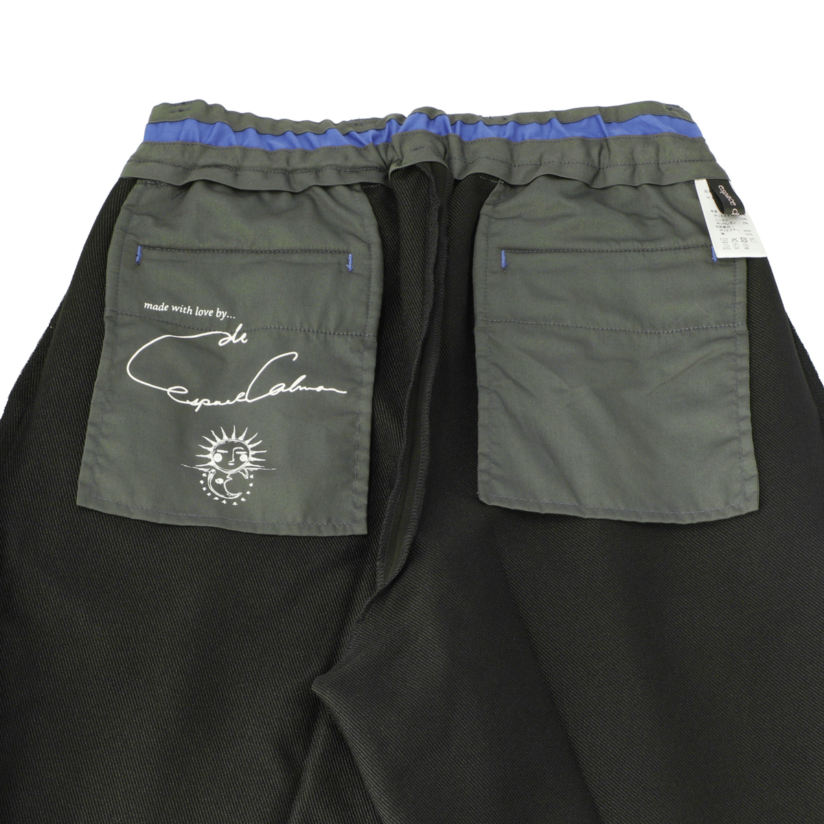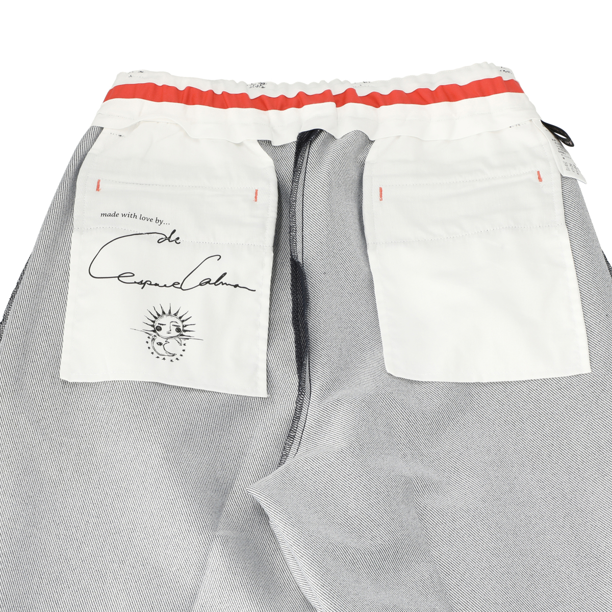 前身頃脇にはスラッシュポケット、後ろ身頃には本開きの両玉縁ポケットをデザイン。ポケット口には配色のカンヌキを施し、後ろポケット袋布には太陽と月のモチーフをラバープリント。ユニセックスで着用可能です