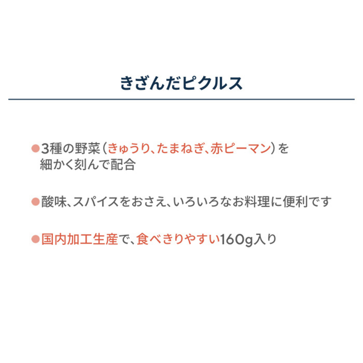 [アレルギー物質特定原材料8品目] なし [内容量] 160g×12瓶 [保存方法] 開封前:直射日光を避け、常温で保存してください 開封後:開栓後は冷蔵庫に保管しお早めにお召し上がりください [お召し上がり方] そのままお召し上がりいただけます [注意事項] ※開栓後は冷蔵庫に保管しお早めにお使いください ※びんはワレモノです。開栓にはご注意ください ※びんの底に微粉末のようなものがみられることがありますが、これは香辛料です [原料原産地] きゅうり(インド、国産)、たまねぎ(アメリカ)、赤ピーマン(チリ) [加工地] 日本 [原材料] きゅうり(インド、国産)、たまねぎ(アメリカ)、赤ピーマン(チリ)、漬け原材料(砂糖、醸造酢、食塩、香辛料)/増粘剤(キサンタン)、香辛料抽出物、ウコン色素、塩化Ca
