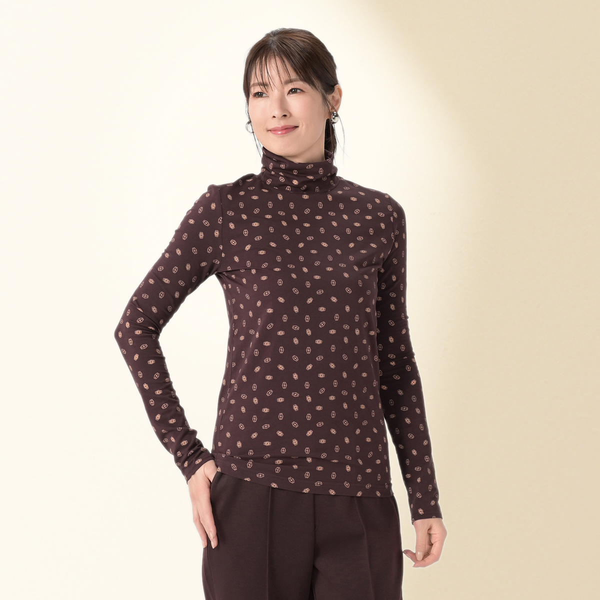 さりげないプリント柄がおしゃれな長袖ハイネックTシャツ。毛羽を抑えたクリアーベア天竺を使用しました