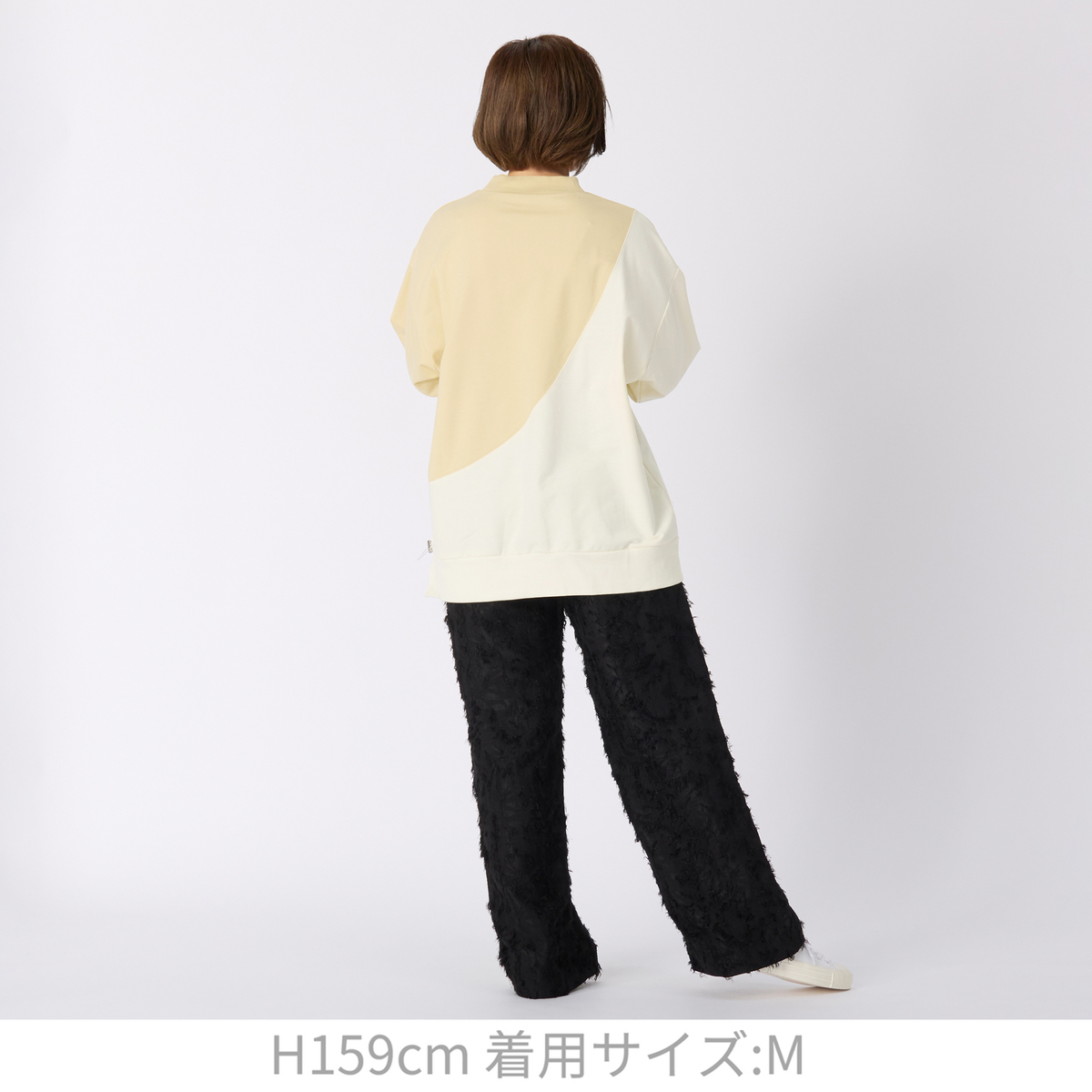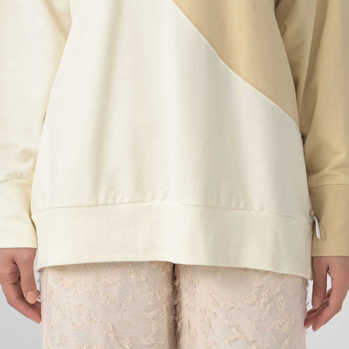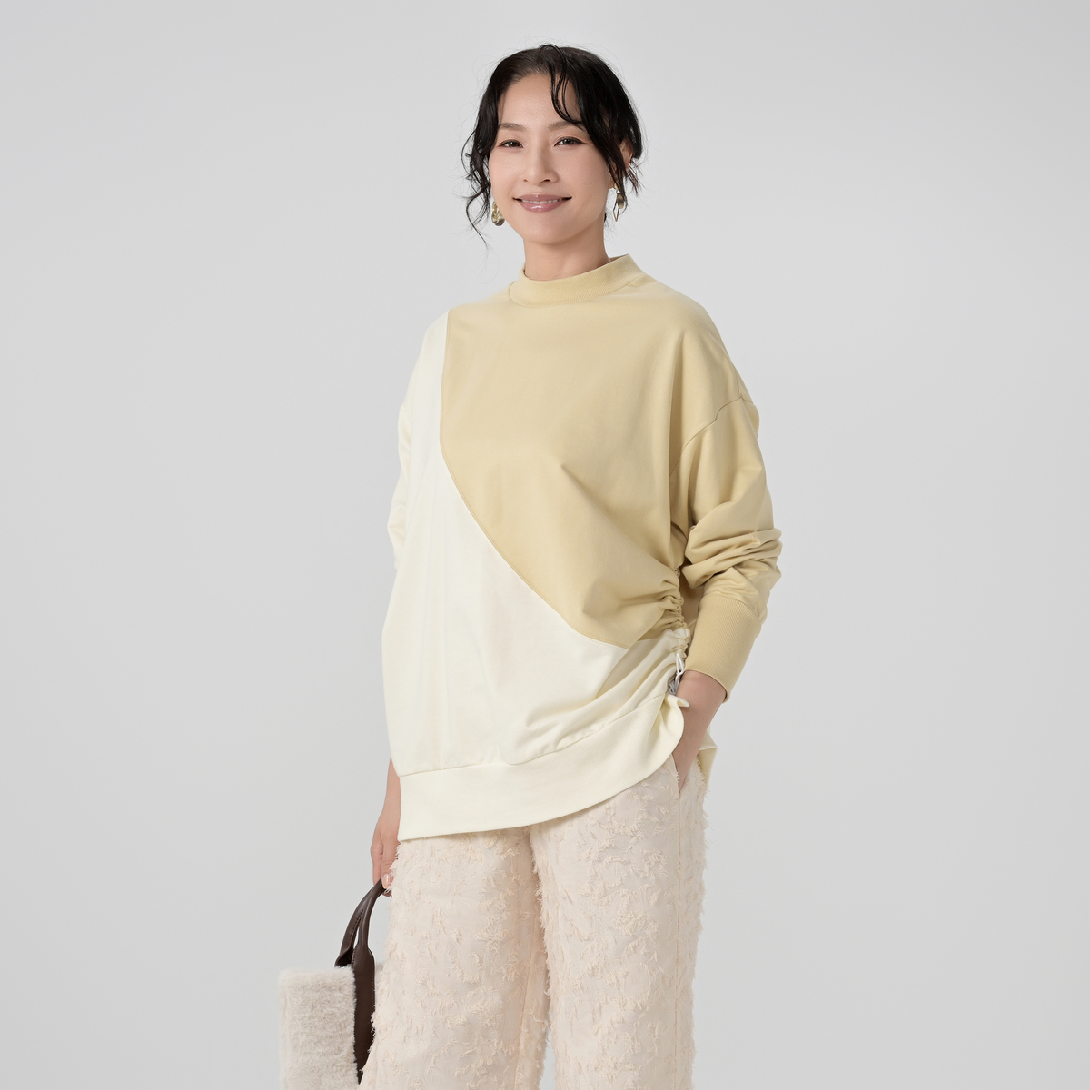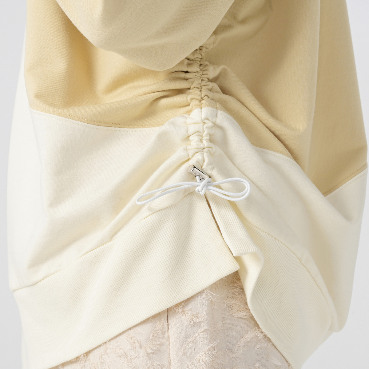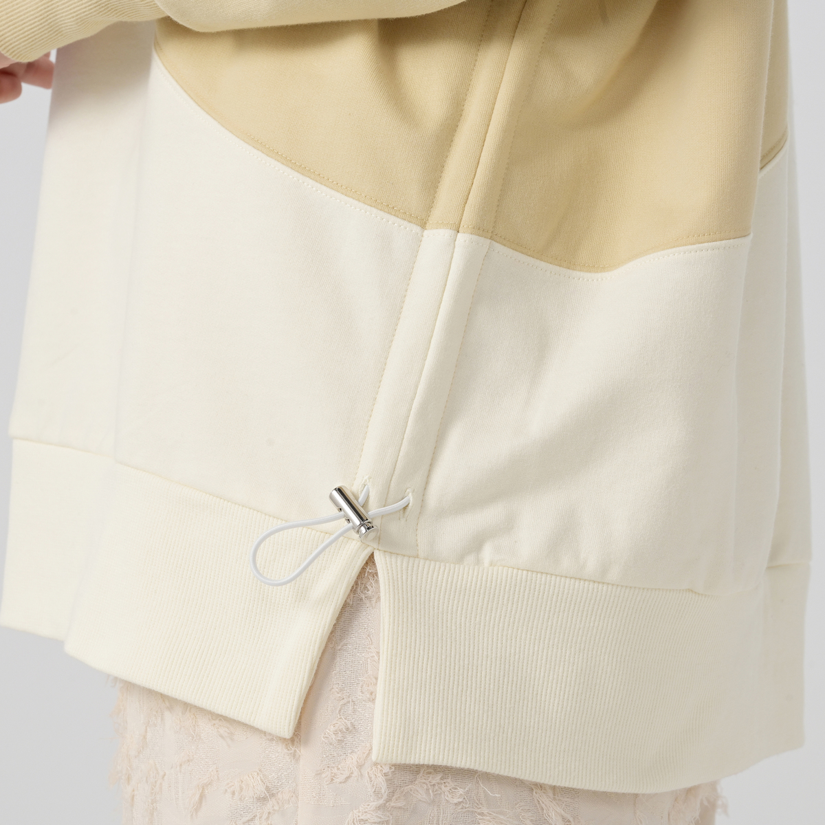 インレイ素材で仕上げたプルオーバー。大胆な配色が魅力で、主役級の存在感に。左脇のドロストで、表情を変えることもできます