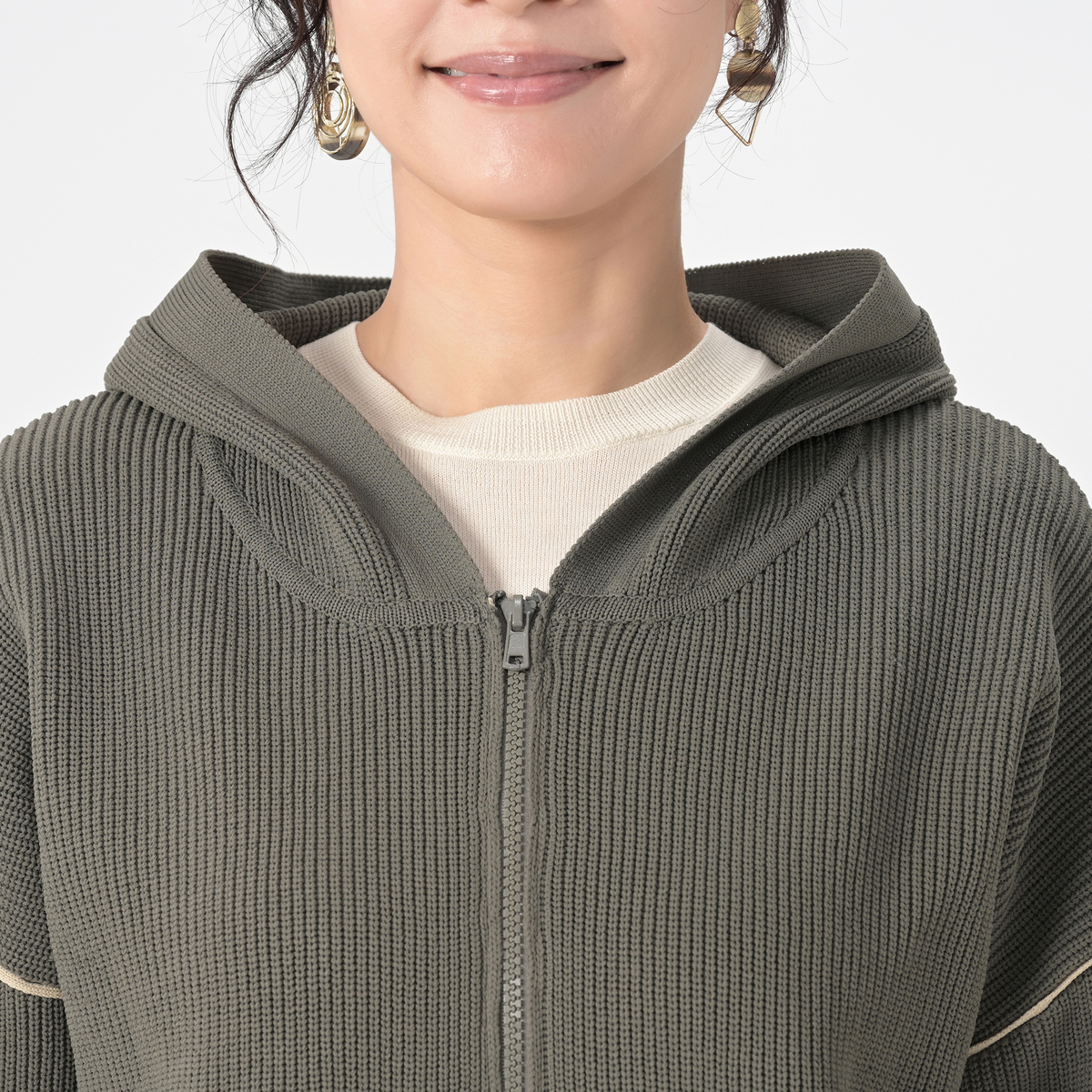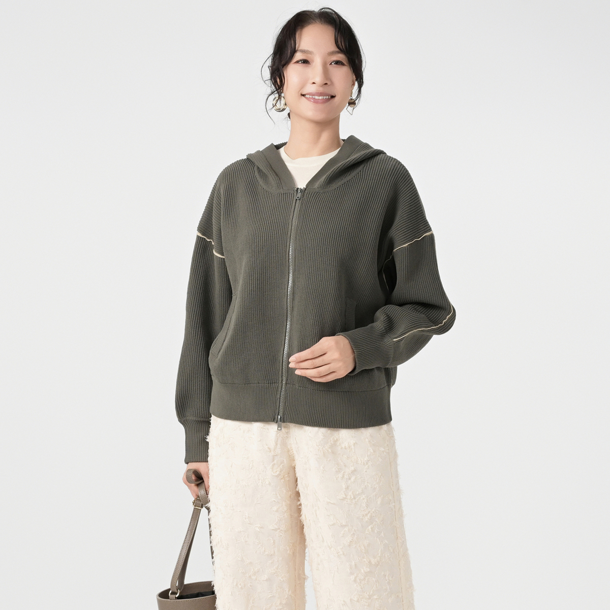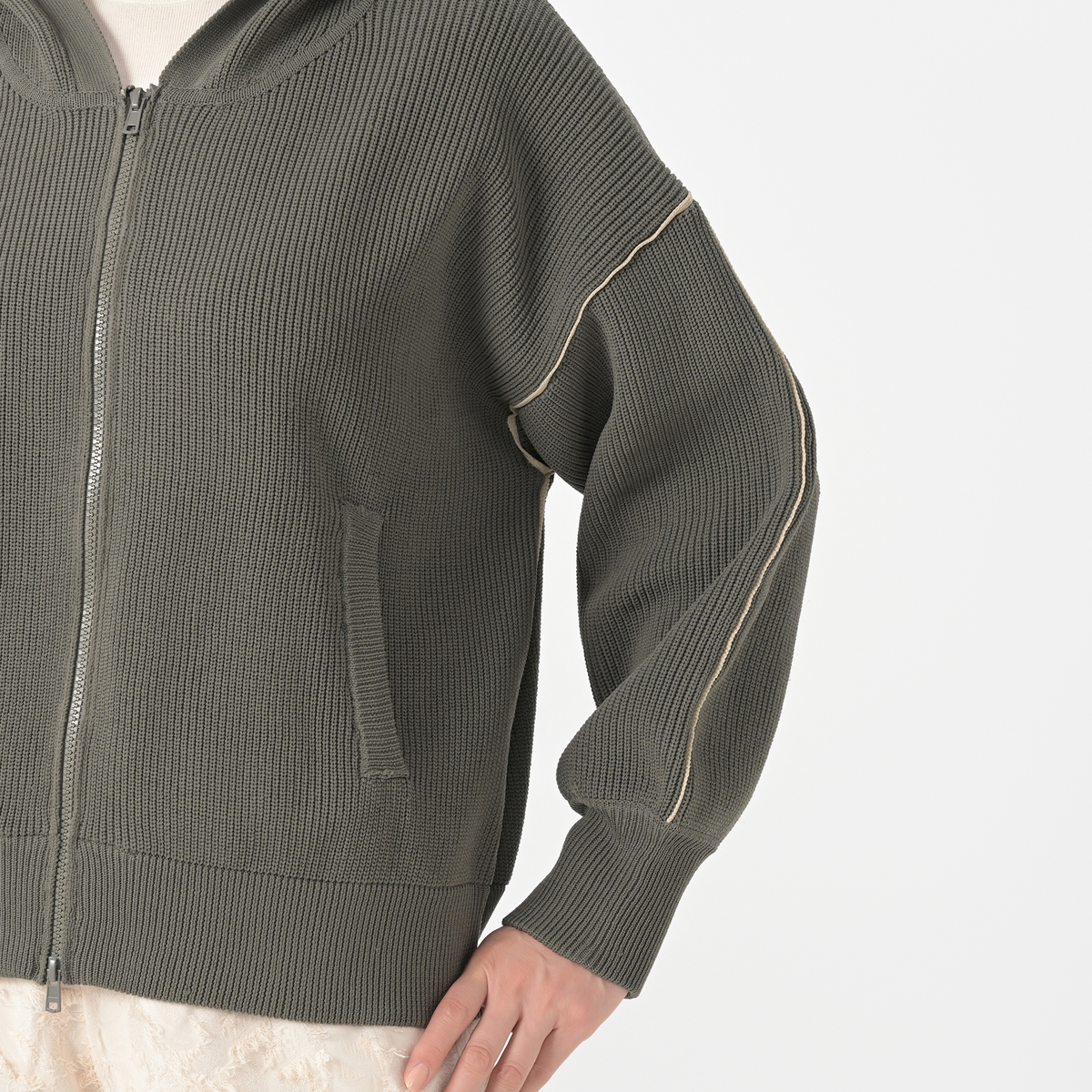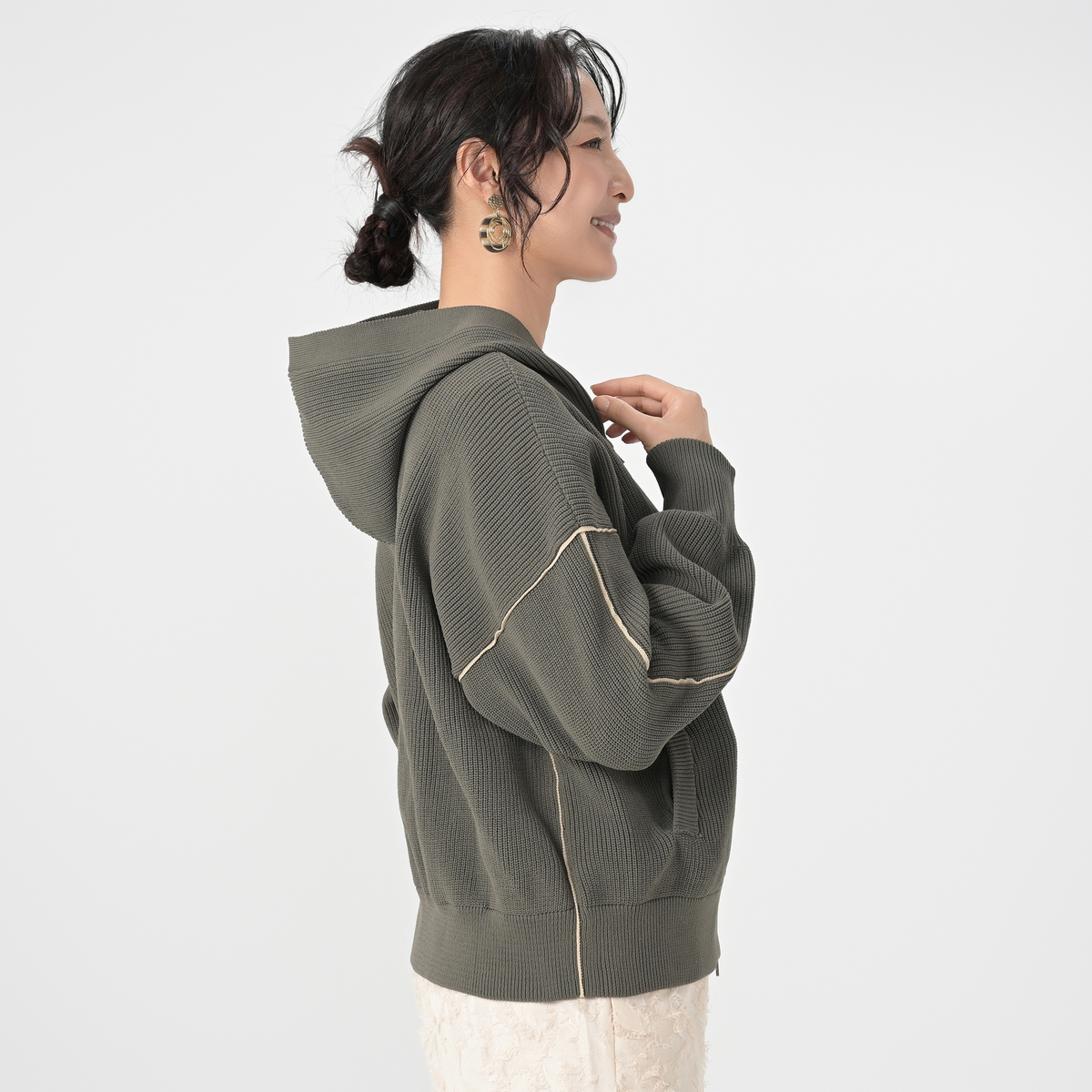 サッと羽織るだけで洗練されたスタイリングがきまる、ニットパーカーブルゾン。脇や袖に入れたリサイクル糸のラインが効いた、さりげないお洒落感溢れるデザインです。ダブルファスナーがこなれ感ある着こなしを叶え、自由に表情変化を楽しめます
