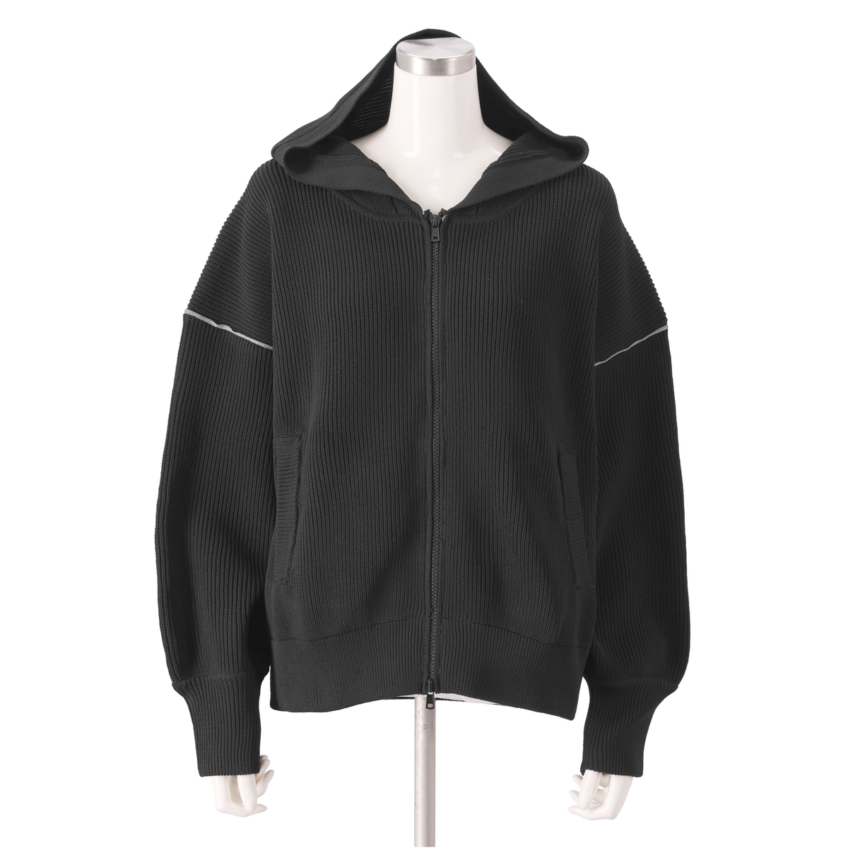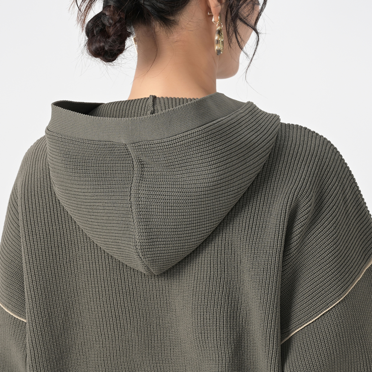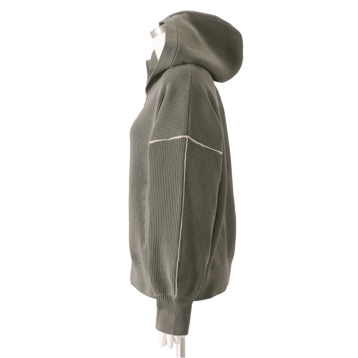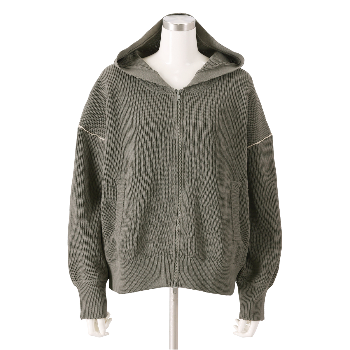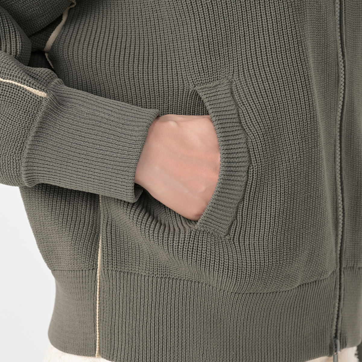 サッと羽織るだけで洗練されたスタイリングがきまる、ニットパーカーブルゾン。脇や袖に入れたリサイクル糸のラインが効いた、さりげないお洒落感溢れるデザインです。ダブルファスナーがこなれ感ある着こなしを叶え、自由に表情変化を楽しめます