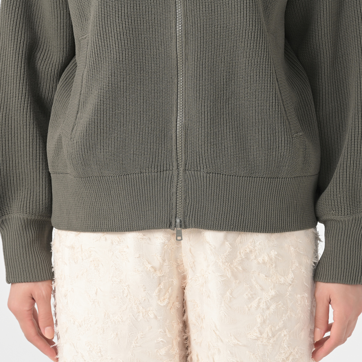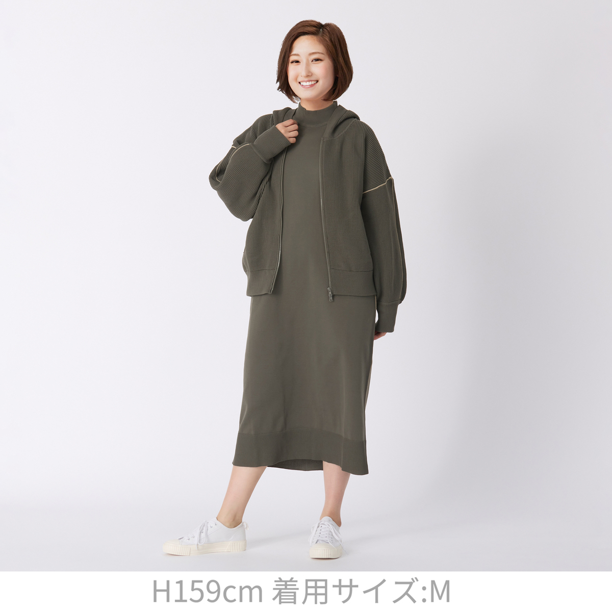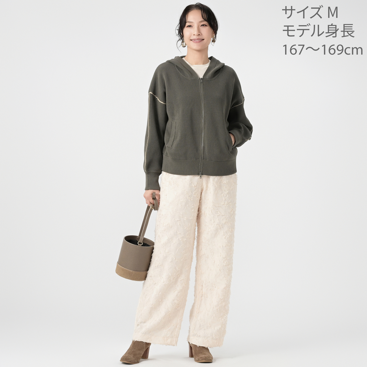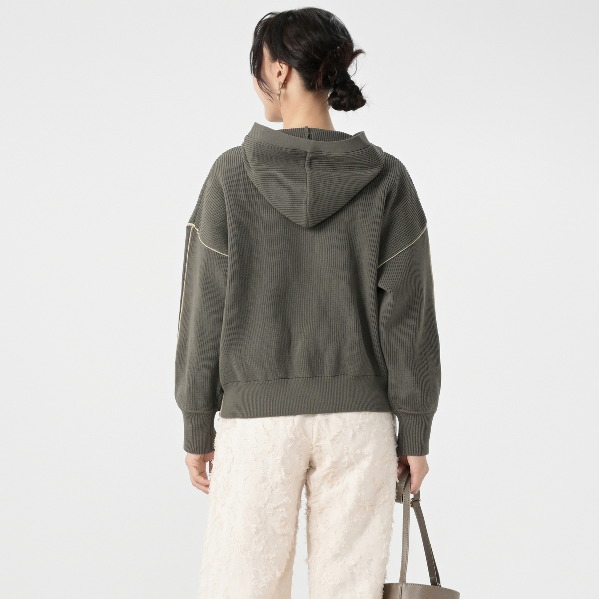 サッと羽織るだけで洗練されたスタイリングがきまる、ニットパーカーブルゾン。脇や袖に入れたリサイクル糸のラインが効いた、さりげないお洒落感溢れるデザインです。ダブルファスナーがこなれ感ある着こなしを叶え、自由に表情変化を楽しめます