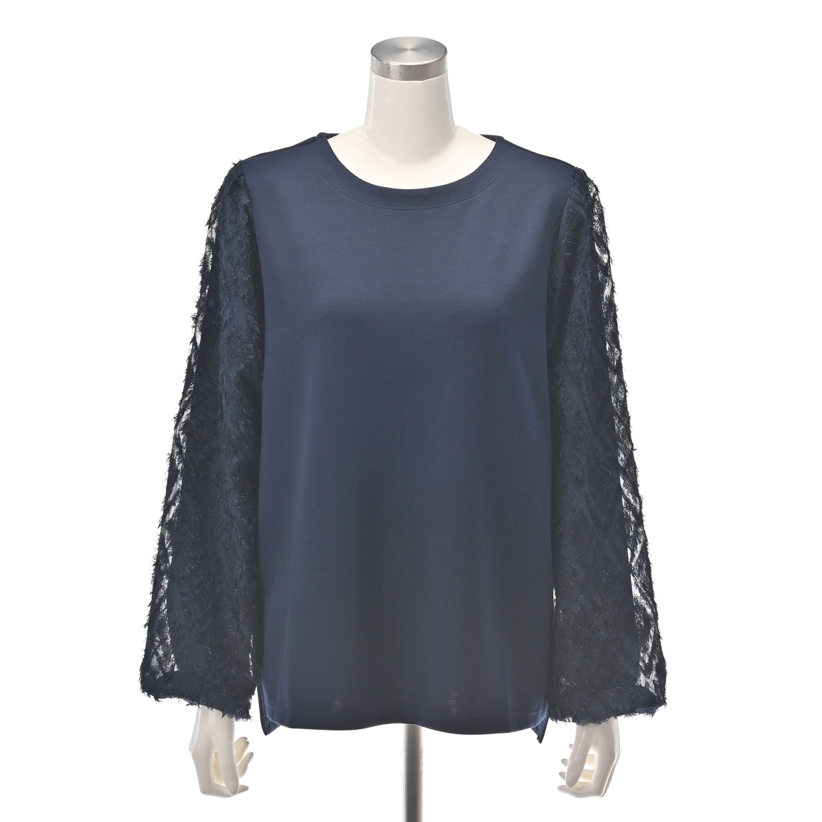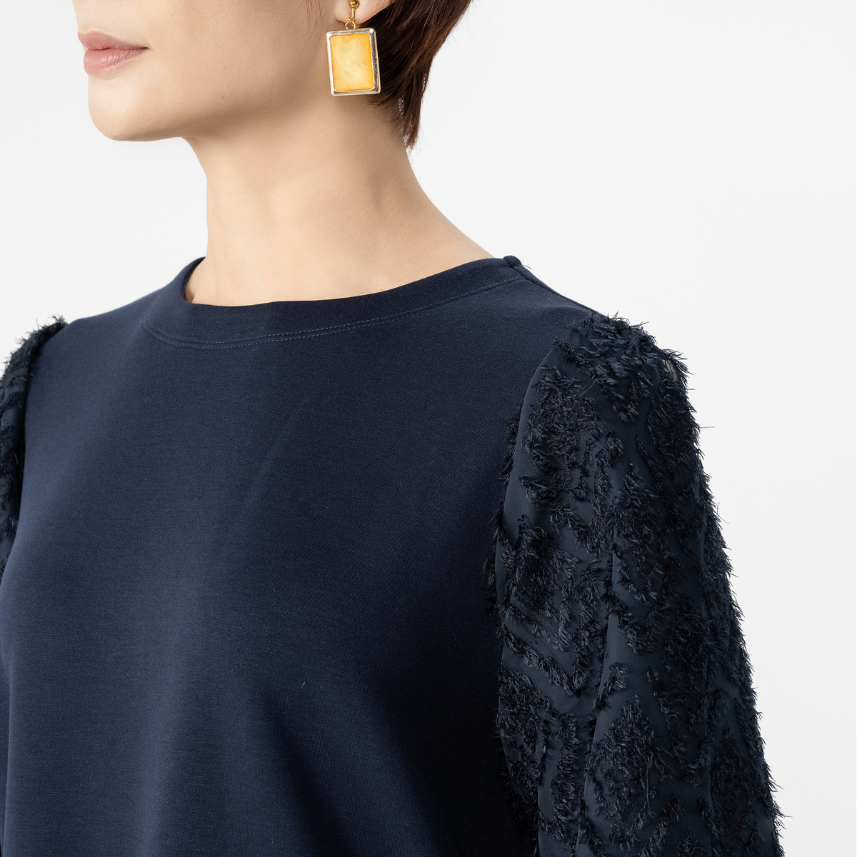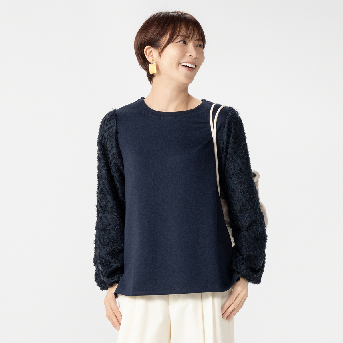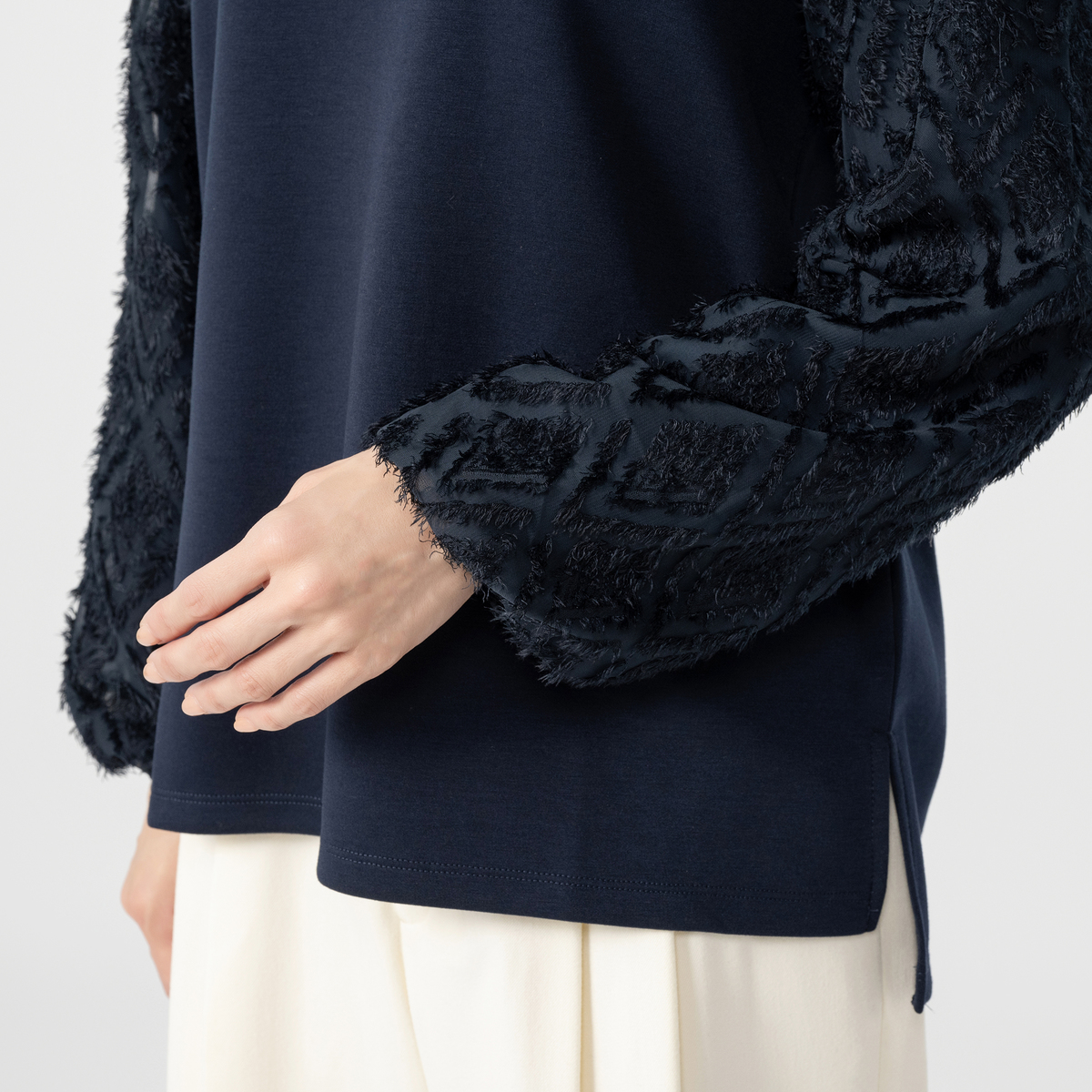 スタイリッシュな異素材使いのプルオーバー。コーデを華やかに彩るジャカード柄シャギーの袖がポイントです。袖は二重構造で透けにくい仕様です