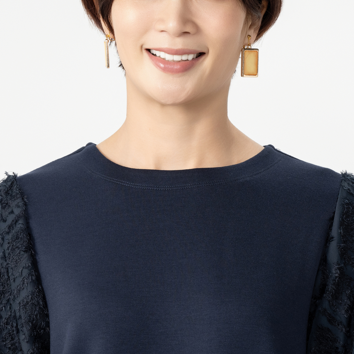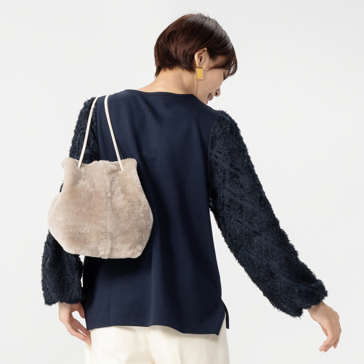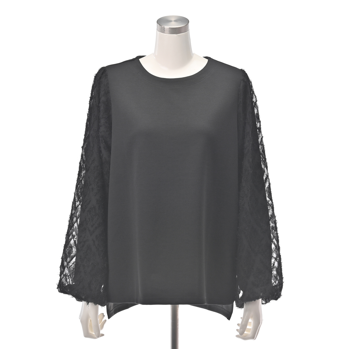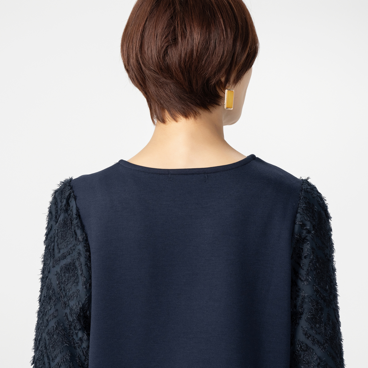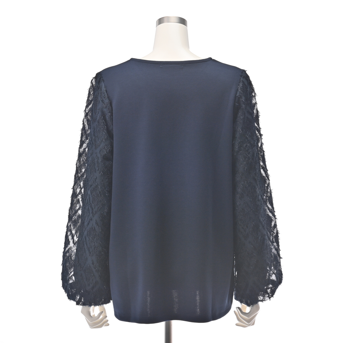 スタイリッシュな異素材使いのプルオーバー。コーデを華やかに彩るジャカード柄シャギーの袖がポイントです。袖は二重構造で透けにくい仕様です