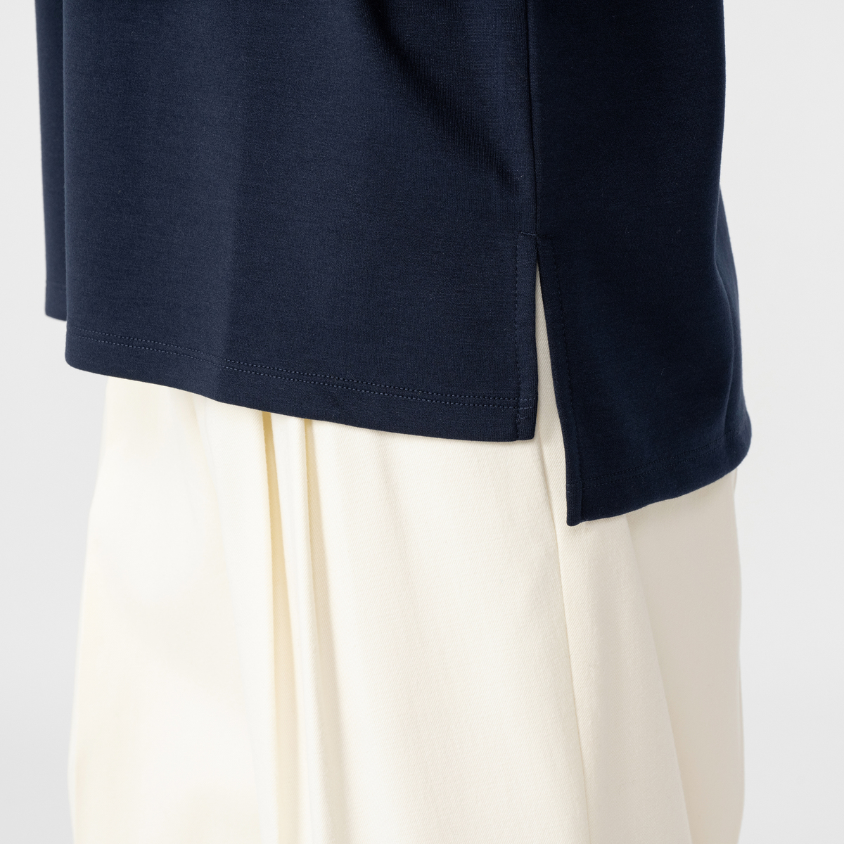 身頃は軽やかなダンボール素材を使用。ゆったりとしたシルエットで、リラックス感のある着心地です。丈はやや長めでサイドスリットを施し、前だけボトムインしたスタイリングも楽しめます
