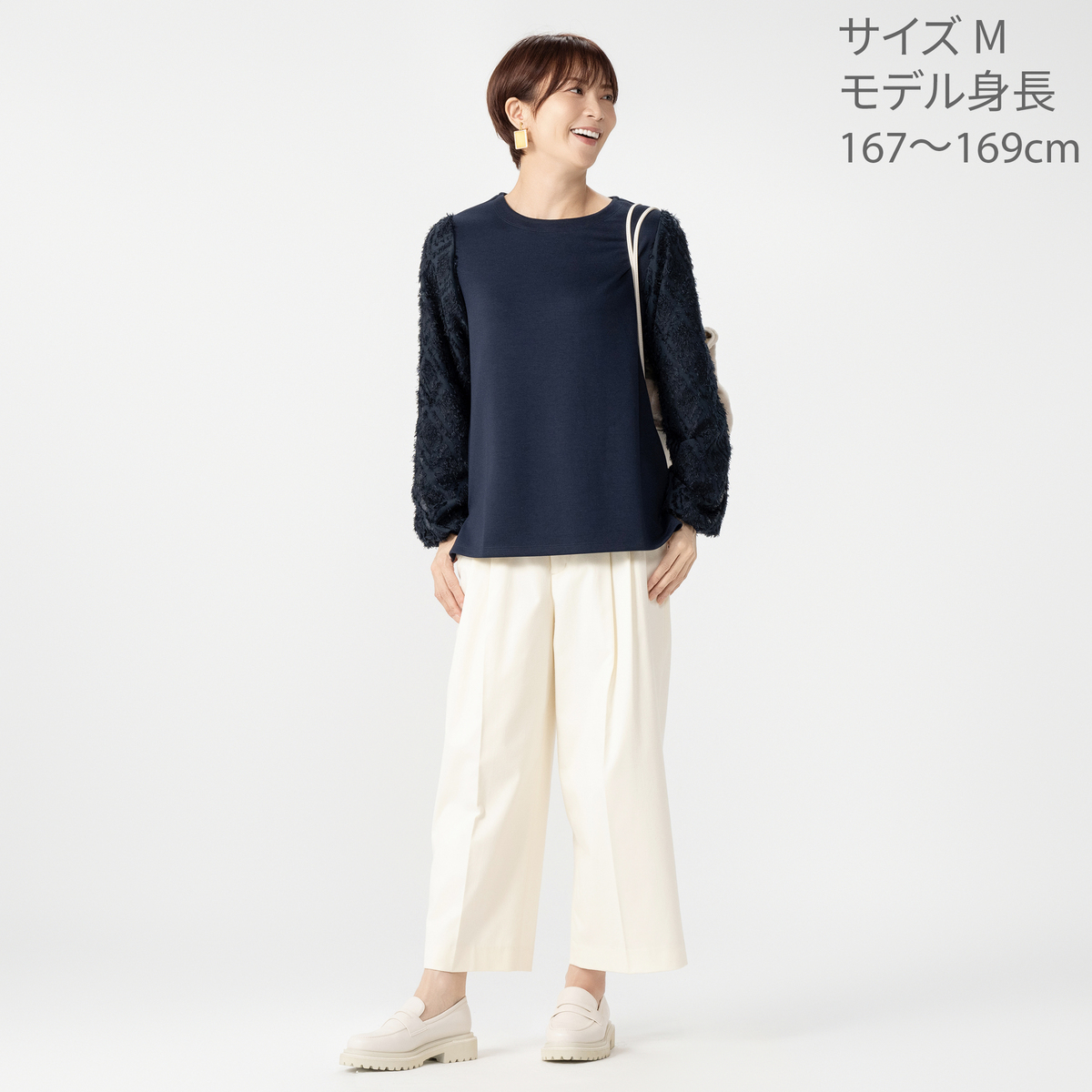 色を決められずブラック・ネイビーSどちらも取り寄せました。ちょっとした外出にも使えるかと楽しみにしていました。身ごろは手触りもよくしっとりとしています。残念なのは袖。袖のシャギーが安っぽい。糸くずが付いているような感じでもっと張りのある素材だったらよかったのに。
