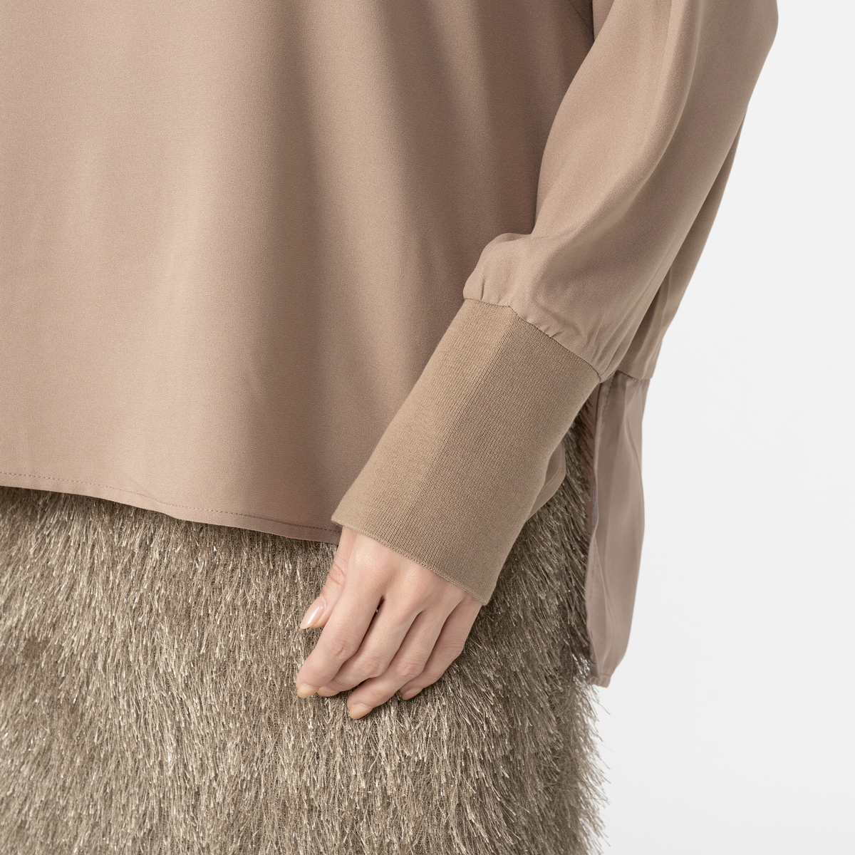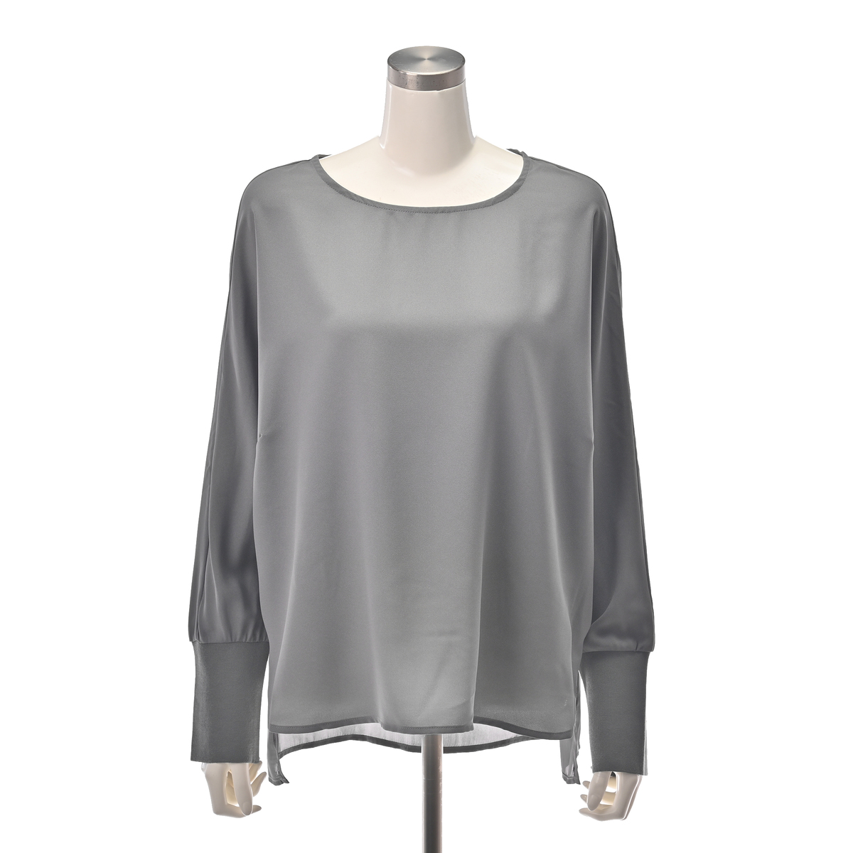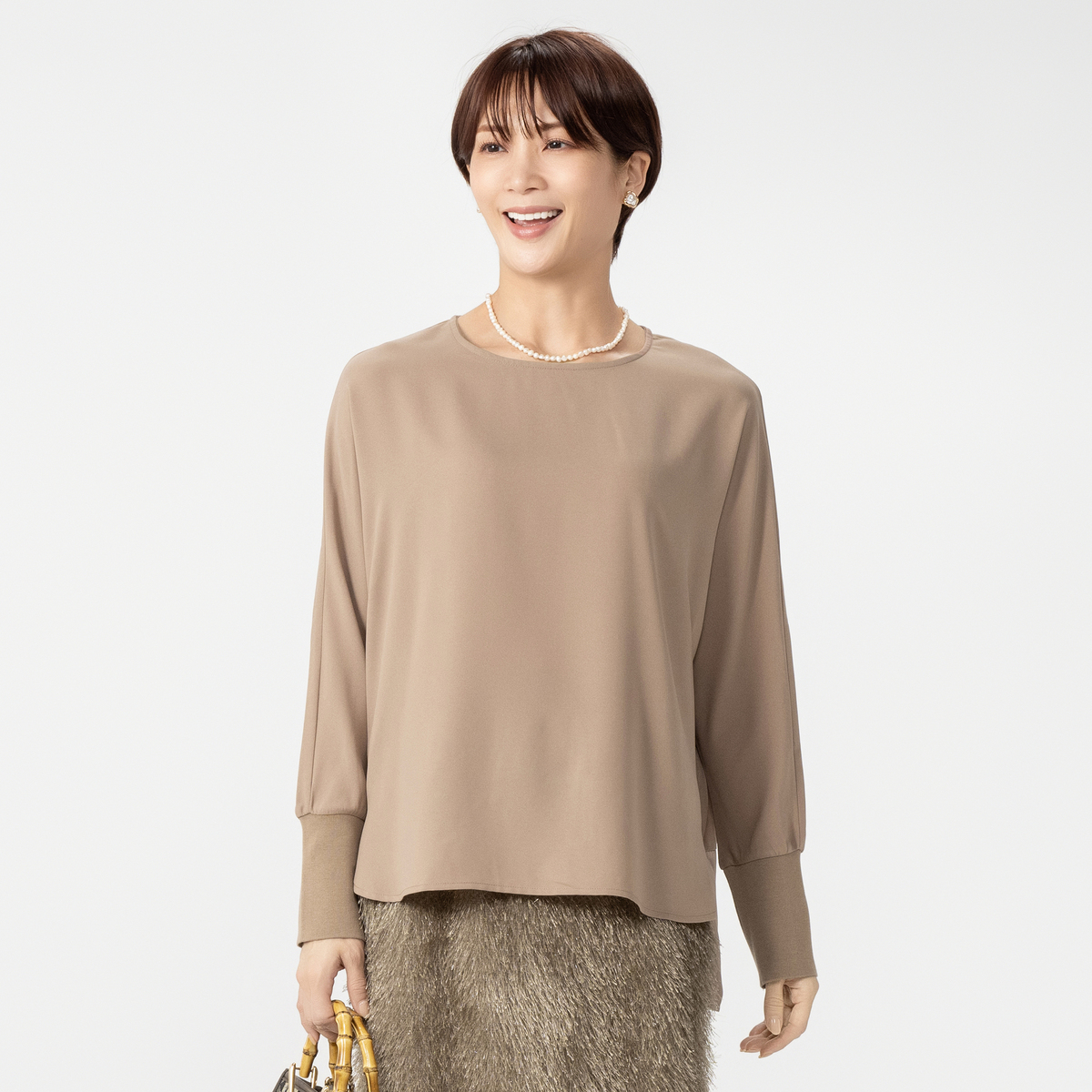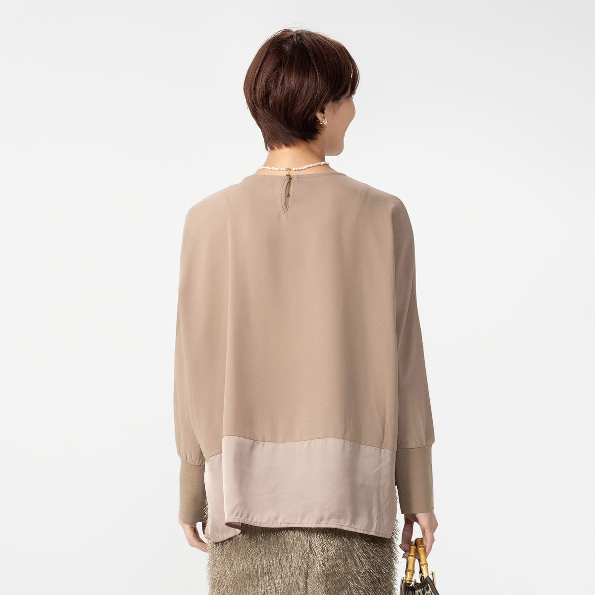 梨地素材で仕立てたエレガントなブラウス。袖に長めのリブをあしらい、裾は光沢感のある素材で切替えを施しました。シンプルながらも洗練されたデザインで上品に着こなせます