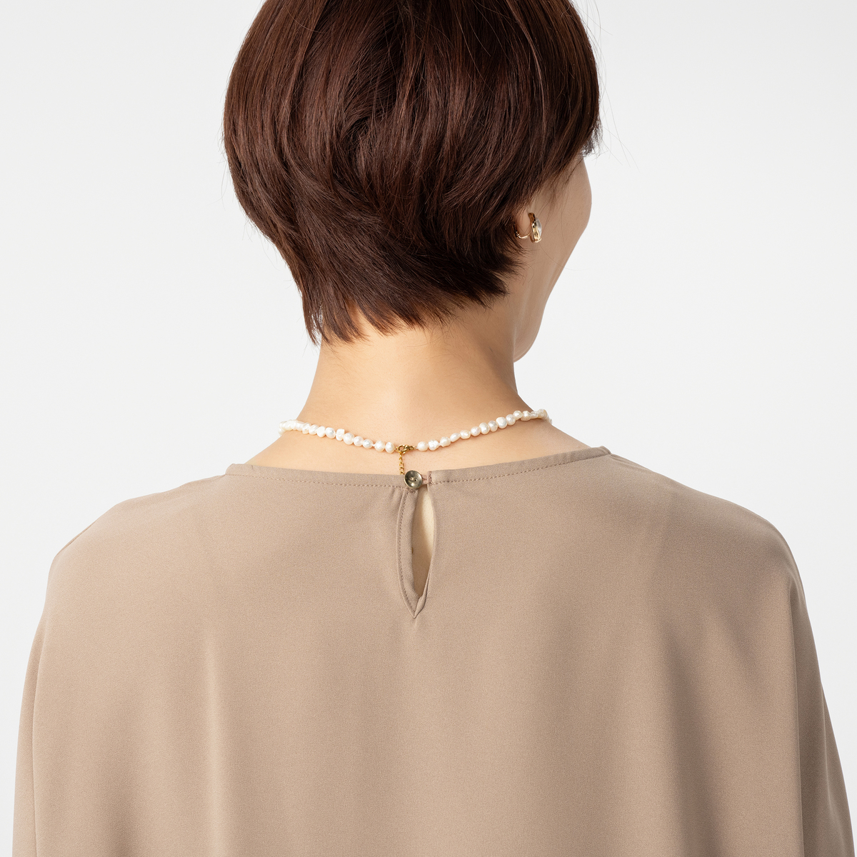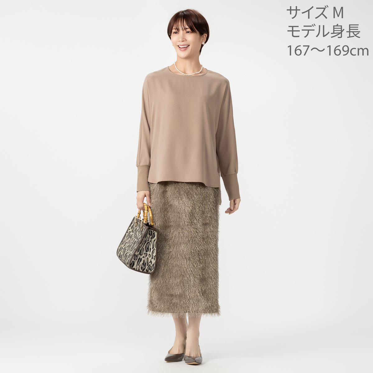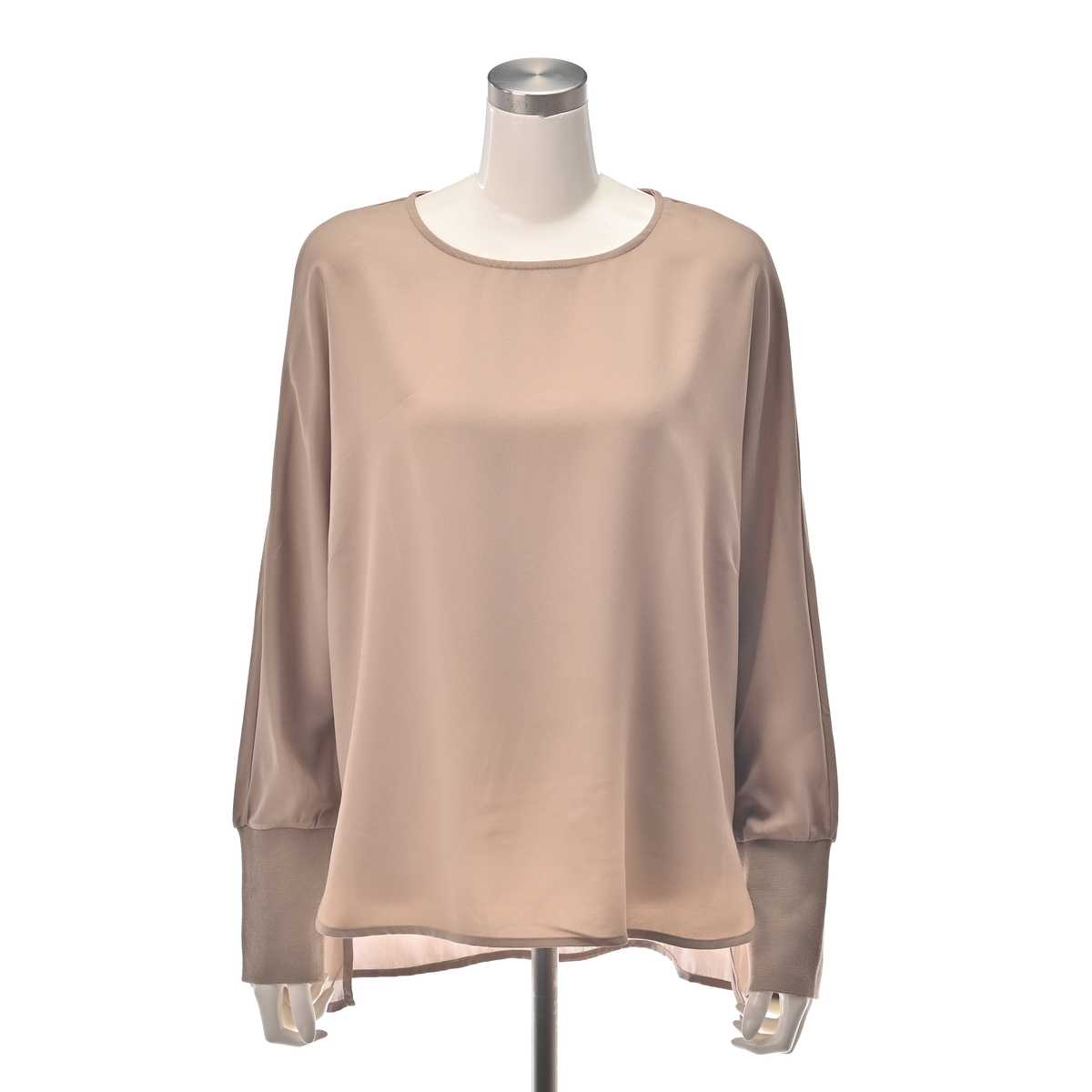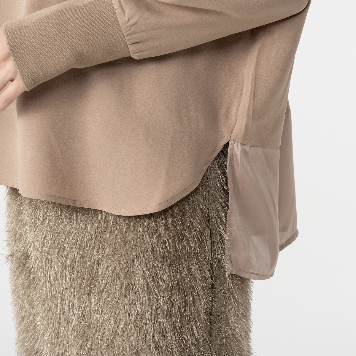 梨地素材で仕立てたエレガントなブラウス。袖に長めのリブをあしらい、裾は光沢感のある素材で切替えを施しました。シンプルながらも洗練されたデザインで上品に着こなせます