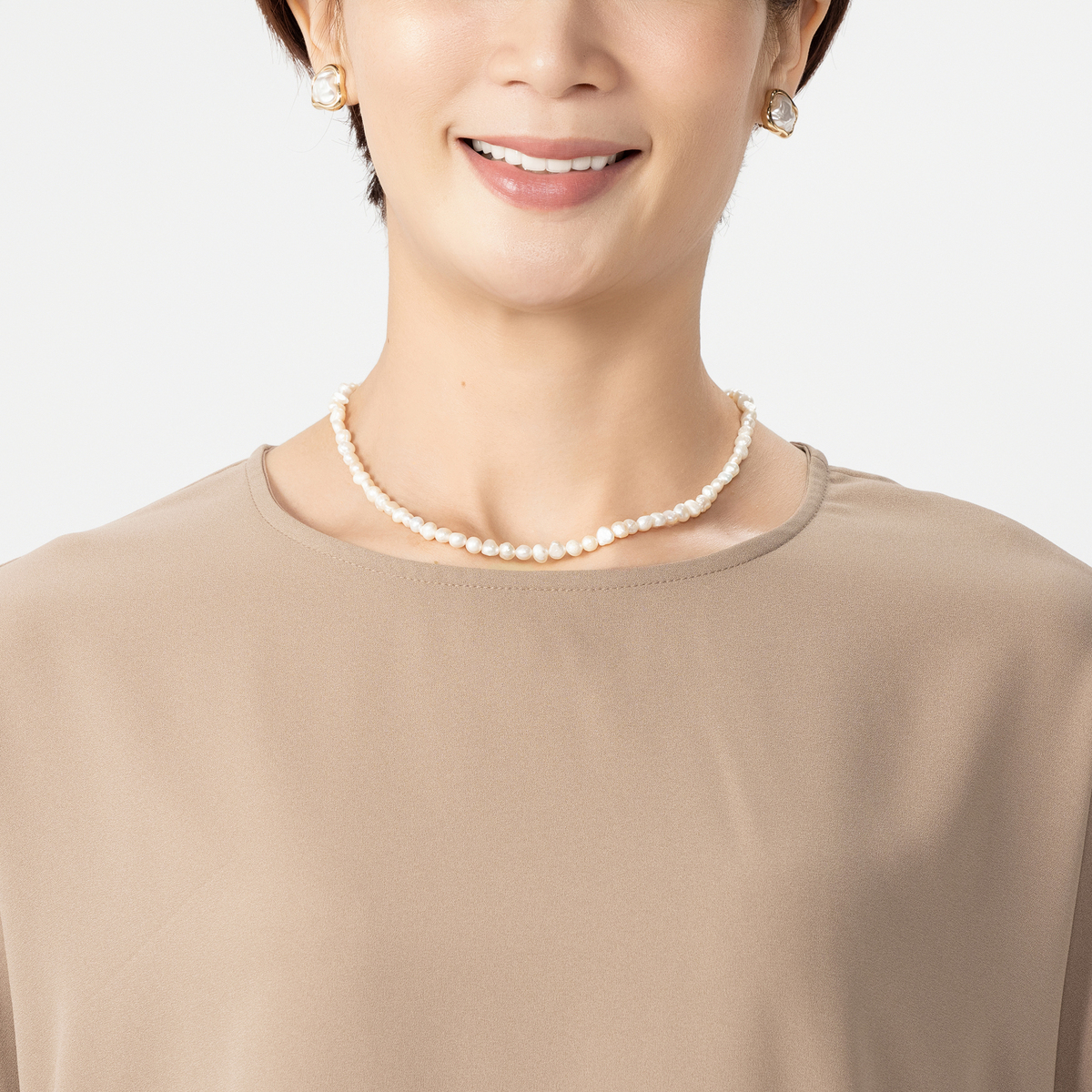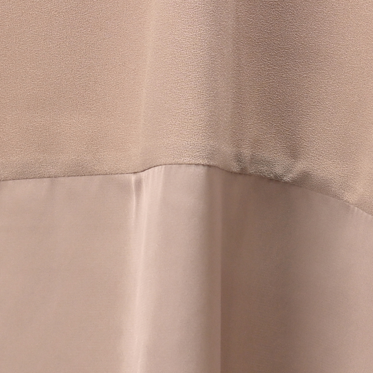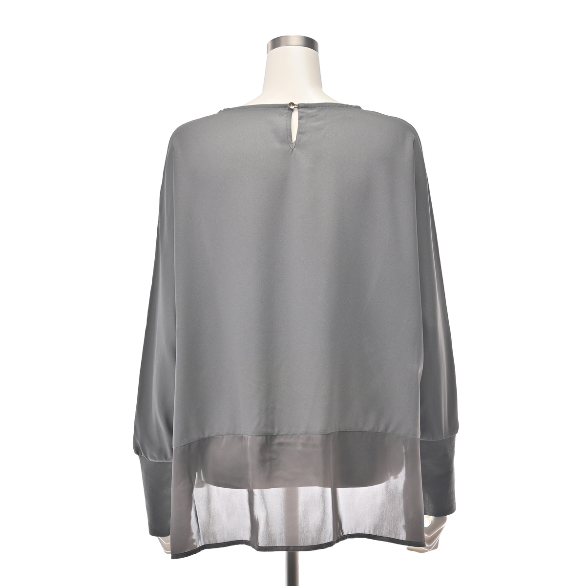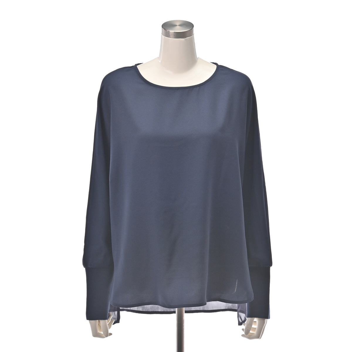 梨地素材で仕立てたエレガントなブラウス。袖に長めのリブをあしらい、裾は光沢感のある素材で切替えを施しました。シンプルながらも洗練されたデザインで上品に着こなせます