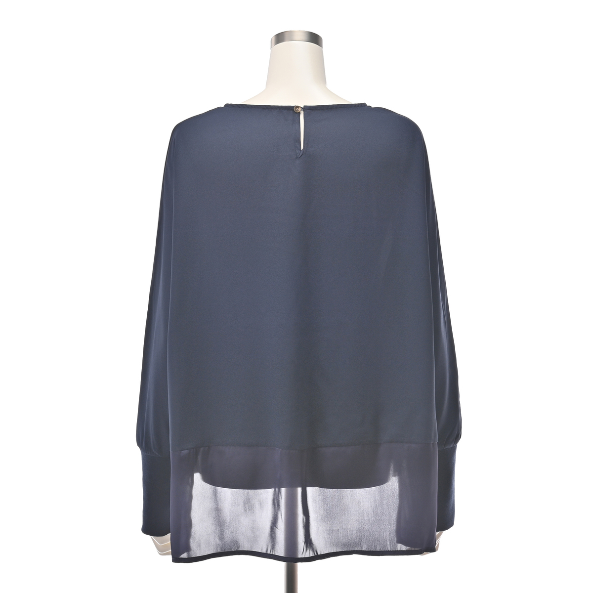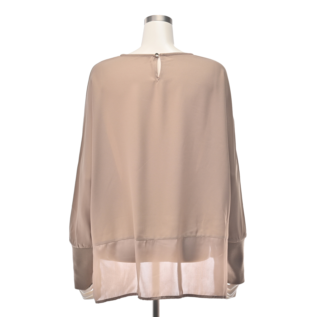 ドルマンで袖口の感じが良いです。梨地ジョーゼットがややペラペラな感じ、濃色の方が良いのかもしれません。サイズはMでゆとりもあり着用時期には重宝するかもしれません。