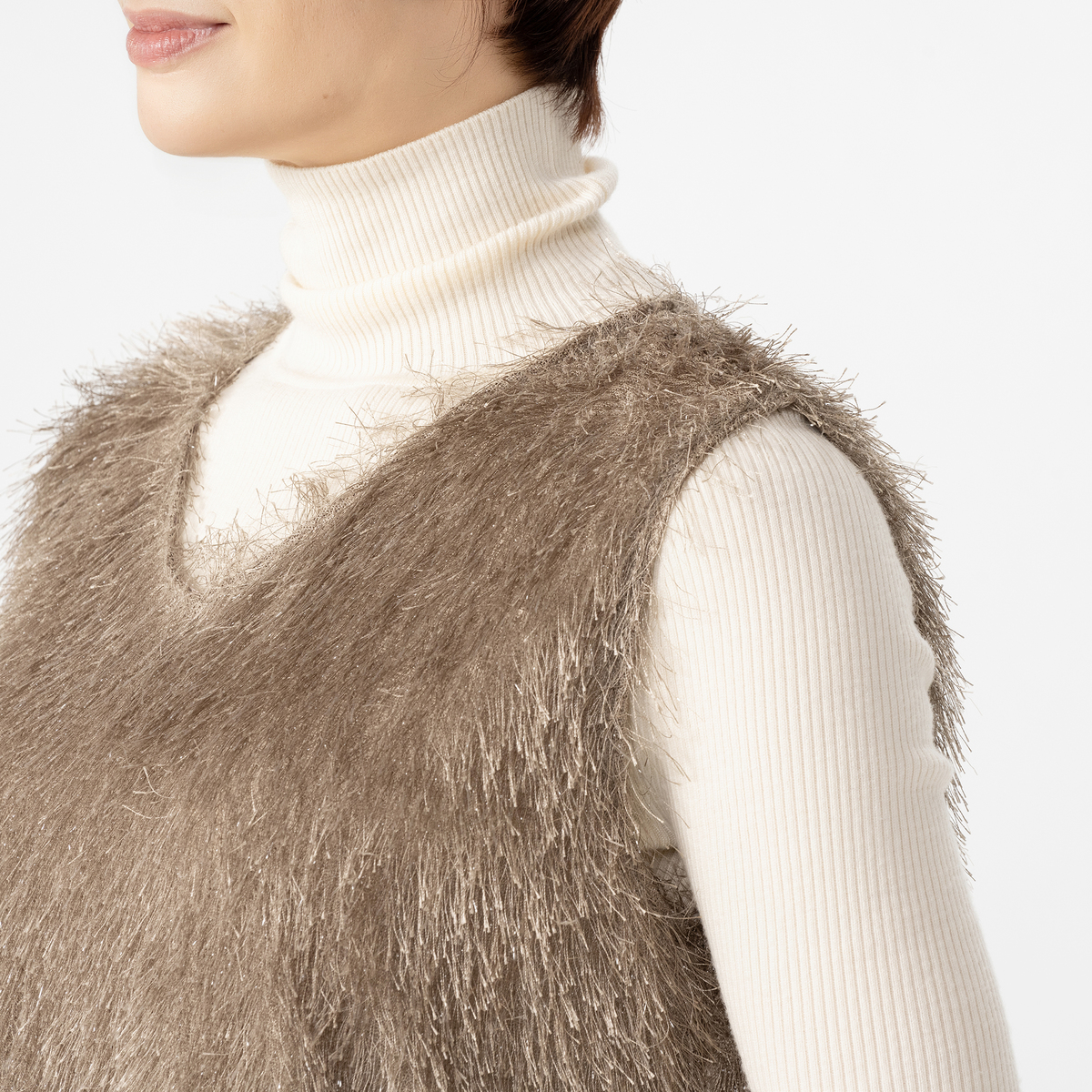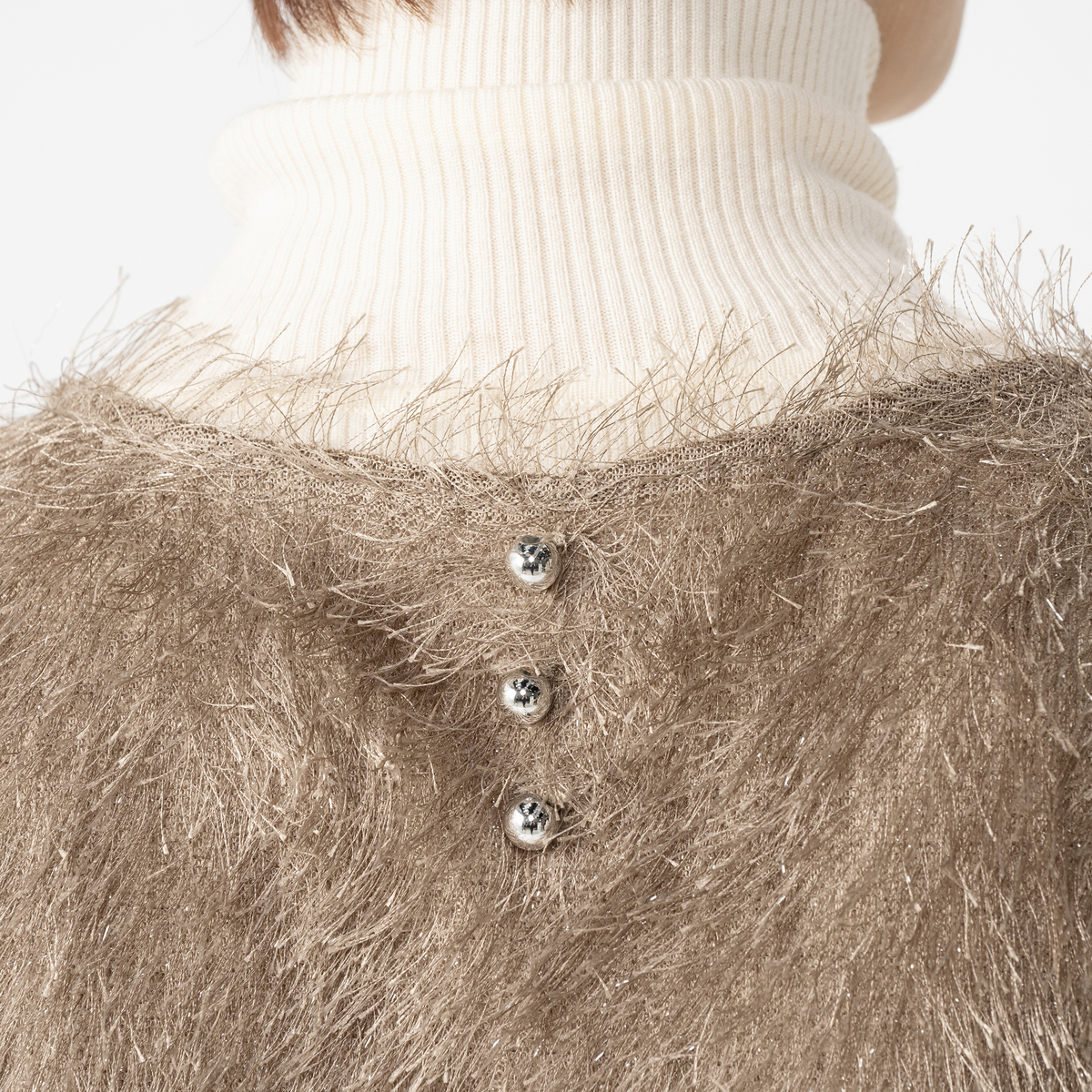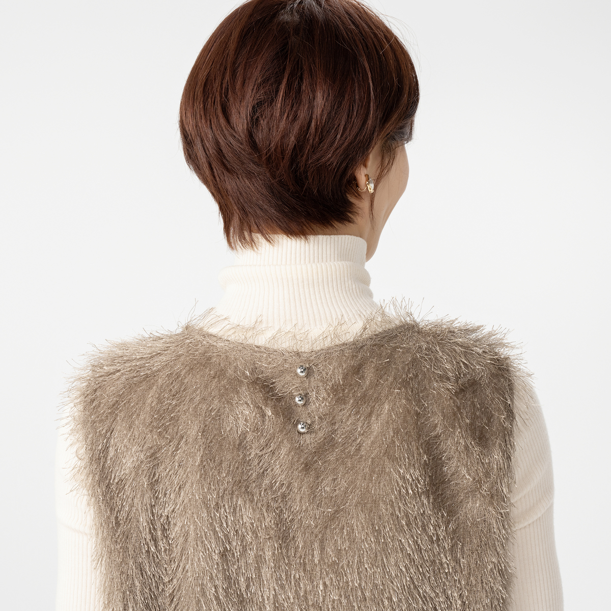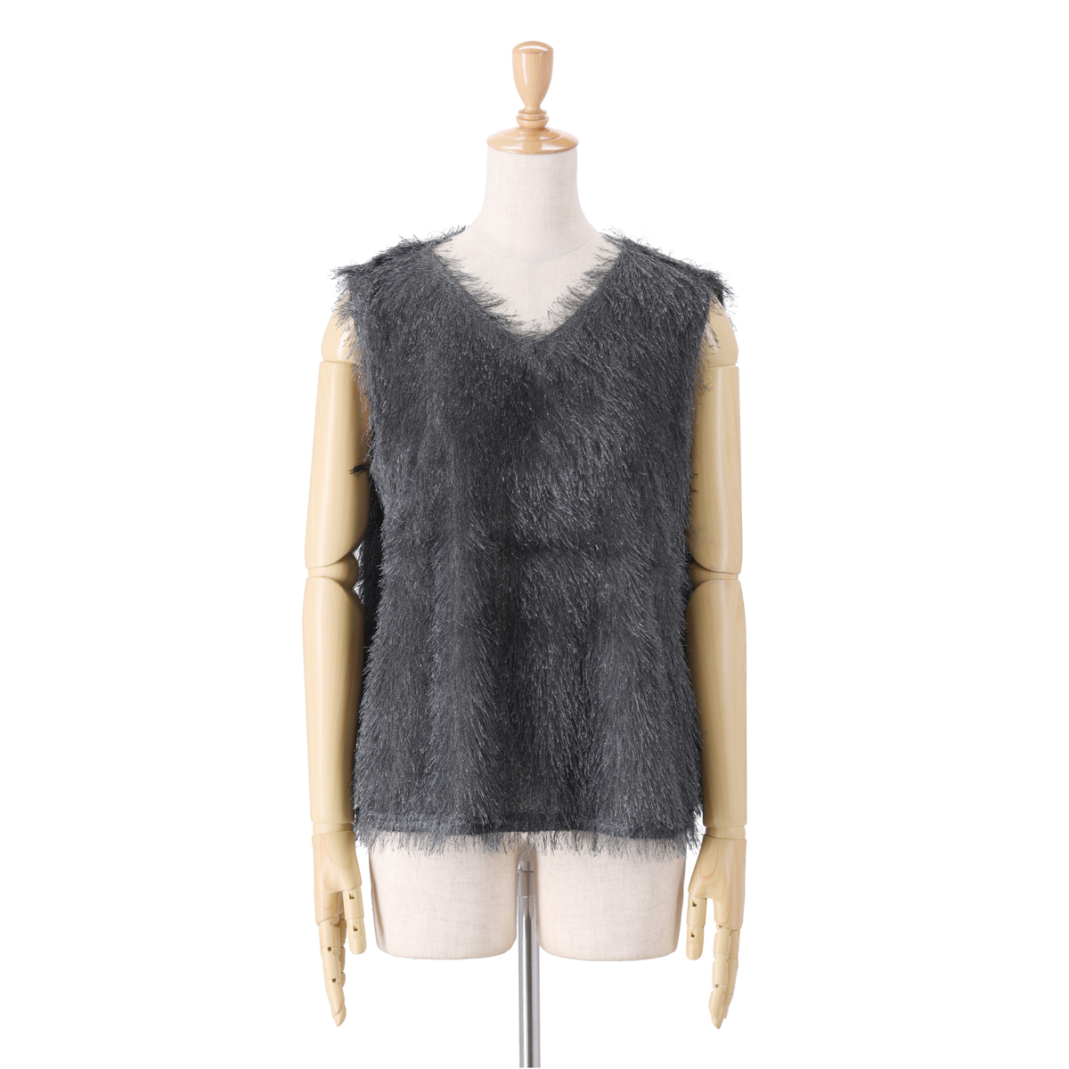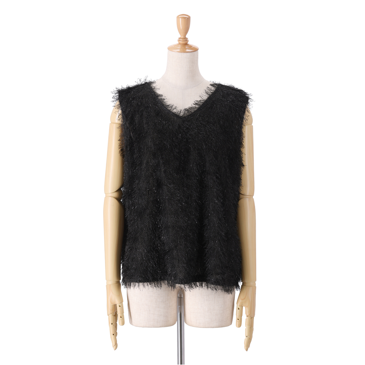キラキラしたラメフリンジ素材を使った、ノースリーブプルオーバー。Tシャツに合わせてカジュアルに、キレイめなシャツと合わせればドレッシーな表情で着こなせる、華やかでコーデの幅が広がるアイテムです