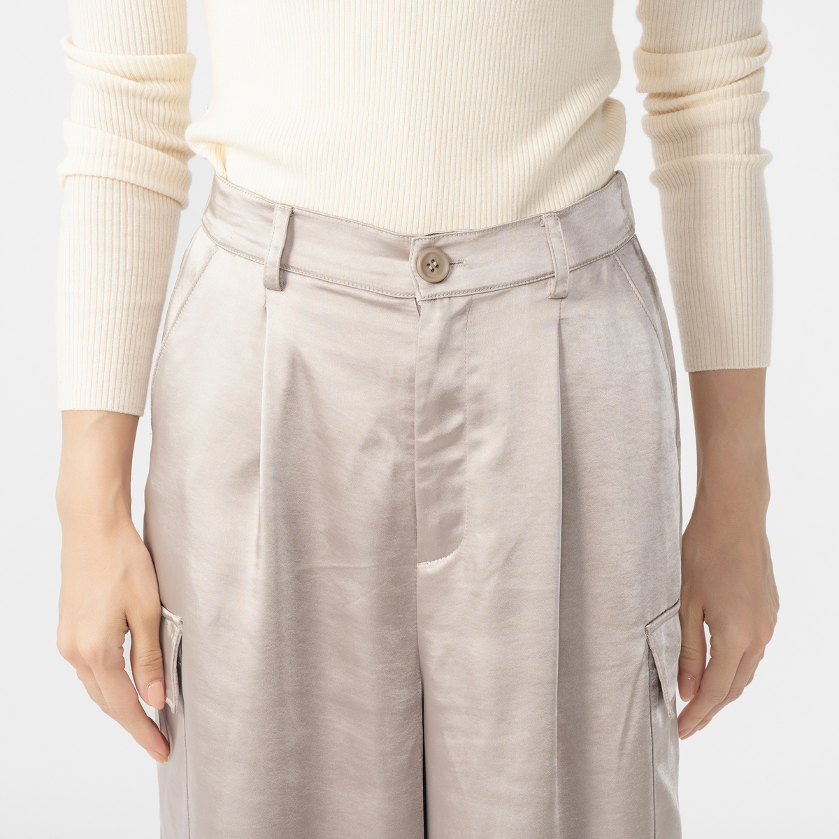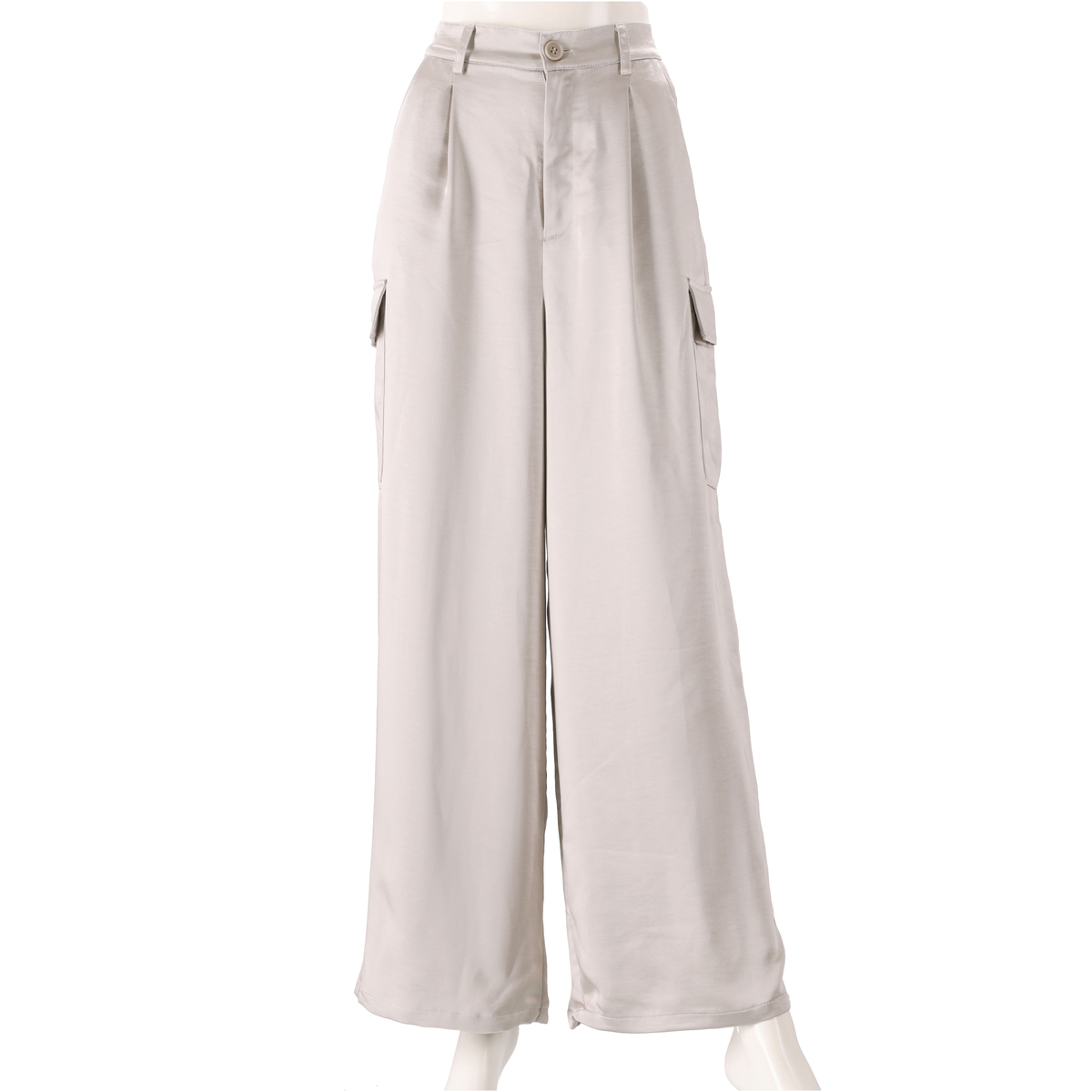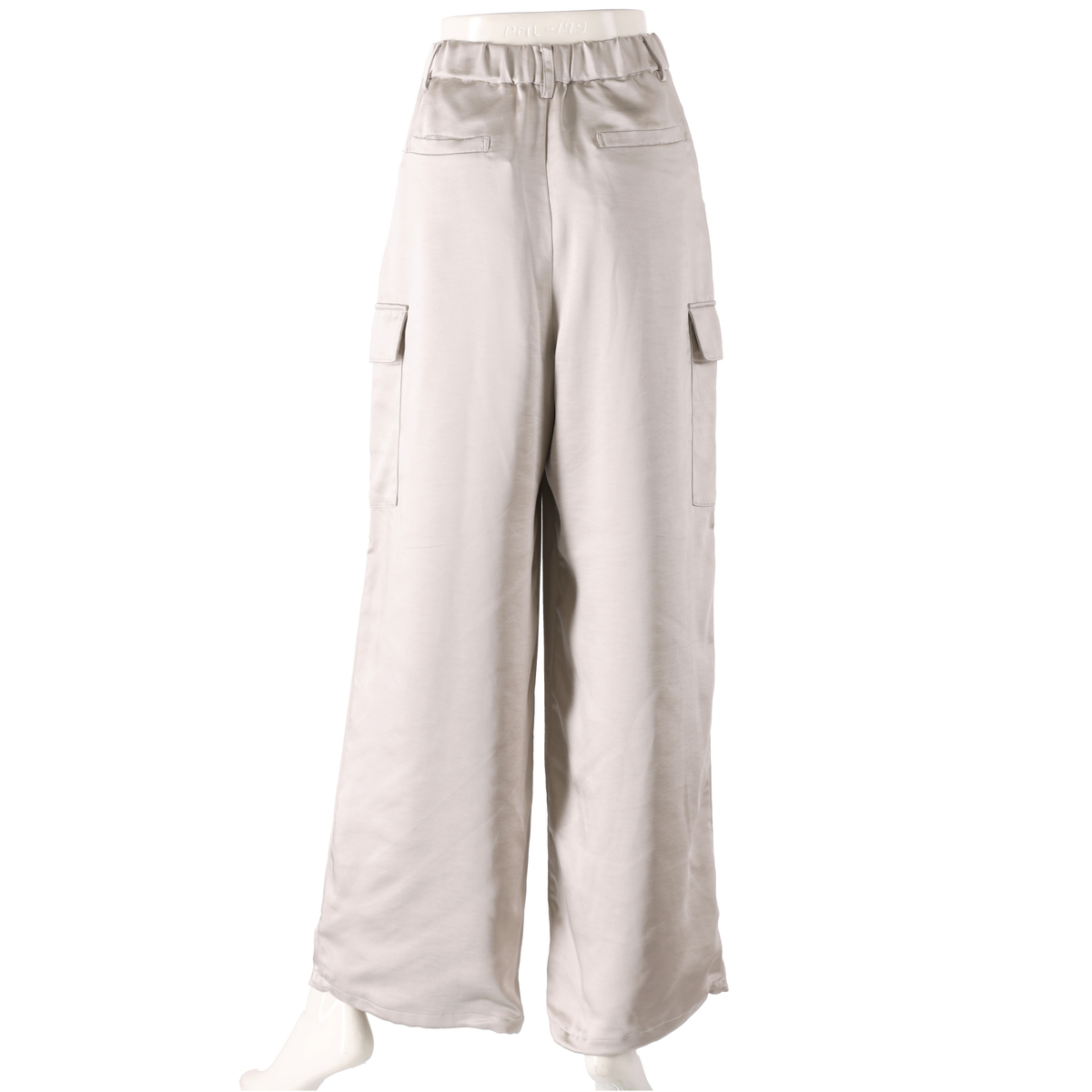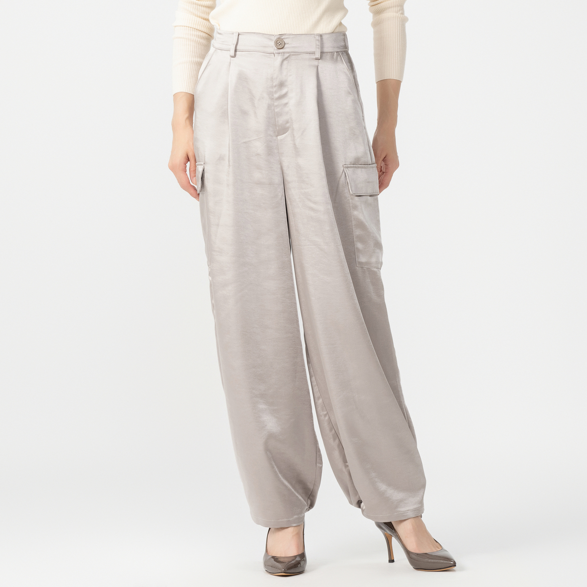 きれいめなサテン素材を使用したカーゴパンツ。カジュアル感のあるデザインときれいめ素材とのミスマッチが旬なデザインです。後ろ裾にあるコールゴムを絞ることで、カジュアルにもお楽しみいただけます