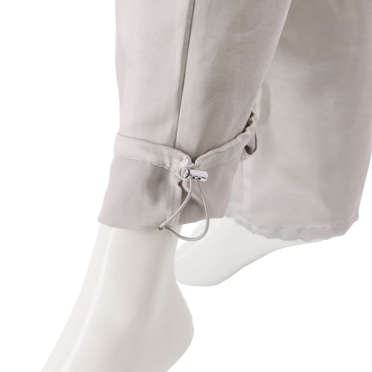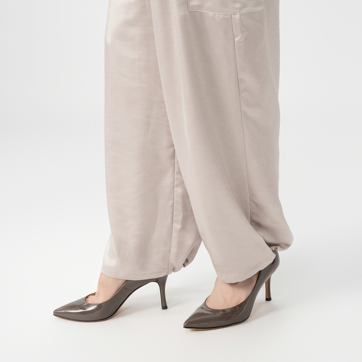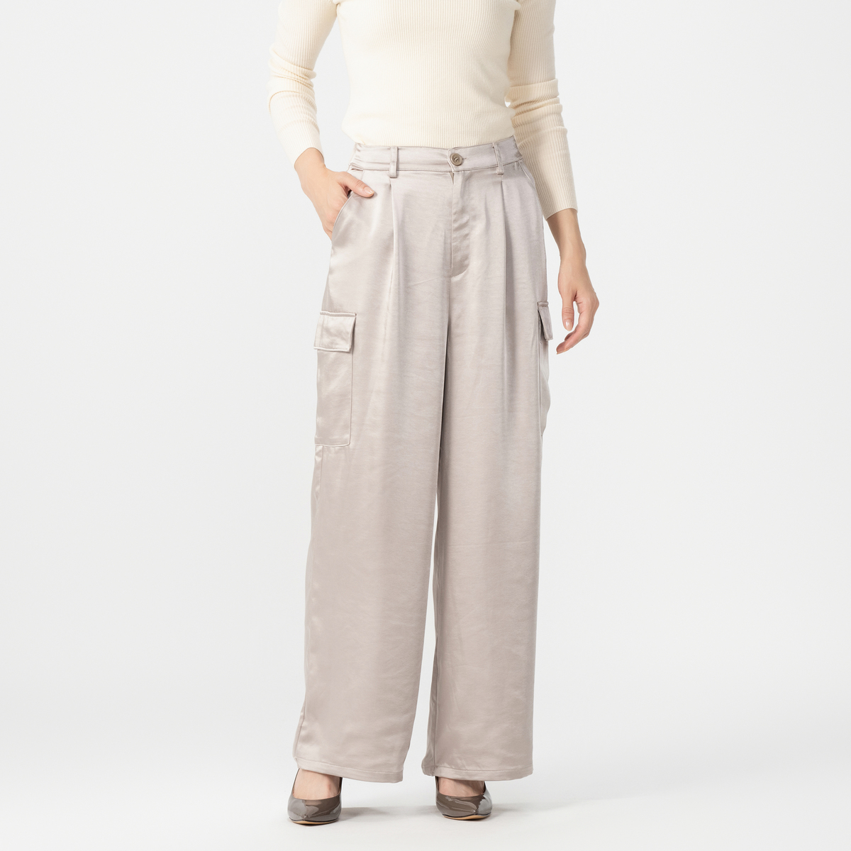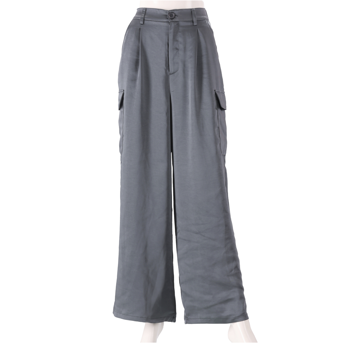 きれいめなサテン素材を使用したカーゴパンツ。カジュアル感のあるデザインときれいめ素材とのミスマッチが旬なデザインです。後ろ裾にあるコールゴムを絞ることで、カジュアルにもお楽しみいただけます