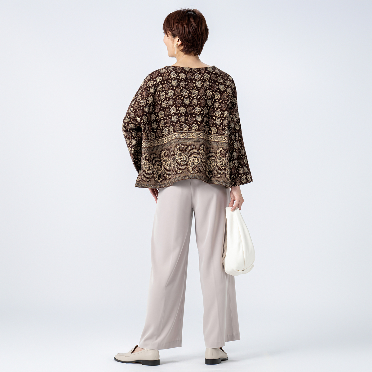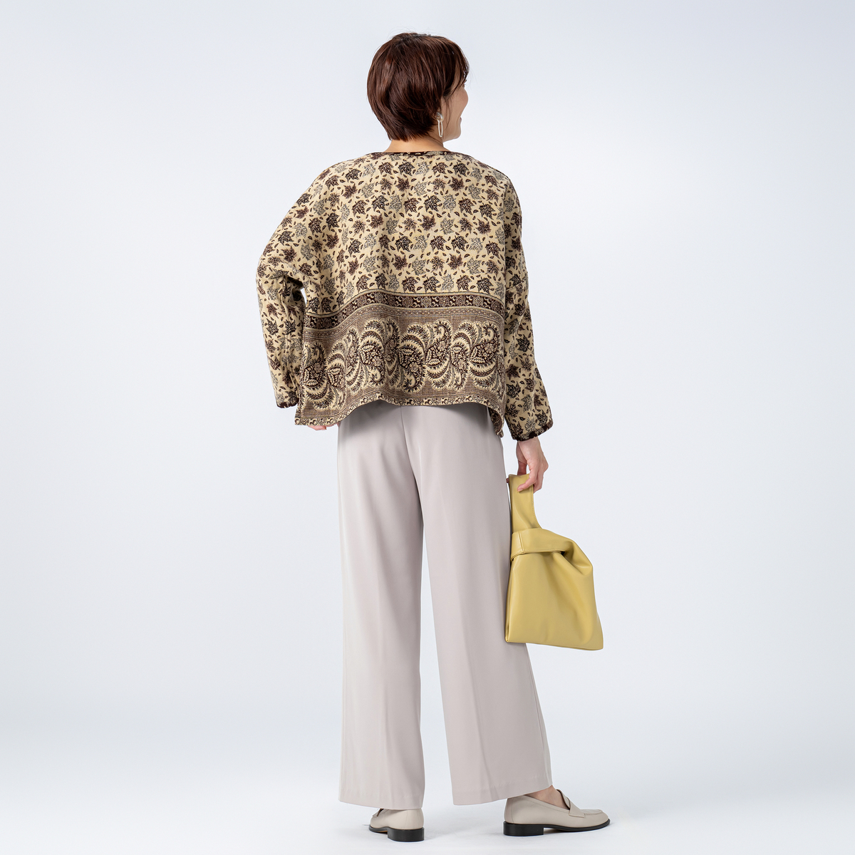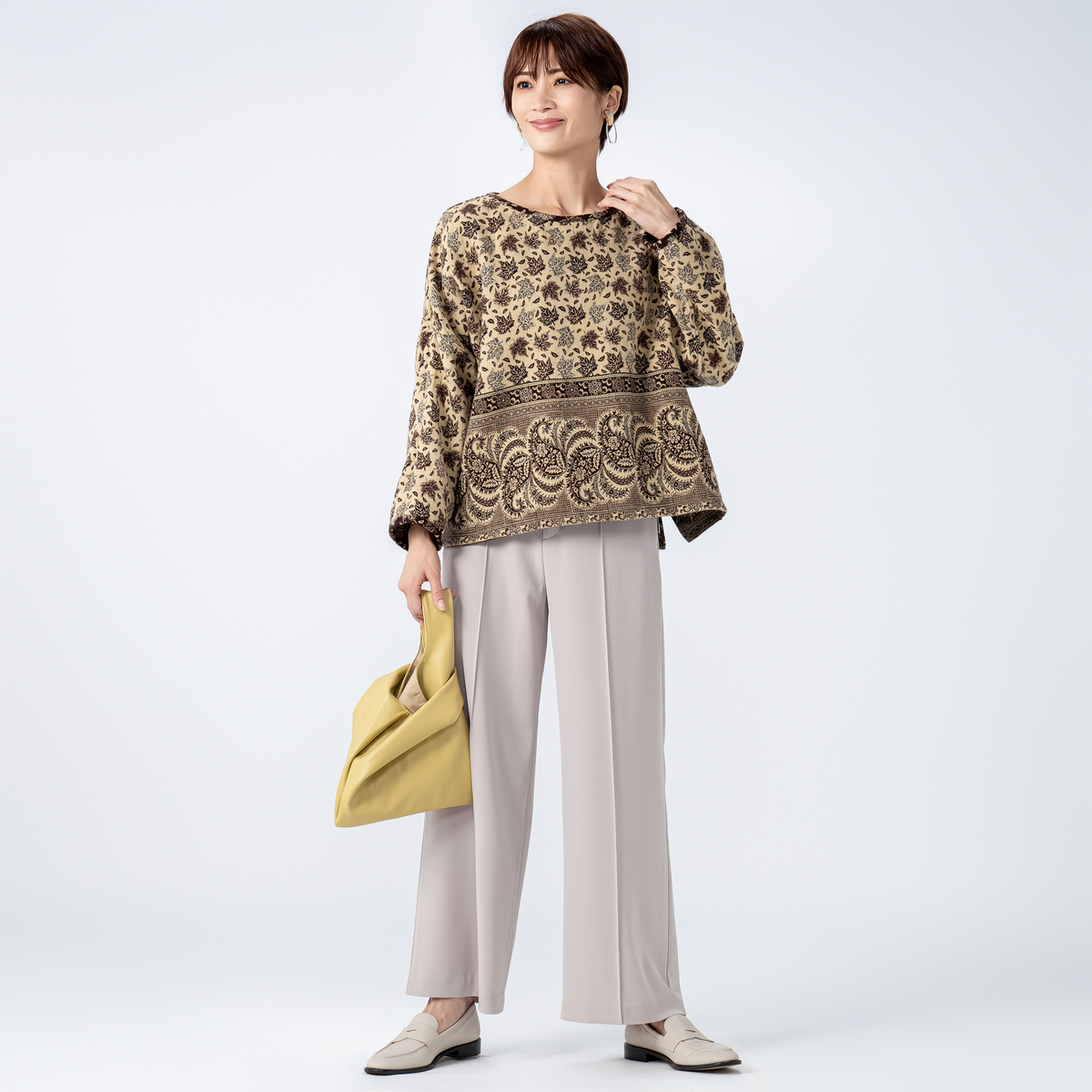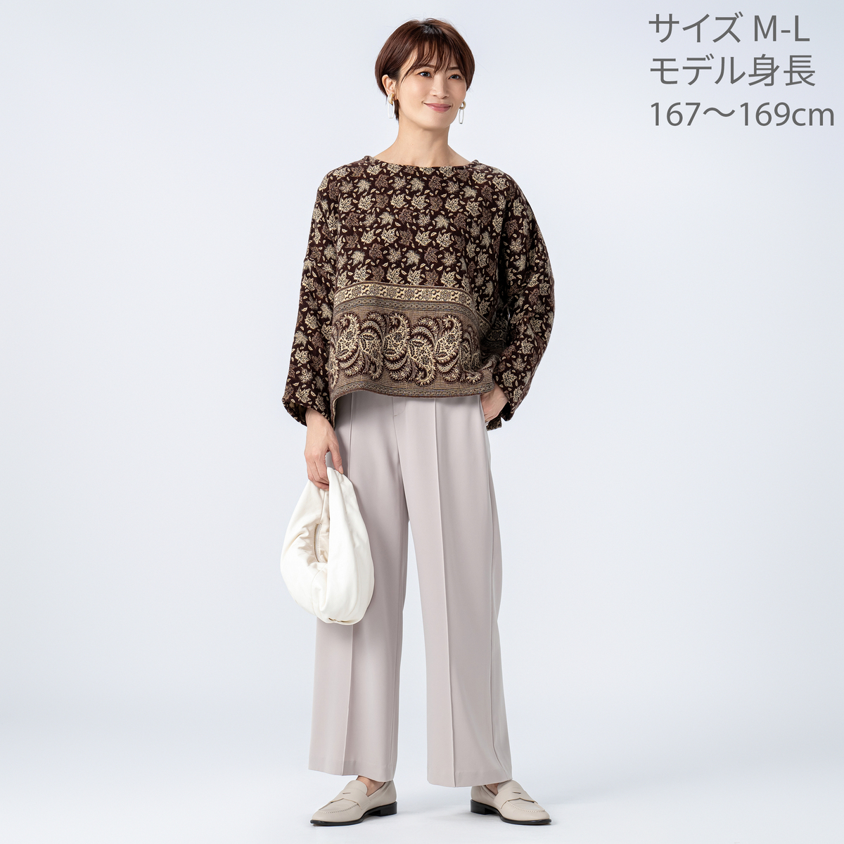 アームホールをたっぷり取って腕まわりを楽に仕上げたワイドなデザインで、ふわっとして重ね着もラクラク。ワイドパンツやフレアースカートなどと合わせた着こなしにもマッチします