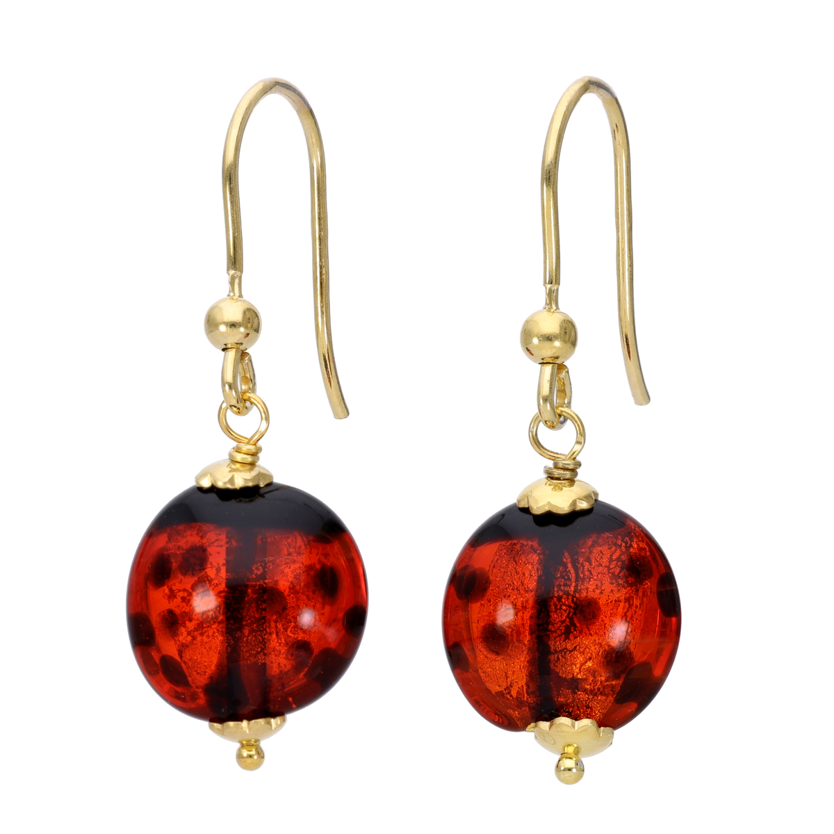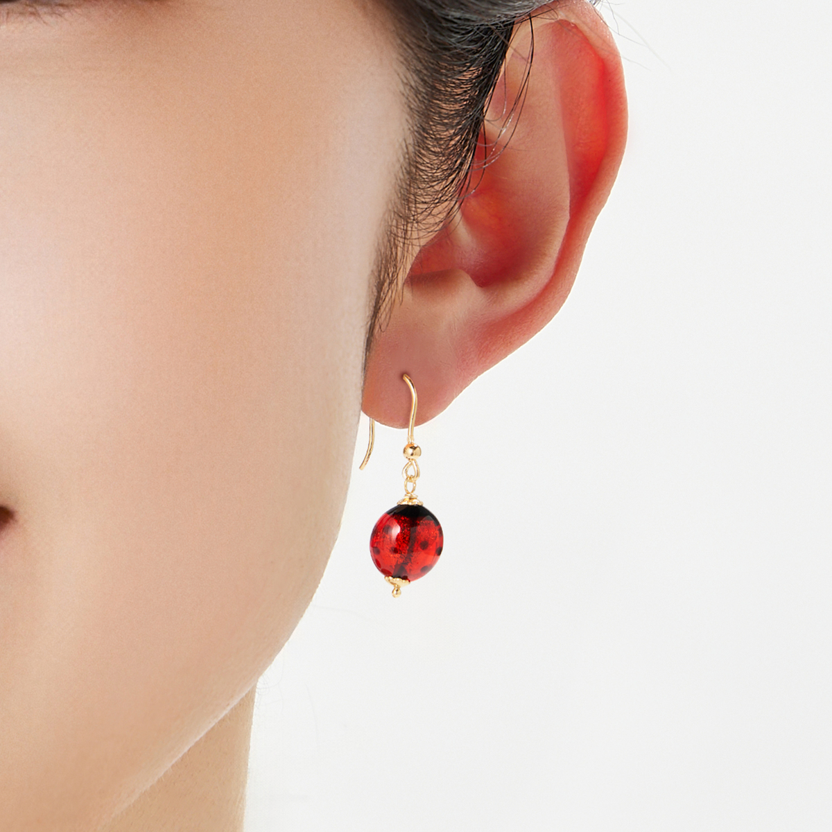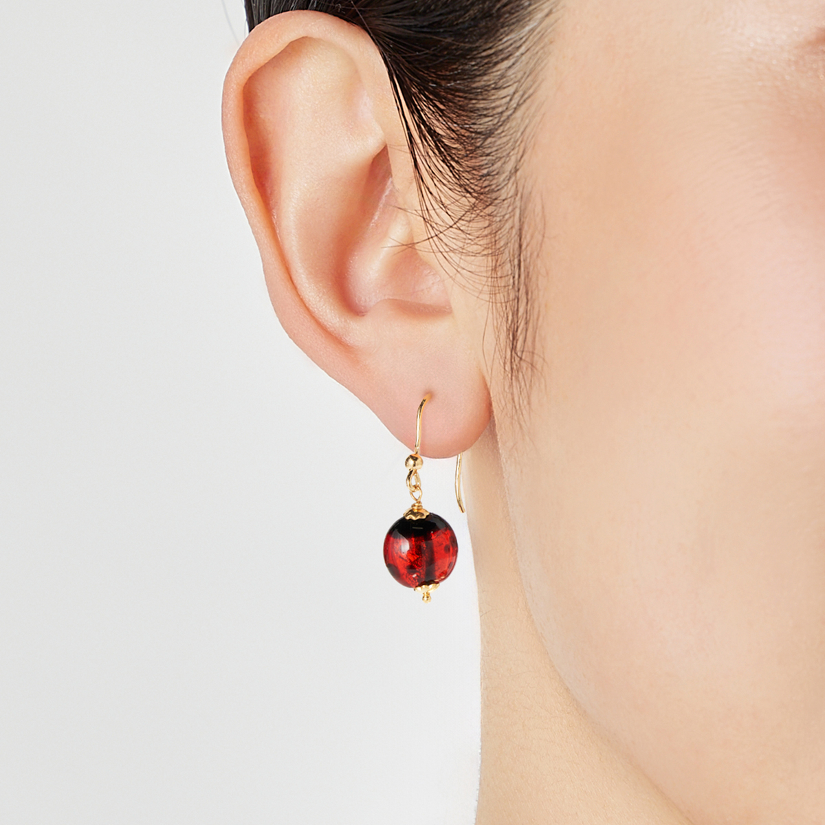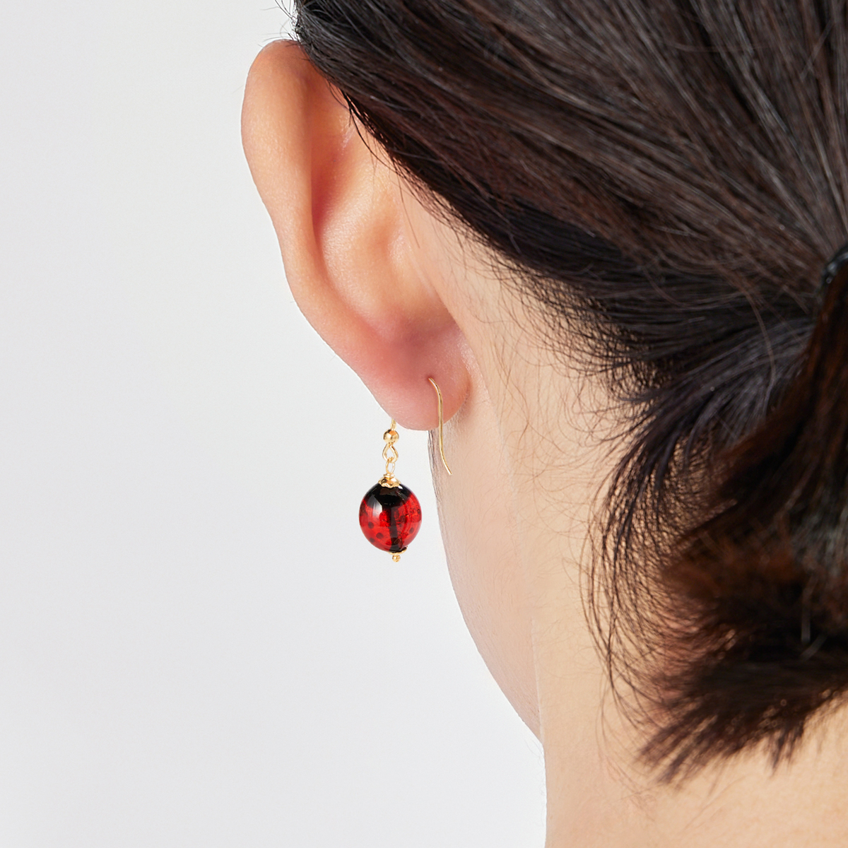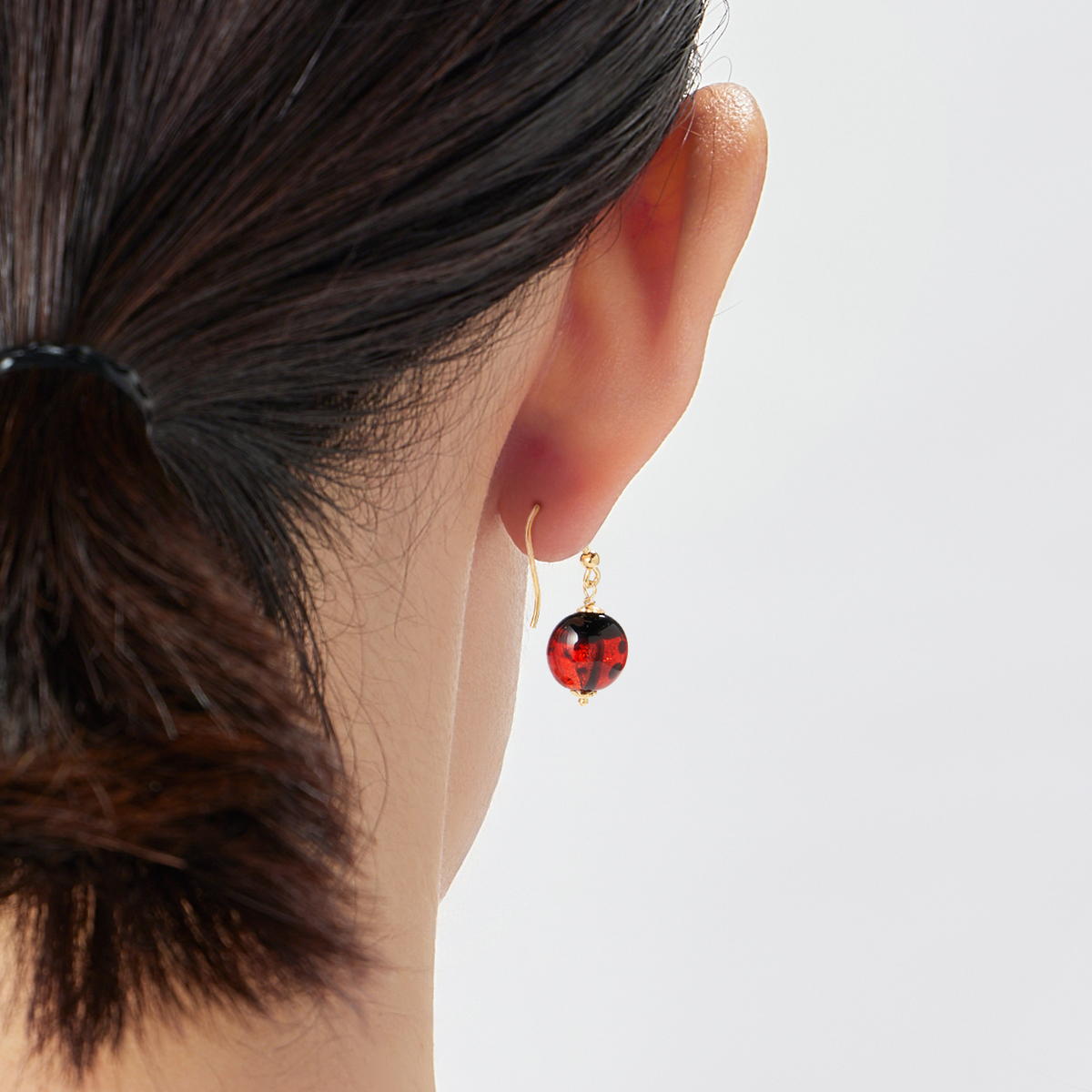 てんとう虫デザインのムラーノガラスをあしらったピアス。内側に閉じ込めたイエローゴールド箔の輝きが耳元を大人可愛く飾ってくれます