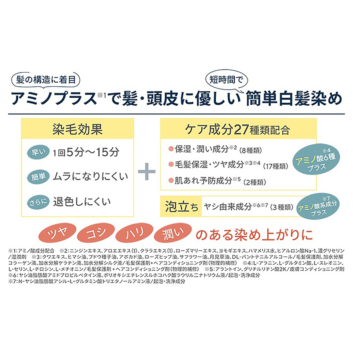 毛髪保護成分を17種類配合*1することで、よりツヤやかな仕上がりに。さらに保湿成分を配合*2。長く時間をおけばより濃い色に染まり、明るく仕上げたい方は早めに洗い流してください。染毛後はよくすすぐだけで、シャンプーやリンスの必要はなく、ソフトできれいに染め上がります