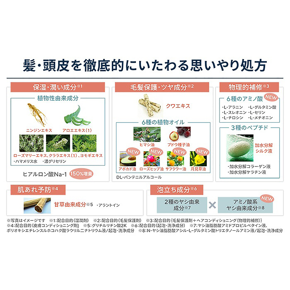 *1)クワエキス、ヒマシ油、ブドウ種子油、アボカド油、ローズヒップ油、サフラワー油、月見草油、L-アラニン、L-グルタミン酸、L-スレオニン、L-セリン、L-チロシン、L-メチオニン、加水分解コラーゲン液、加水分解ケラチン液、加水分解シルク液、DL-パントテニルアルコール