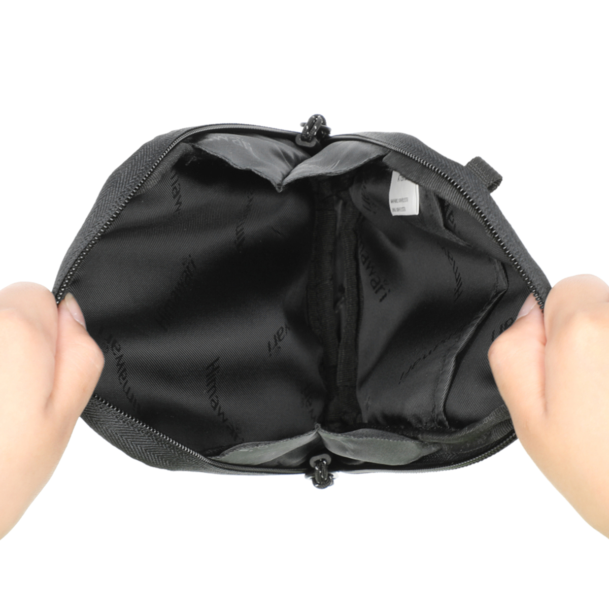 アーチ型のオープンポケットで、物が取り出しやすいのもポイント。ストラップは長さの調節もできます