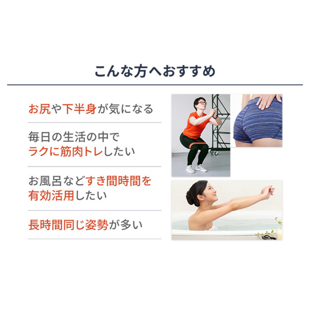 お尻・太もも・脚・足裏に敷いてケア。腰・背中は貼ってケアする(*1)スパトレーナー。水面下での使用を想定したIPX8相当の防水仕様(*2)です。センサーが水中か空気中(室内)かを判断してEMS出力を自動調整(*3)。また、水中以外でも使用できます。体感が弱い場合やピリピリする場合は、本製品があたる部位に水、化粧水、ジェル(油分を含まないタイプ)などを塗ってご使用下さい(*4)