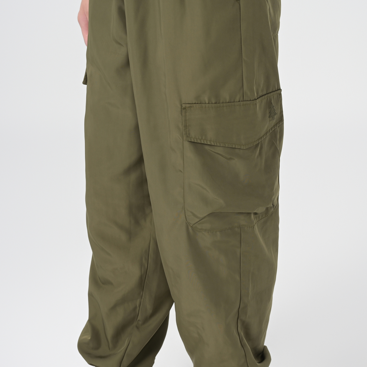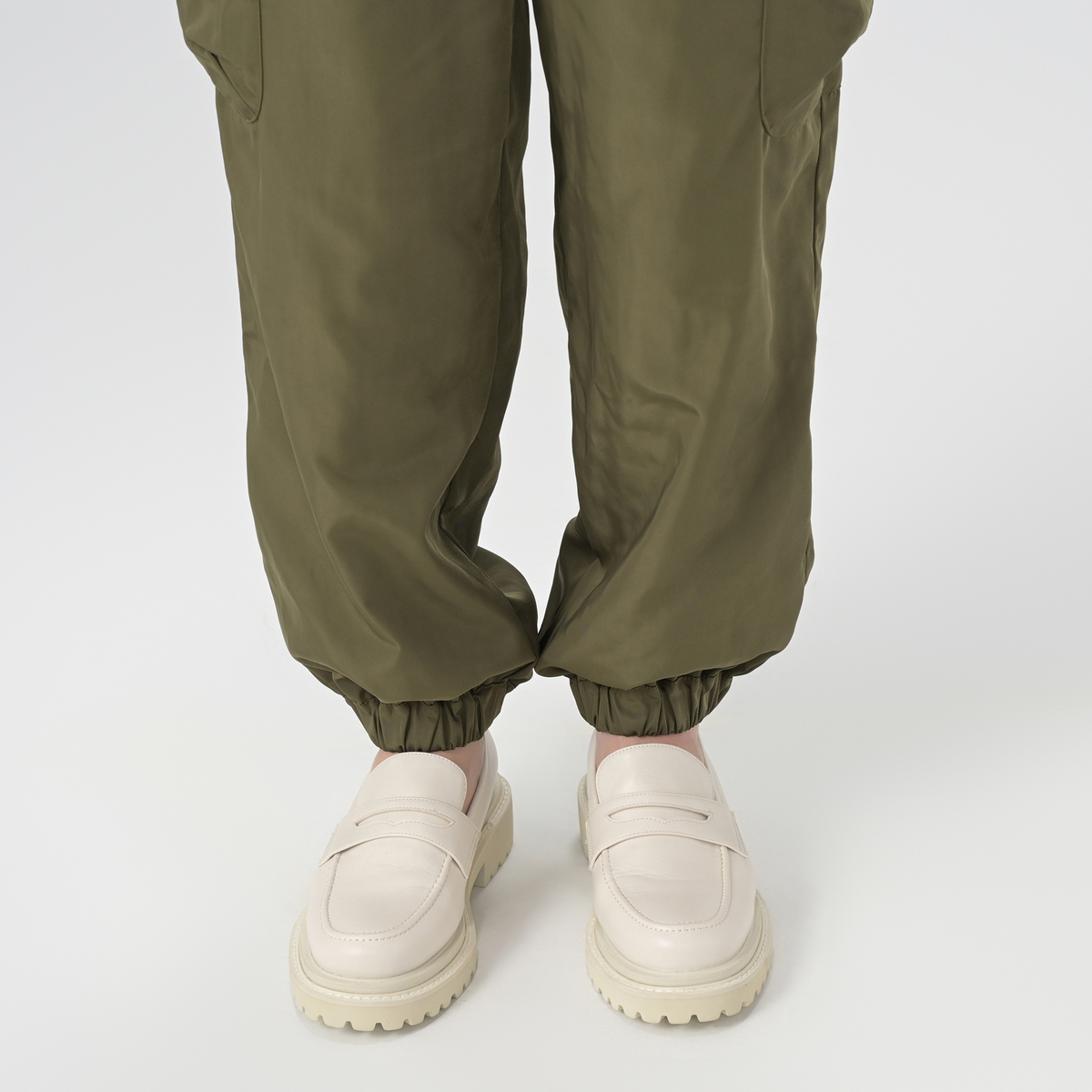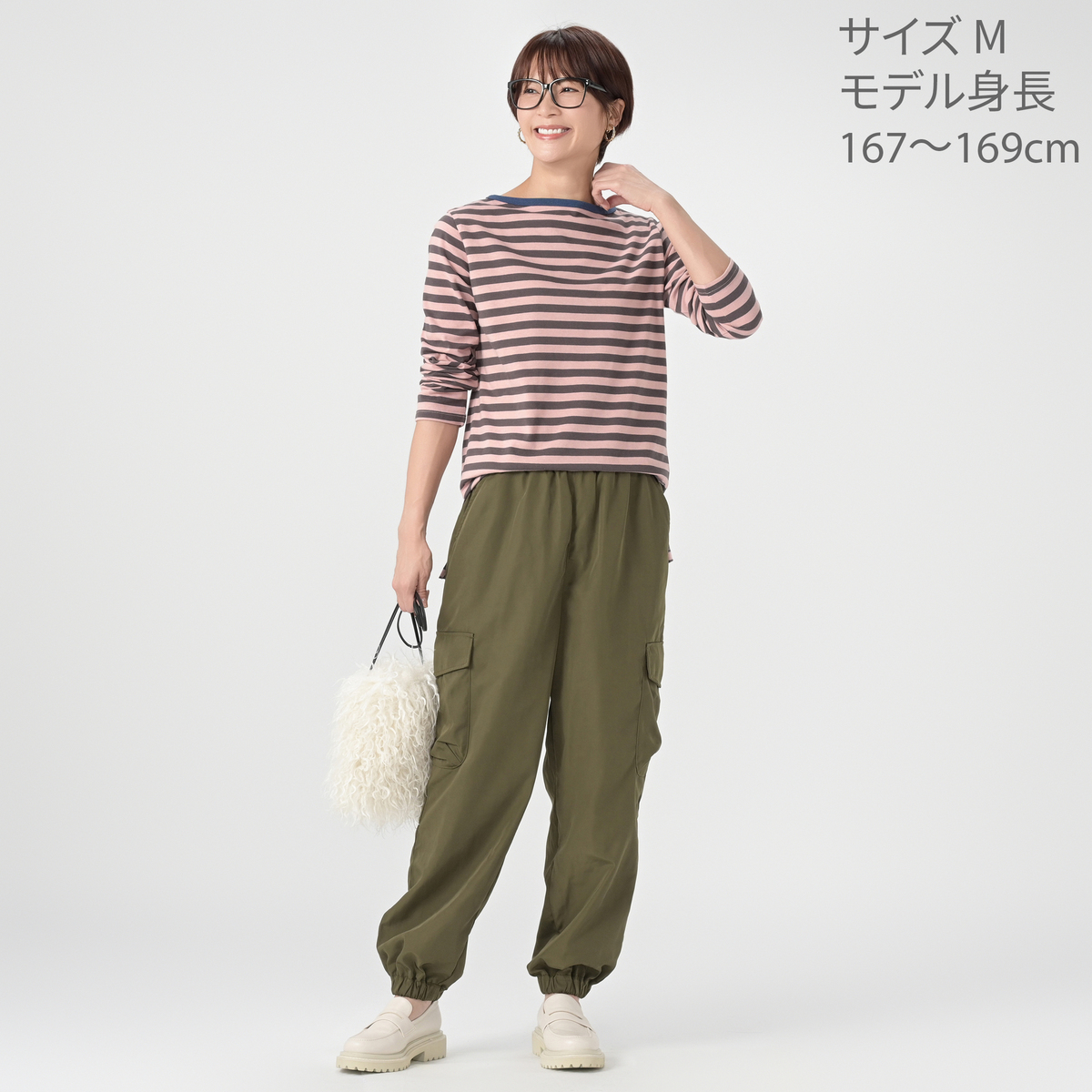 柔らかで光沢感のあるカーゴパンツ。綾織のツイル素材です。フロントウエスト下にポケット、左右の下両脇には立体ポケット、後ろにも大きめのアウトポケットを付けたデザインです。プルオンタイプながら、しっかりとした仕立てで、見栄えと機能性にこだわっています