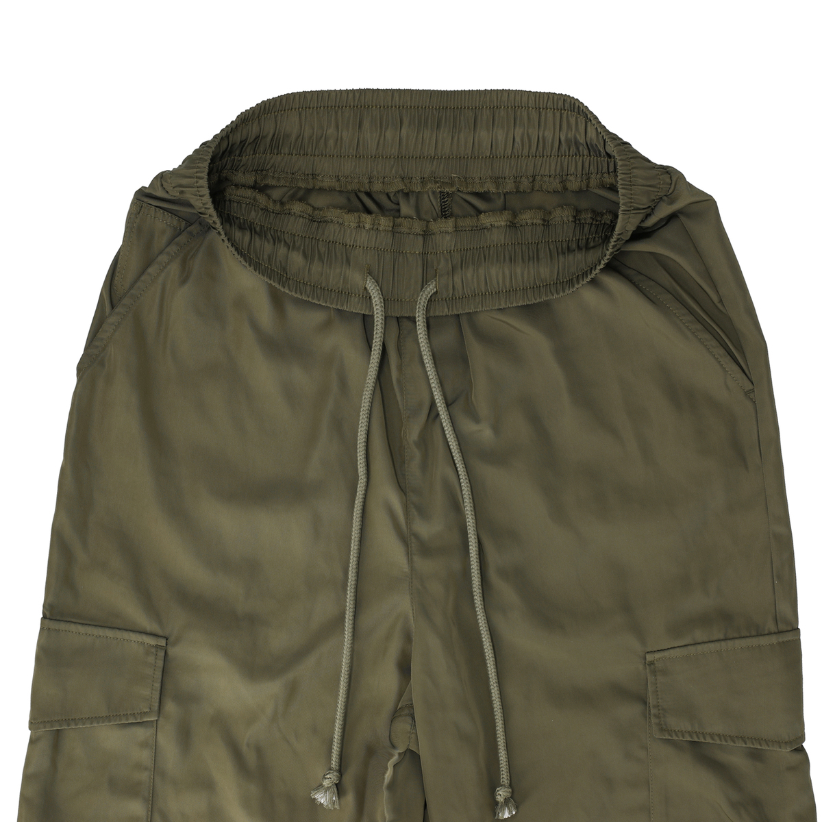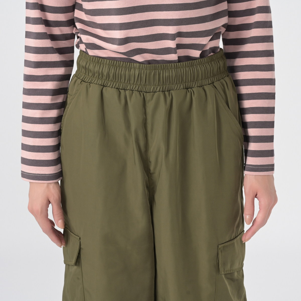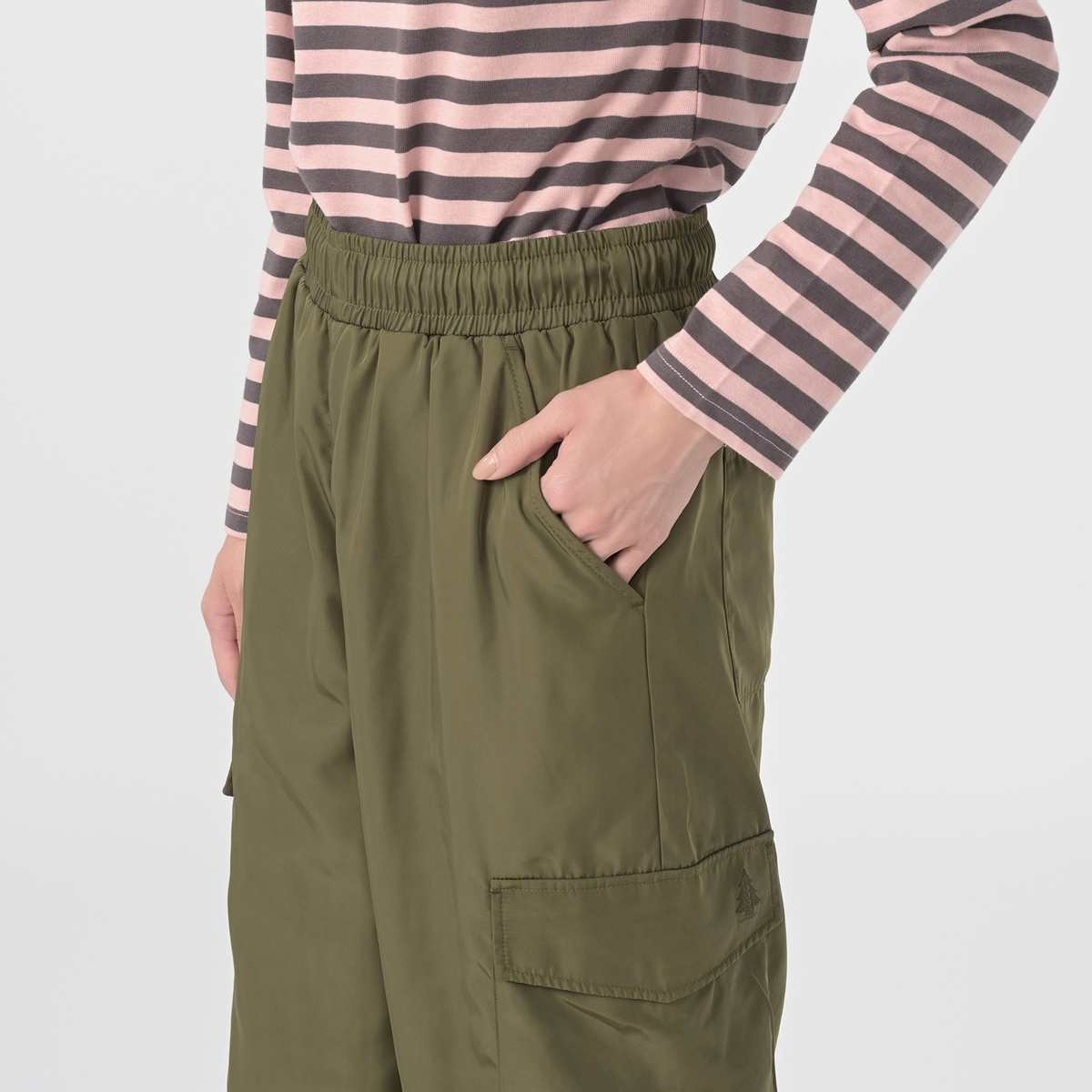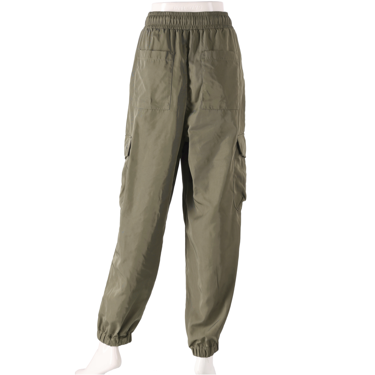 柔らかで光沢感のあるカーゴパンツ。綾織のツイル素材です。フロントウエスト下にポケット、左右の下両脇には立体ポケット、後ろにも大きめのアウトポケットを付けたデザインです。プルオンタイプながら、しっかりとした仕立てで、見栄えと機能性にこだわっています