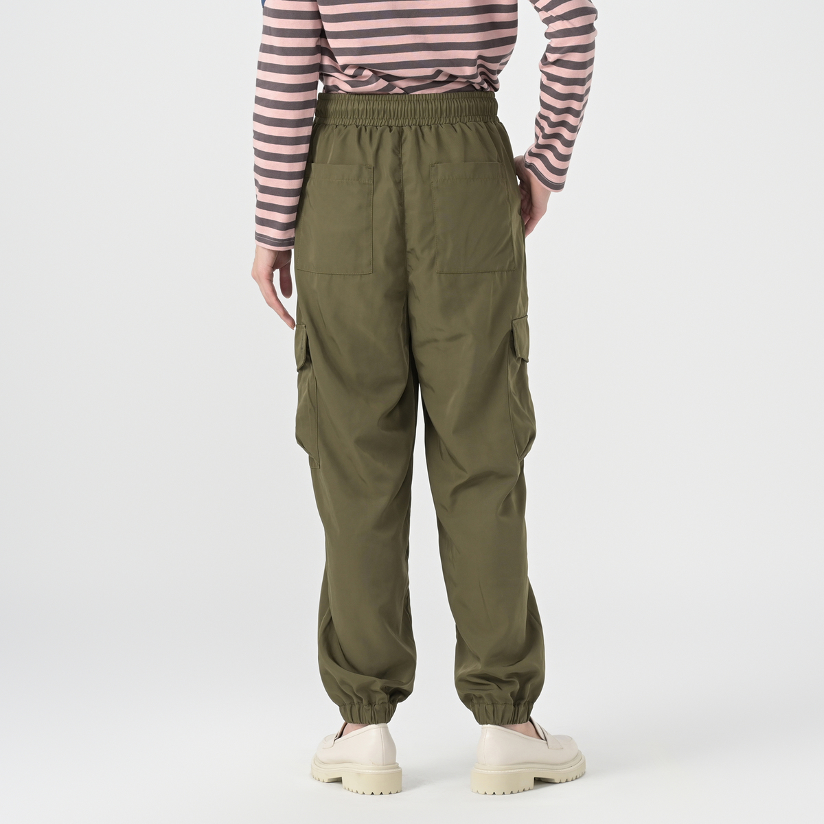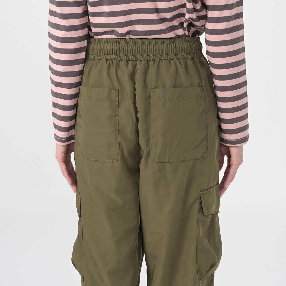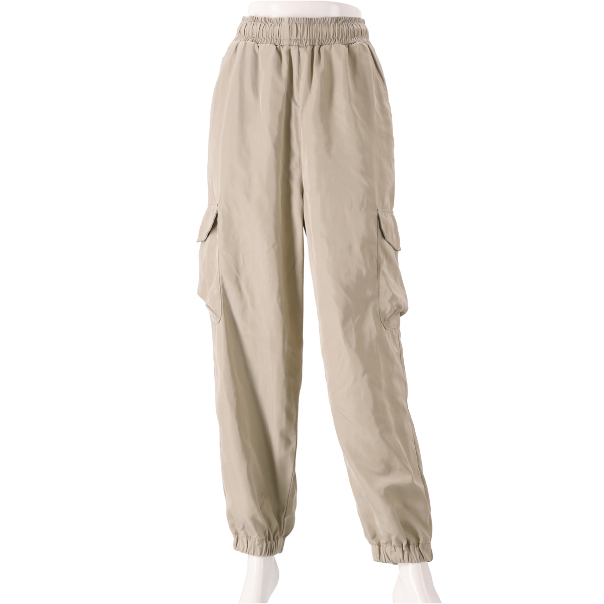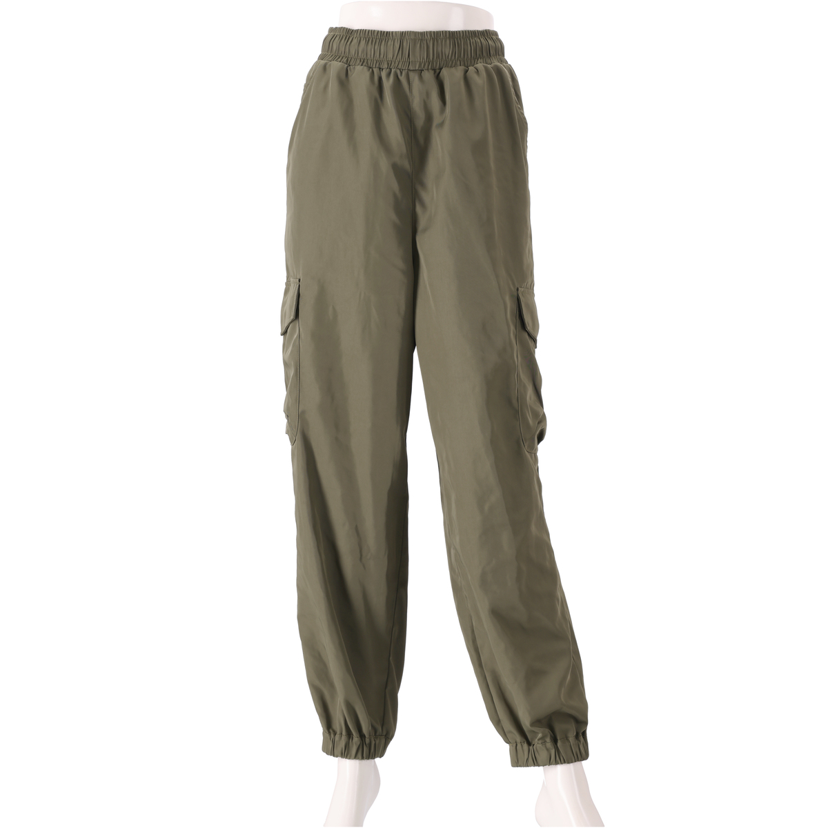 ウエストにスピンドルコードを入れているので、サイズ調整が可能。腰周りはゆとりがあり、気になる部分をカバーしながら、裾にかけてやや細くなっていくシルエットです。裾は風が入り込むのを防ぐ、ゴムで絞ったパラシュートパンツタイプです