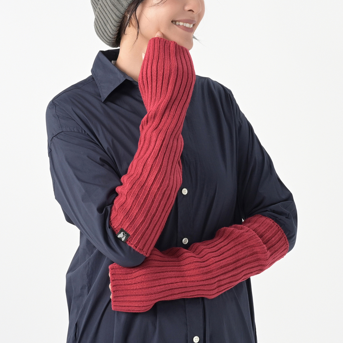 厚手のニット素材を使った、チクチクしにくいアームカバー。シンプルなリブ編みで、肘側にはホット君のオリジナルピスネームを付けています