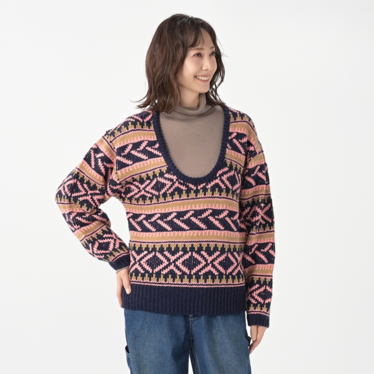幾何学柄がキュートなジャガード編みのニット。手編み風のざっくりとしたローゲージの編地は、見た目だけでもぬくもりを感じられます。3色使いの配色幾何学モチーフで、フェアアイル調にデザインしたこだわりのオリジナル柄。えりぐり裏につけたライン入り飾りテープが隠れポイントです