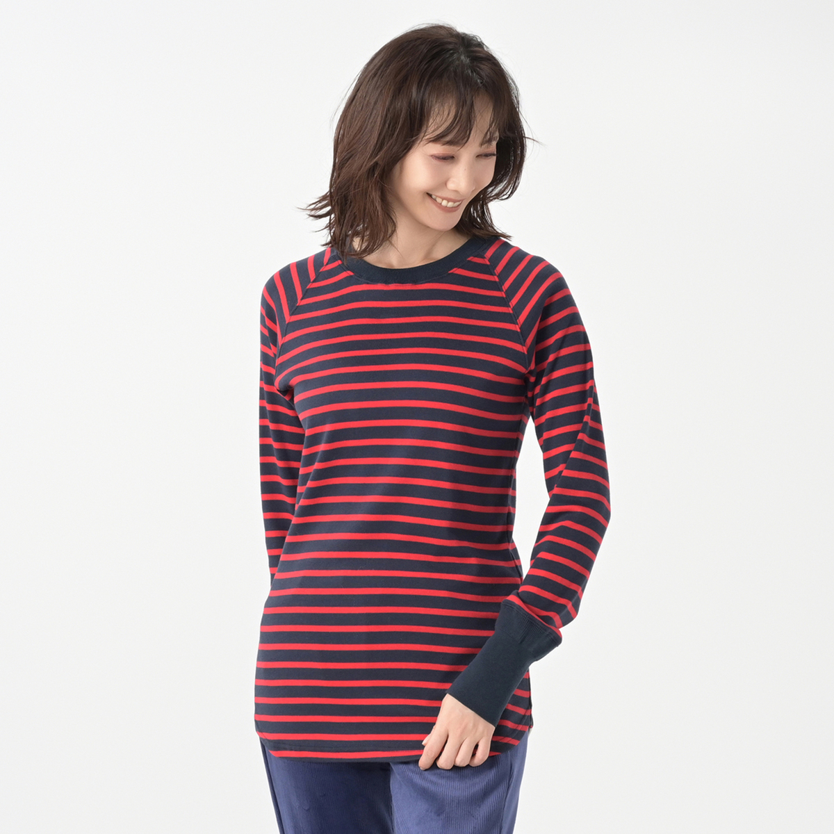 裏起毛素材を使用したシンプルなボーダープルオーバー。ラグランスリーブのベーシックなシルエットで着回しやすく、様々なコーデに活躍してくれます