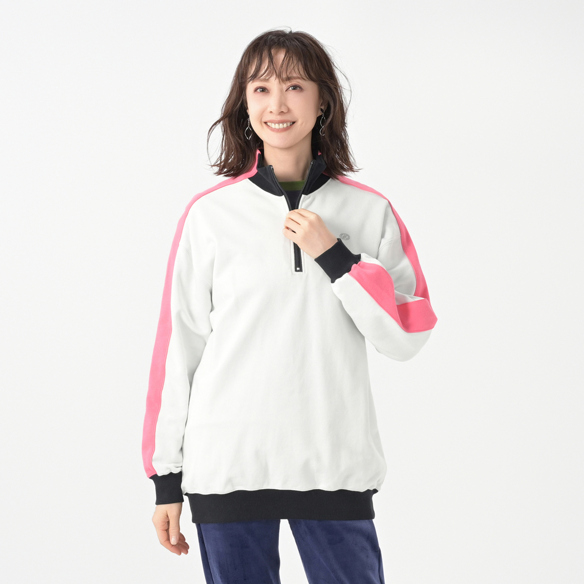 レトロスポーティなハーフジッププルオーバー。えりから袖にかけて施した配色のライン切替がポイントです。ヘムラインをキュッと絞ったシルエットでレトロ感を演出しています
