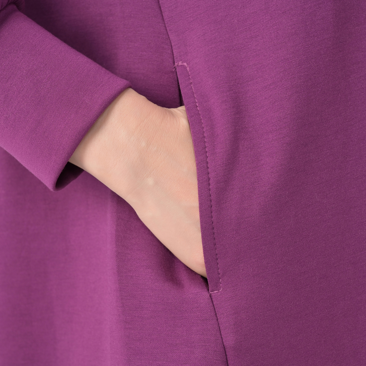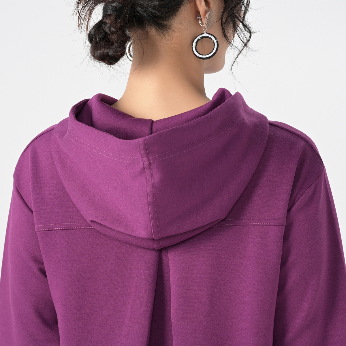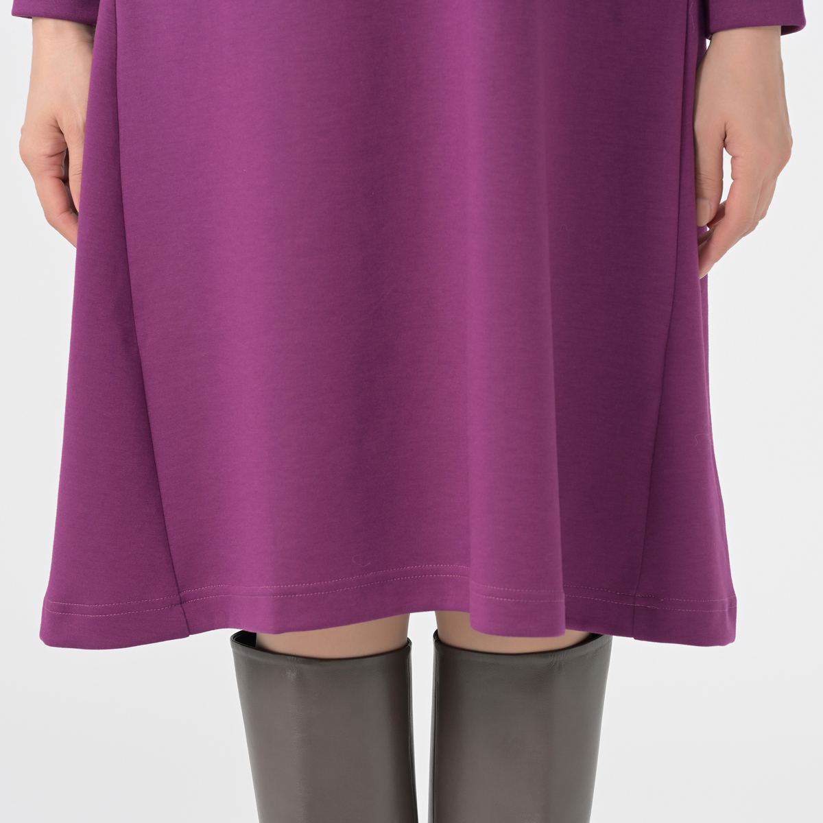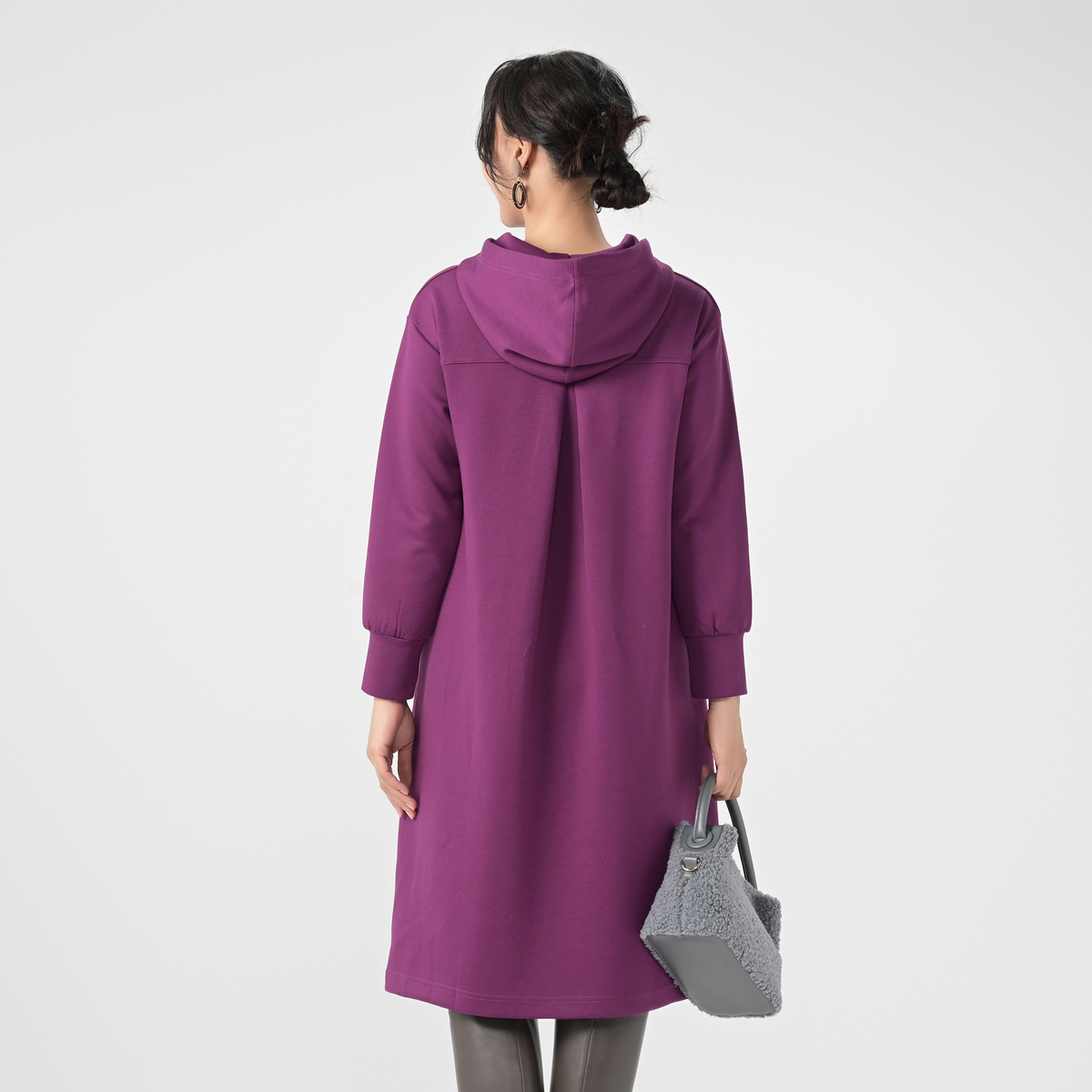 きれいな編み目の中肉ダンボールのカットソーのワンピース。ボディラインを拾いにくくシルエットをきれいに見せてくれます。バスト周りからゆとりがあり、裾に向かって緩やかに広がるラインのフーディデザインです