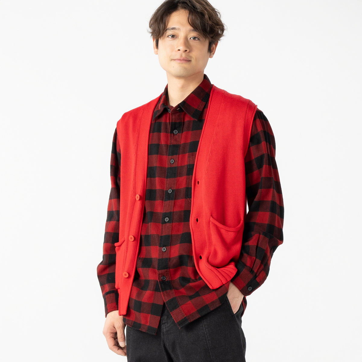 編地が柔らかで着心地良い、7ゲージのベスト。Vネックなので、シャツ合わせやロンT合わせなど、お手持ちのトップスとのコーデが楽しめます。前身左右にはポケットを付けました