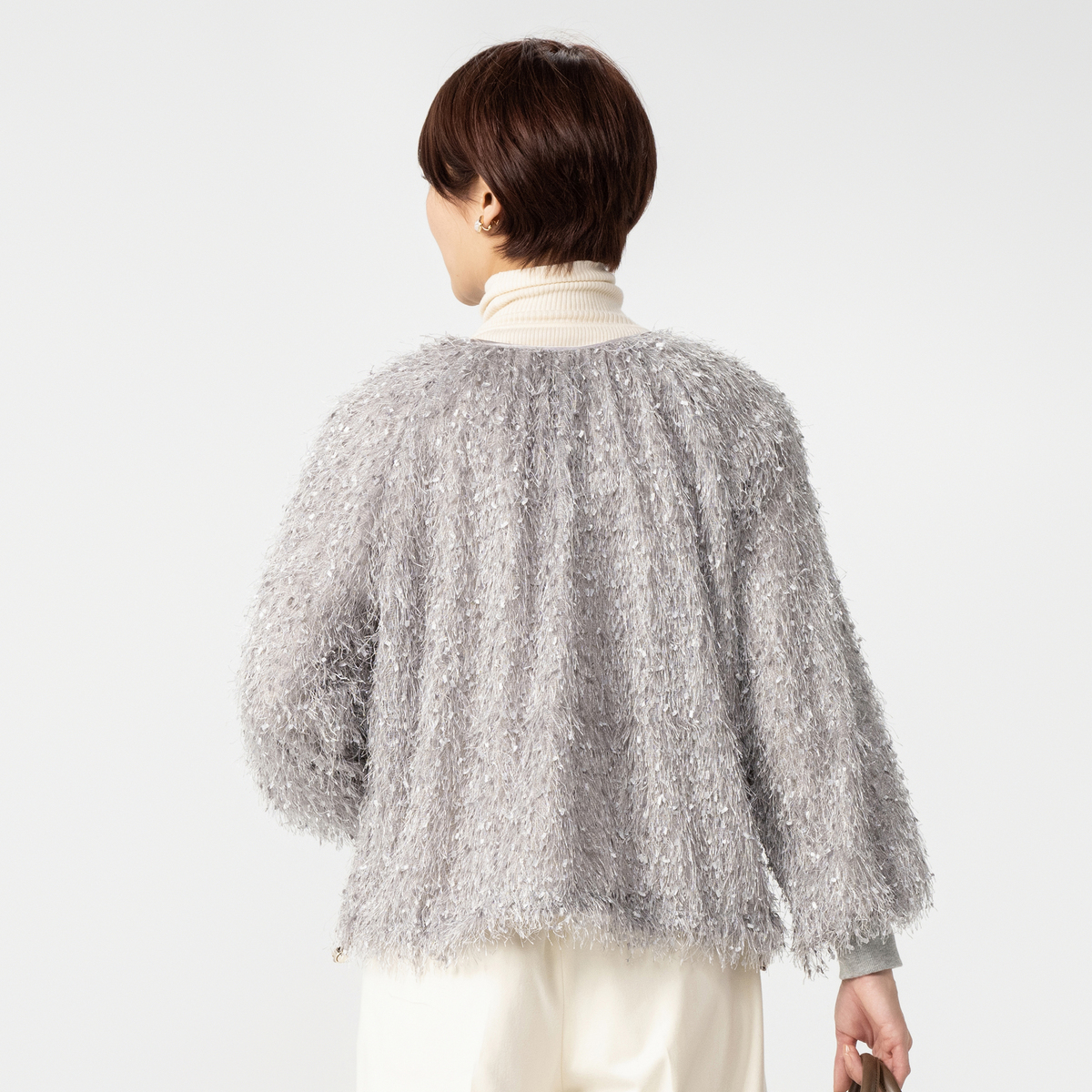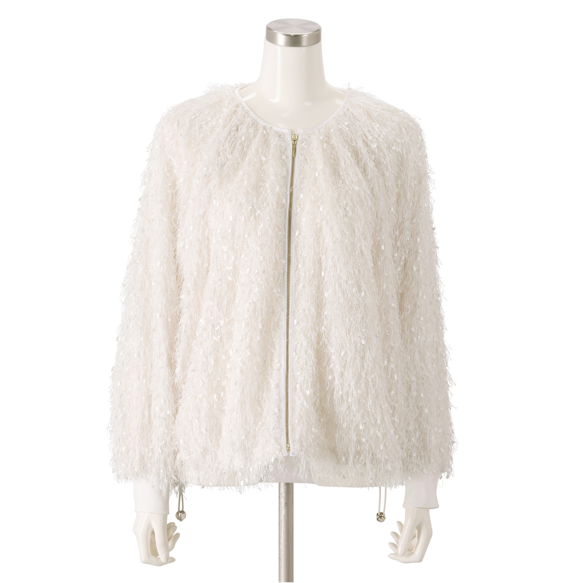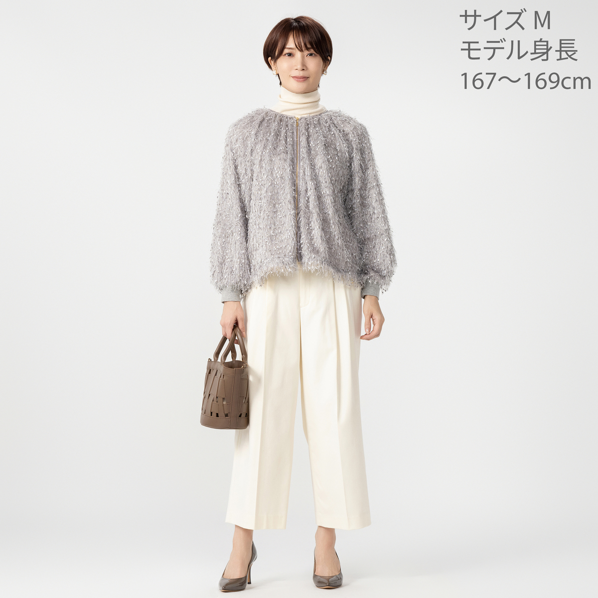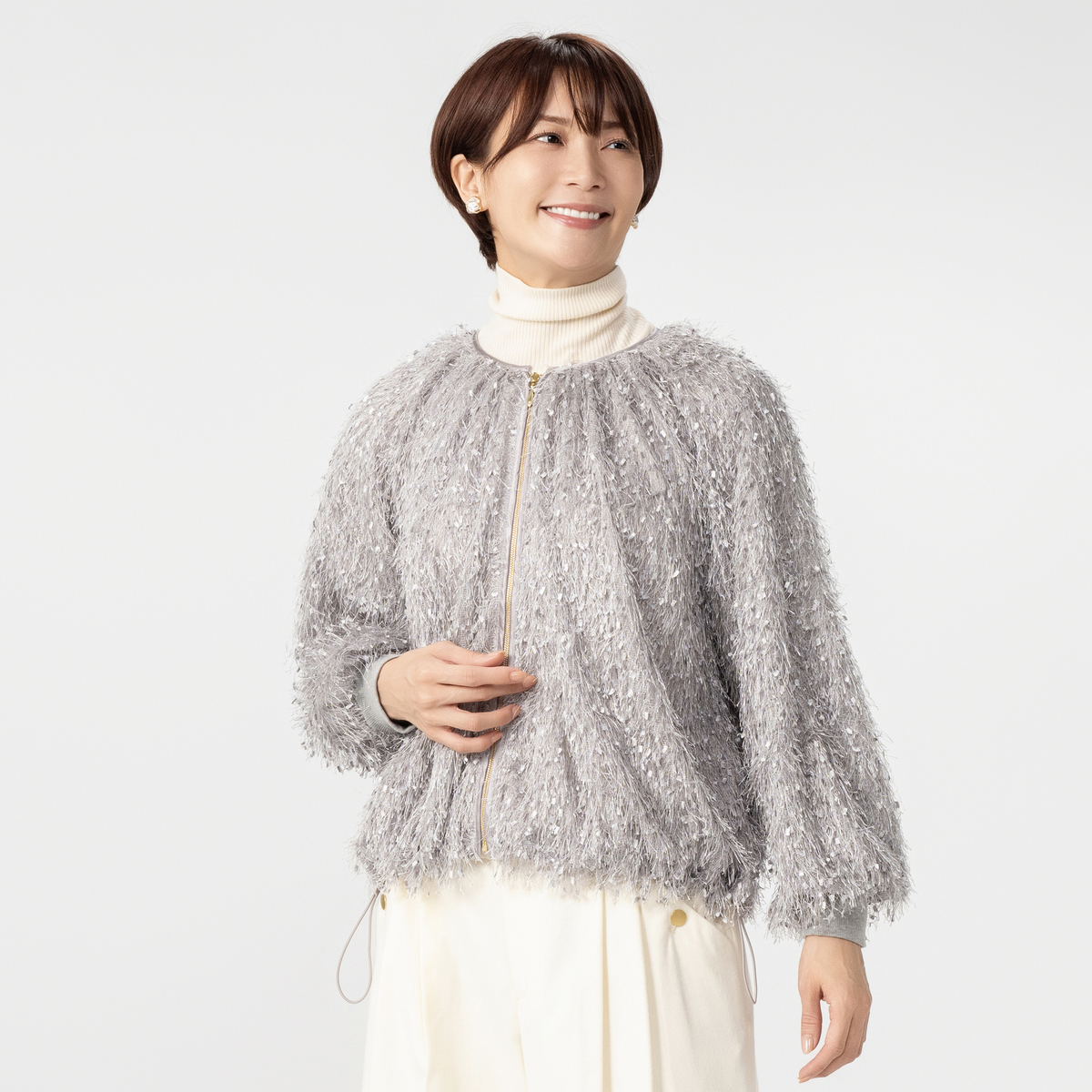 今シーズンのマストアイテム、フェザーヤーンを使用したブルゾンです。軽い着心地で、Tシャツの上にさっと羽織るだけでスタイリッシュなスタイリングが完成します