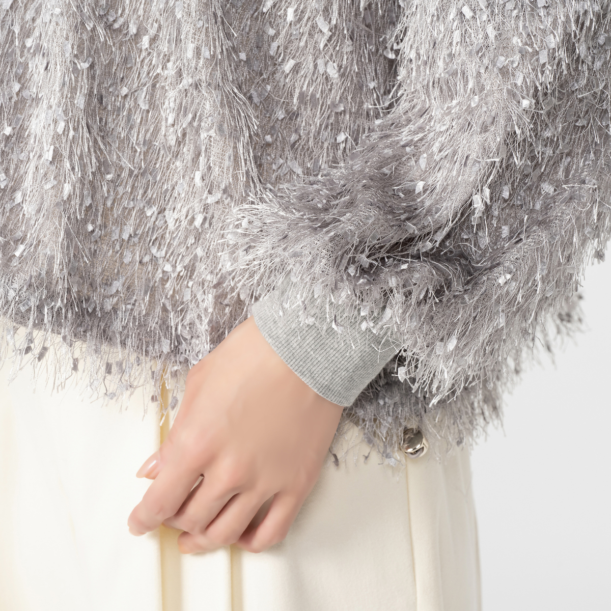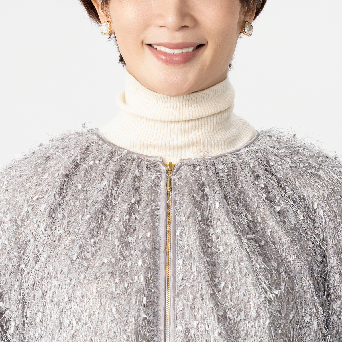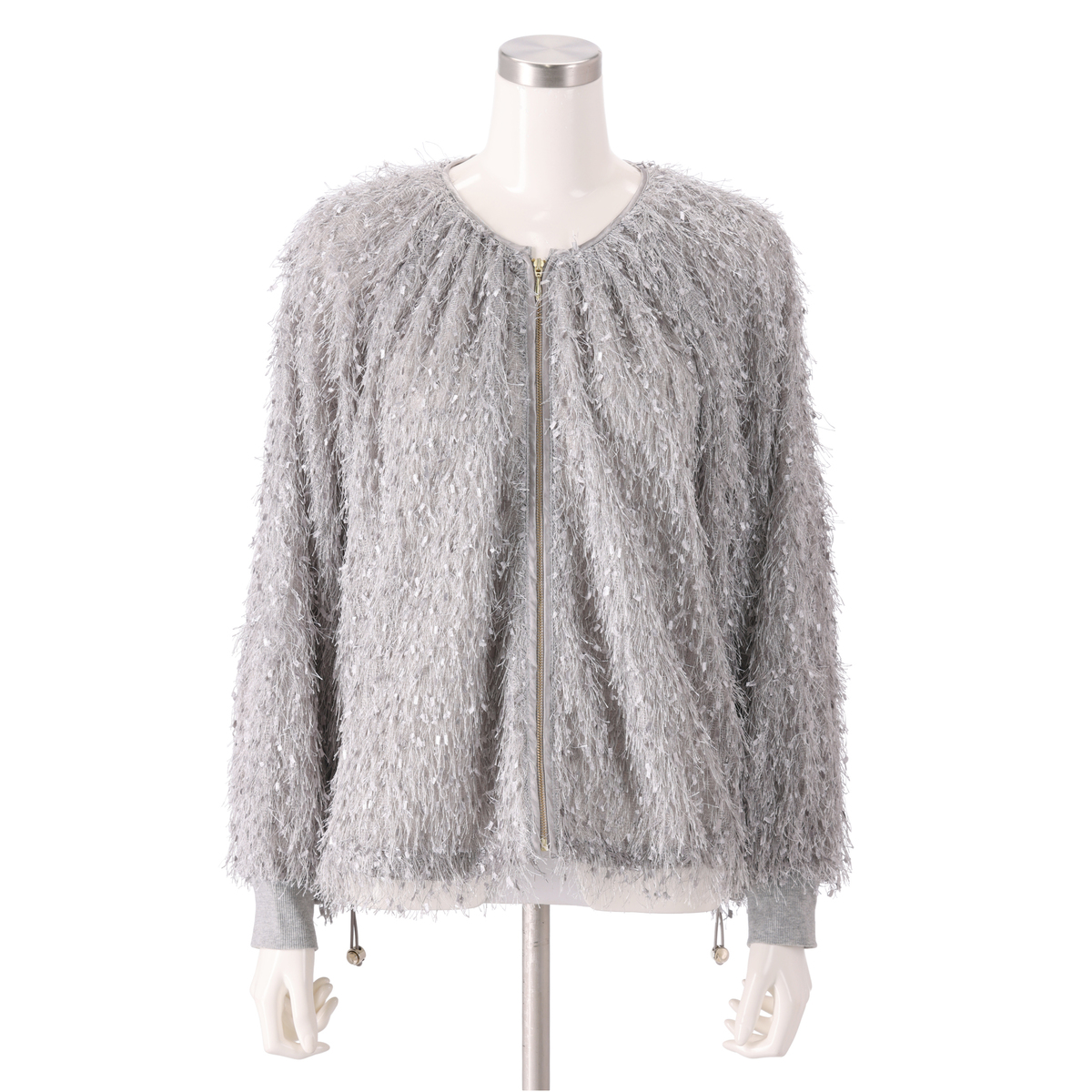 今シーズンのマストアイテム、フェザーヤーンを使用したブルゾンです。軽い着心地で、Tシャツの上にさっと羽織るだけでスタイリッシュなスタイリングが完成します