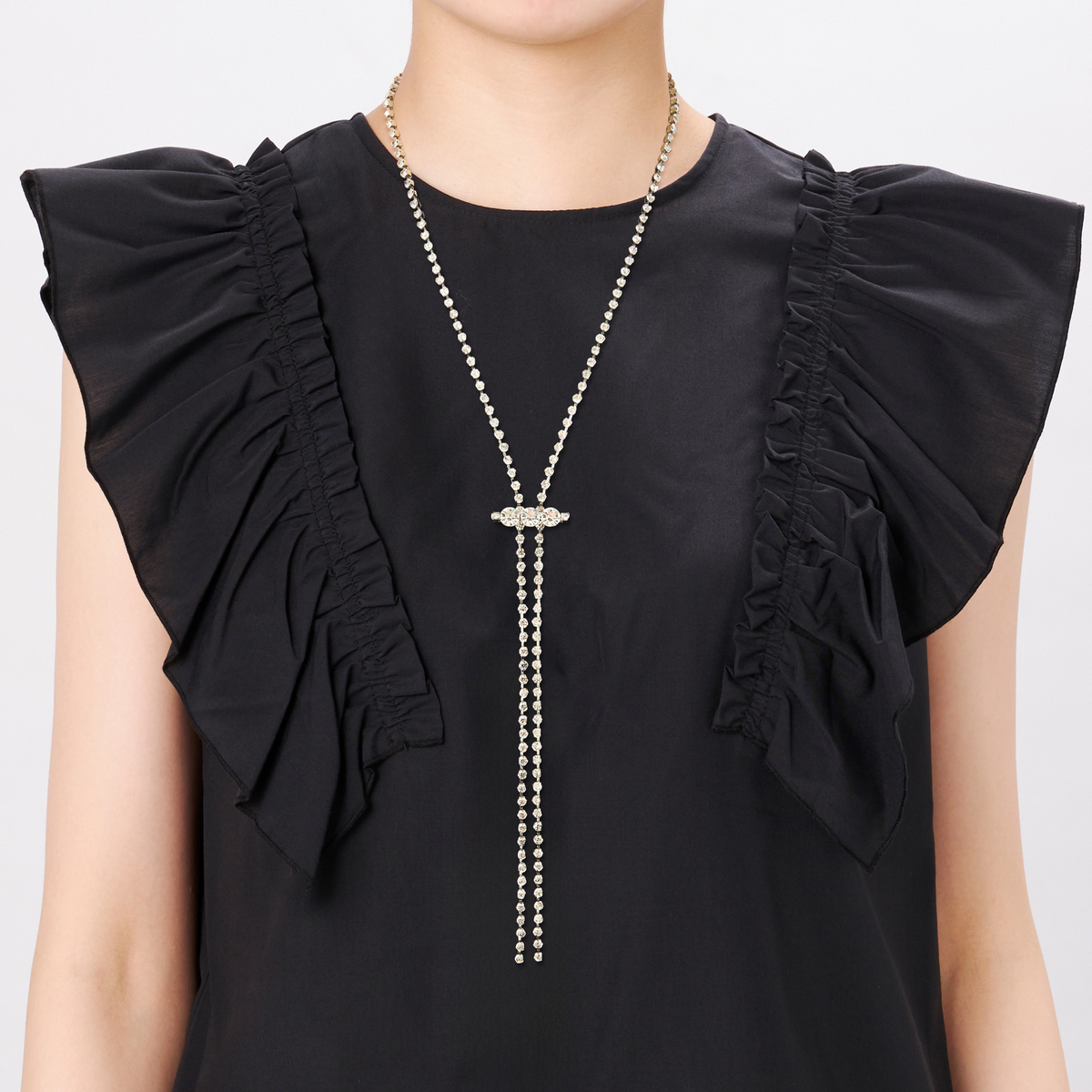 ラリエットはクリスタルガラスのダイヤレーンを使用。専用のピンでラリエットを前で留め、Y字ネックレスのようにお使いいただけます。ピンは開閉式で、ラリエットのお好きな位置に取り付けることが可能です