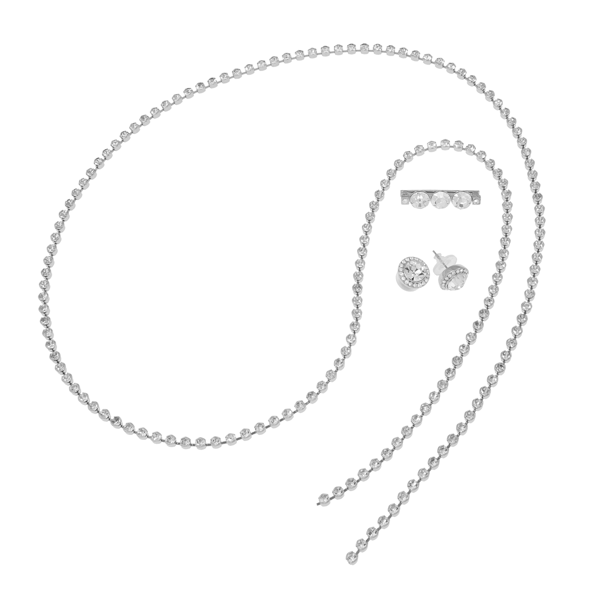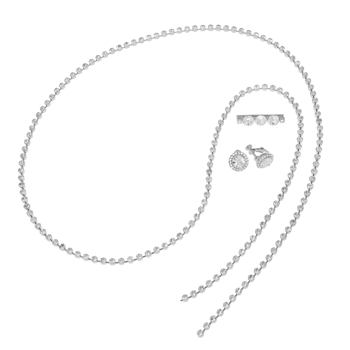ピン付きのラリエットと、一緒に楽しめるイヤリングまたはピアスの豪華なセット。クリスタルガラスをあしらい、キラキラと輝く華やかなデザインに仕上げました