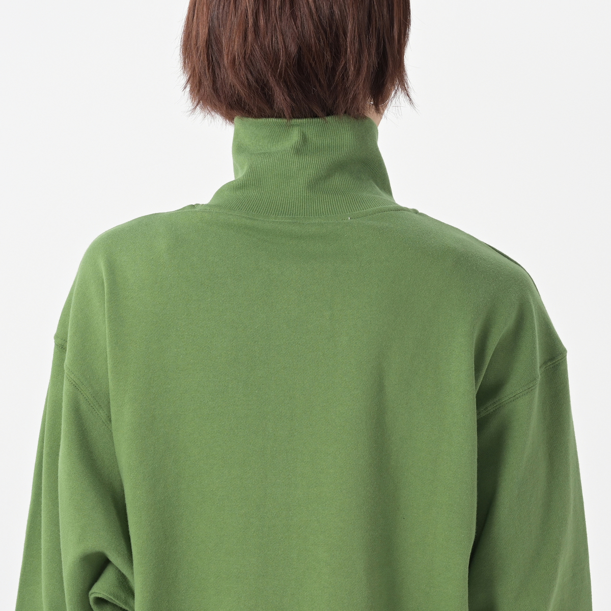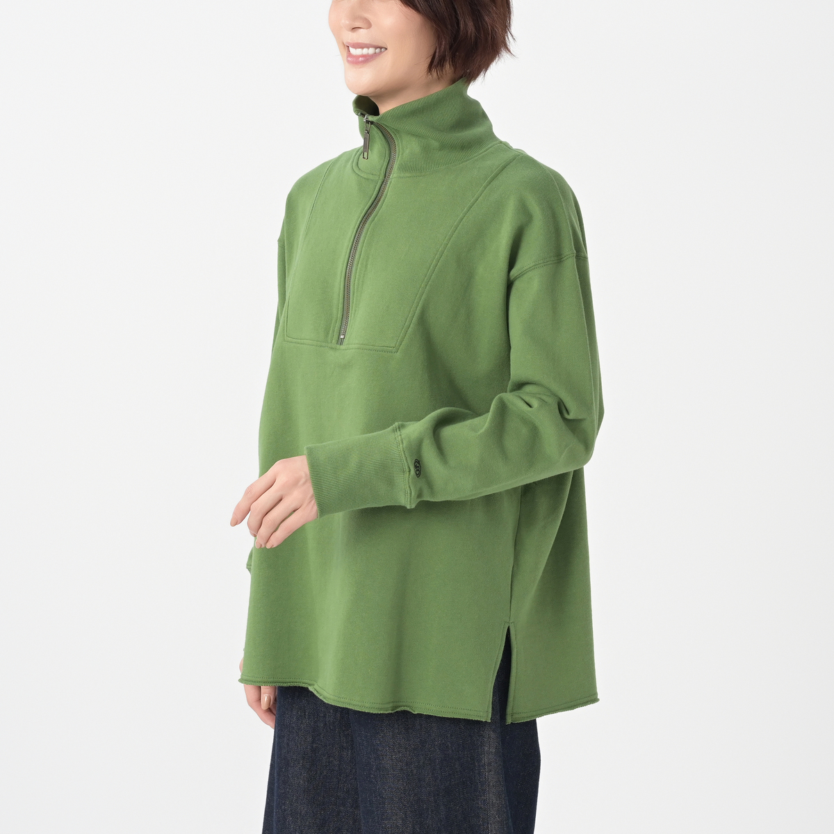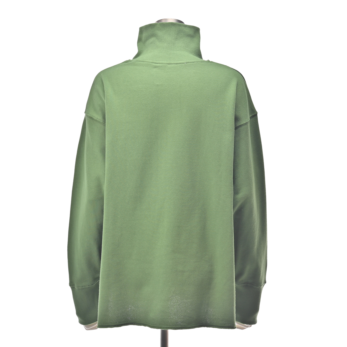 ソフトな風合いの裏毛素材を使用。フロントの胸切替部分は見返しをつけた2枚仕立てで、ここをしっかりさせることでボリュームのあるスタンドカラーを支え、立ち上がり良く仕上げています。えりと袖口には伸縮性の良い同色系のリブを付けました