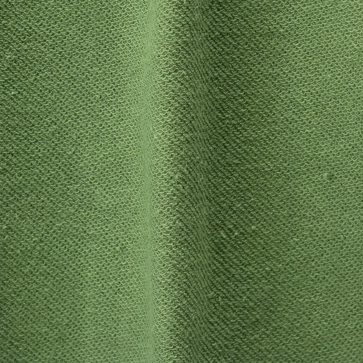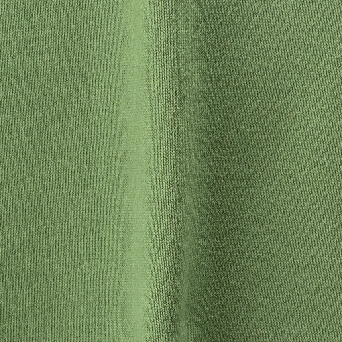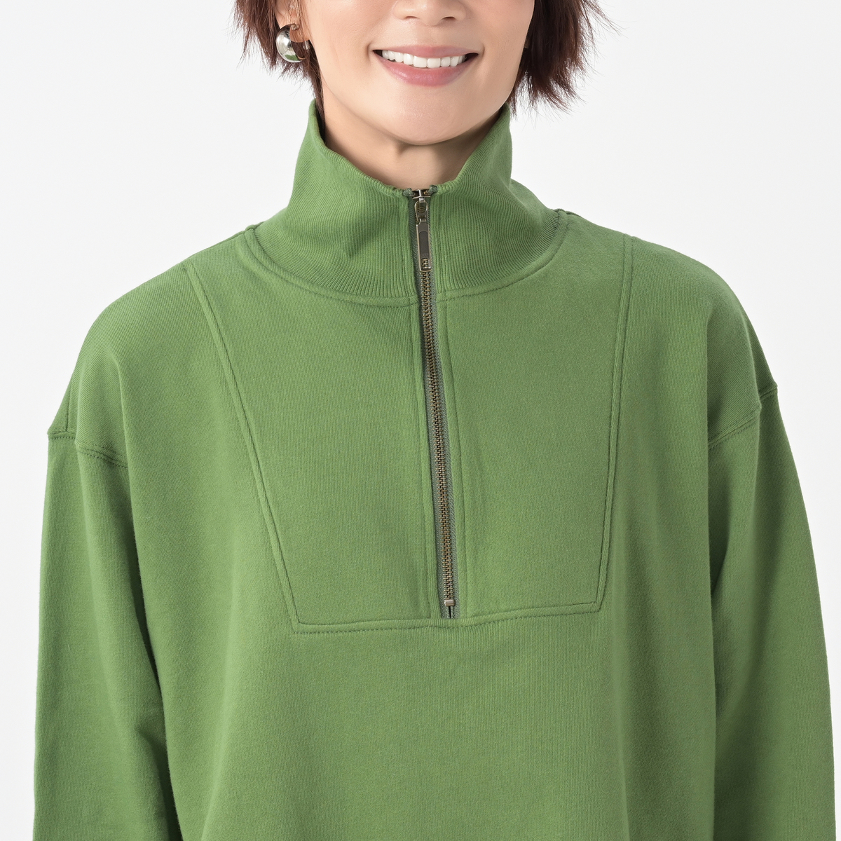 ソフトな風合いの裏毛素材を使用。フロントの胸切替部分は見返しをつけた2枚仕立てで、ここをしっかりさせることでボリュームのあるスタンドカラーを支え、立ち上がり良く仕上げています。えりと袖口には伸縮性の良い同色系のリブを付けました