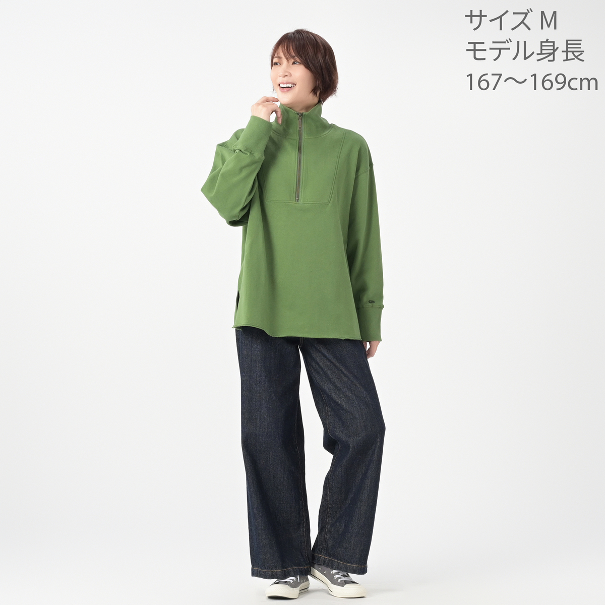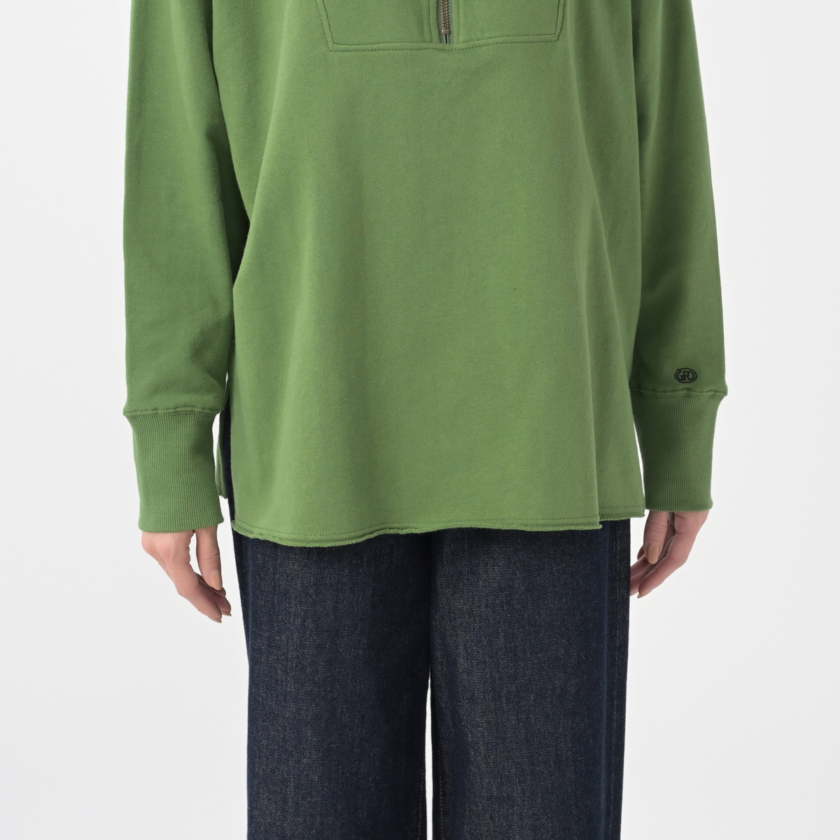 着丈やや長めでチュニック風な、ハーフジップのトレーナー。ベーシックなハーフジップよりもえり周りがゆったりとしているのがポイントで、窮屈感がなく、スポーティー感も軽減。裾はリブ無しでやや長めのスリット入りで、裾をインしないコーデでもこなれ感のある雰囲気に。袖口にはGRCのワンポイントロゴ刺繍入りです
