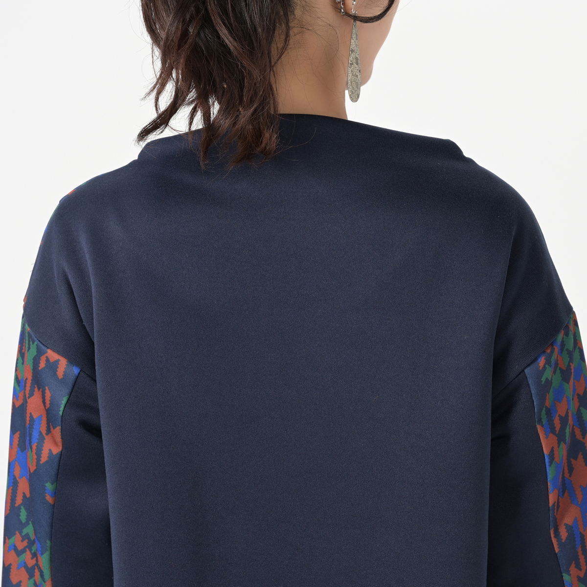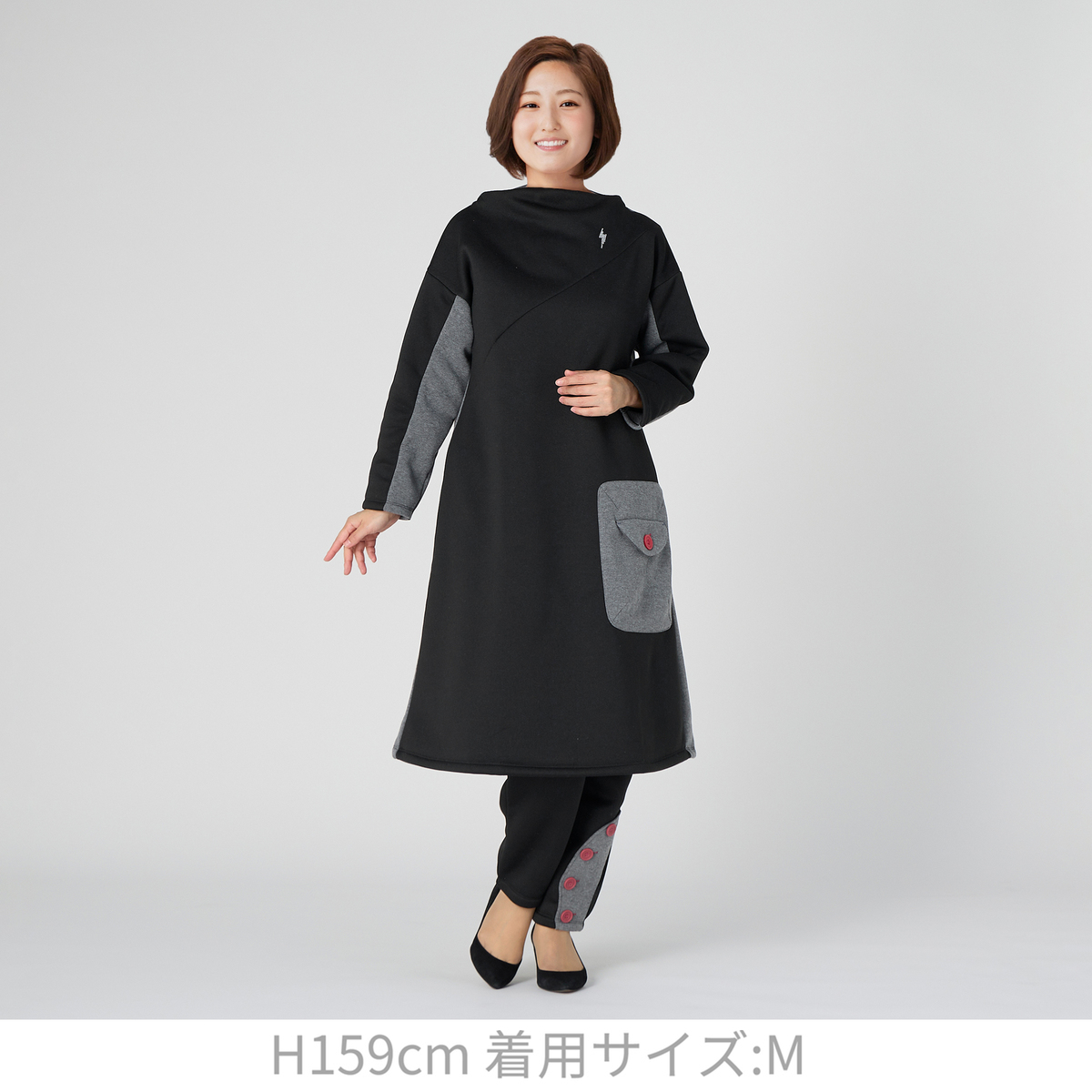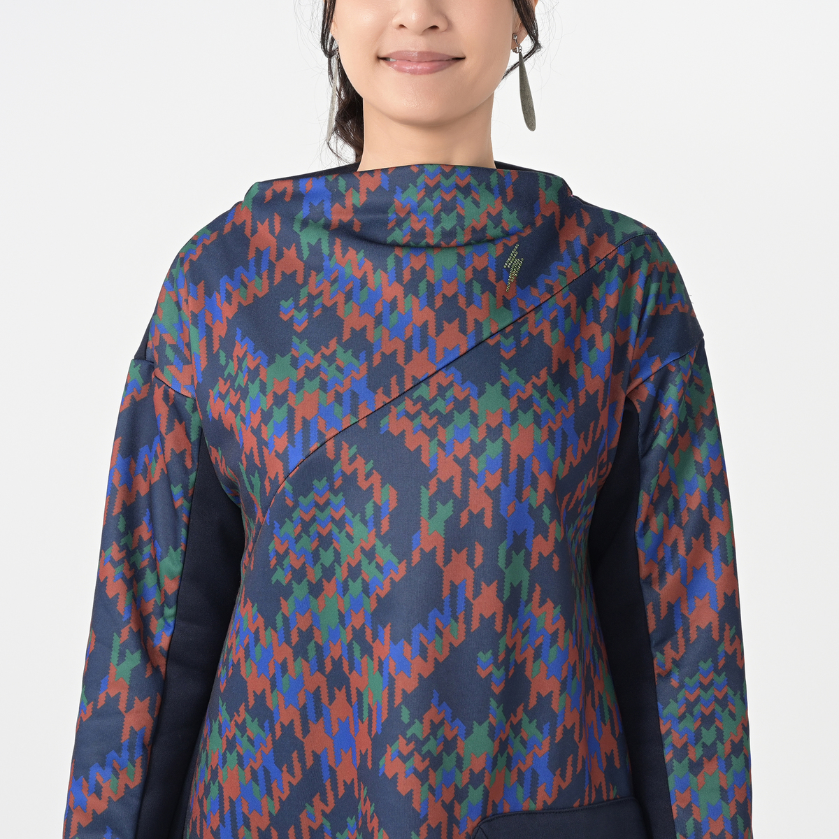 チェックをアレンジしたオリジナル柄プリントのワンピースチュニック。立体的で大きなポケットや配色のボタン使いが楽しく、一枚で着映えするSUPERLADYらしいデザインです。裏起毛のあたたかい素材で、ふんわり軽い着心地もお楽しみいただけます