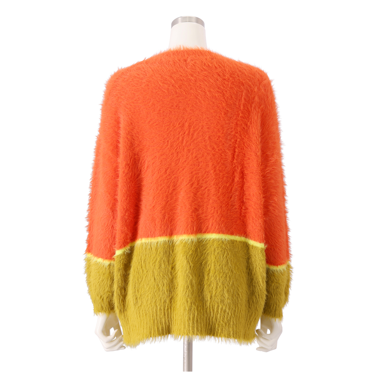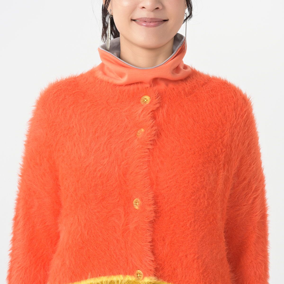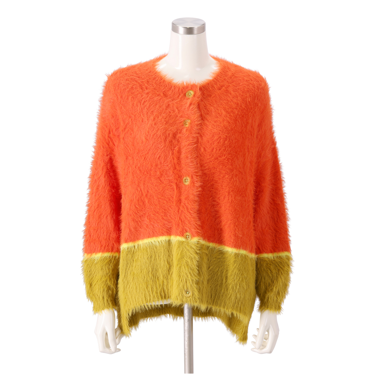 配色切り替えの編み柄が目を惹くシャギーニットカーディガン。鮮やかな色使いがコーデのポイントになってくれます