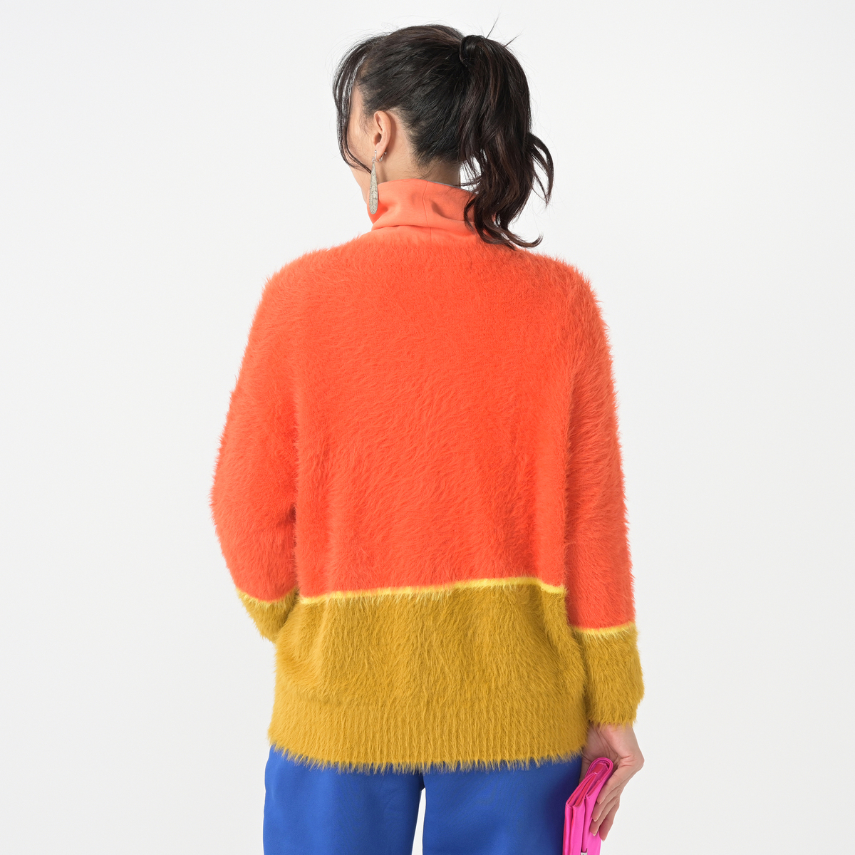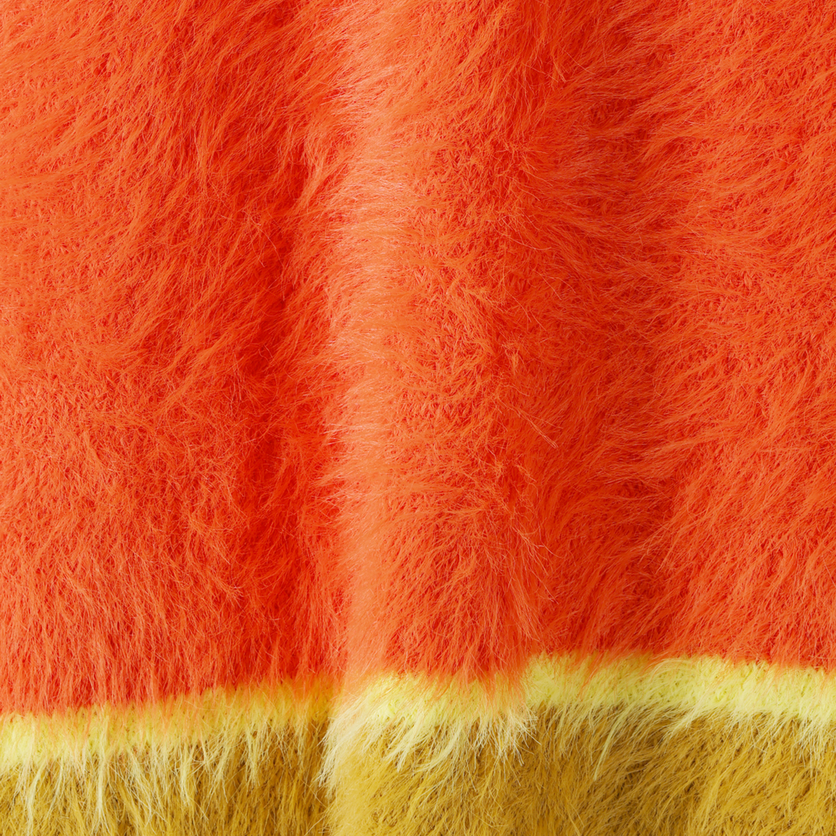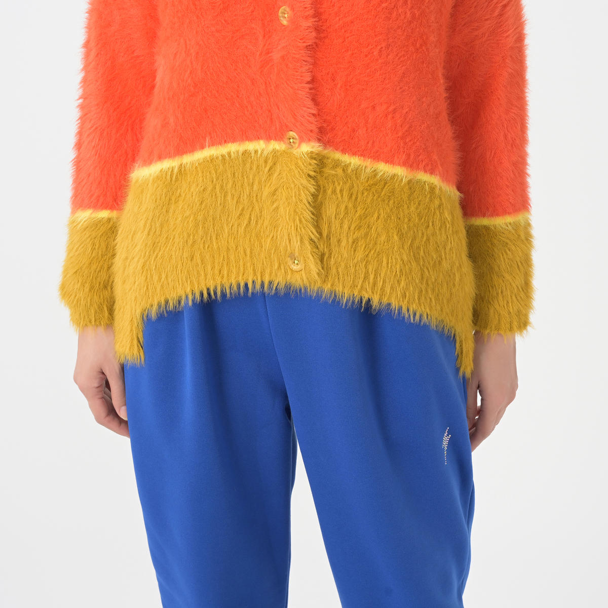 配色切り替えの編み柄が目を惹くシャギーニットカーディガン。鮮やかな色使いがコーデのポイントになってくれます