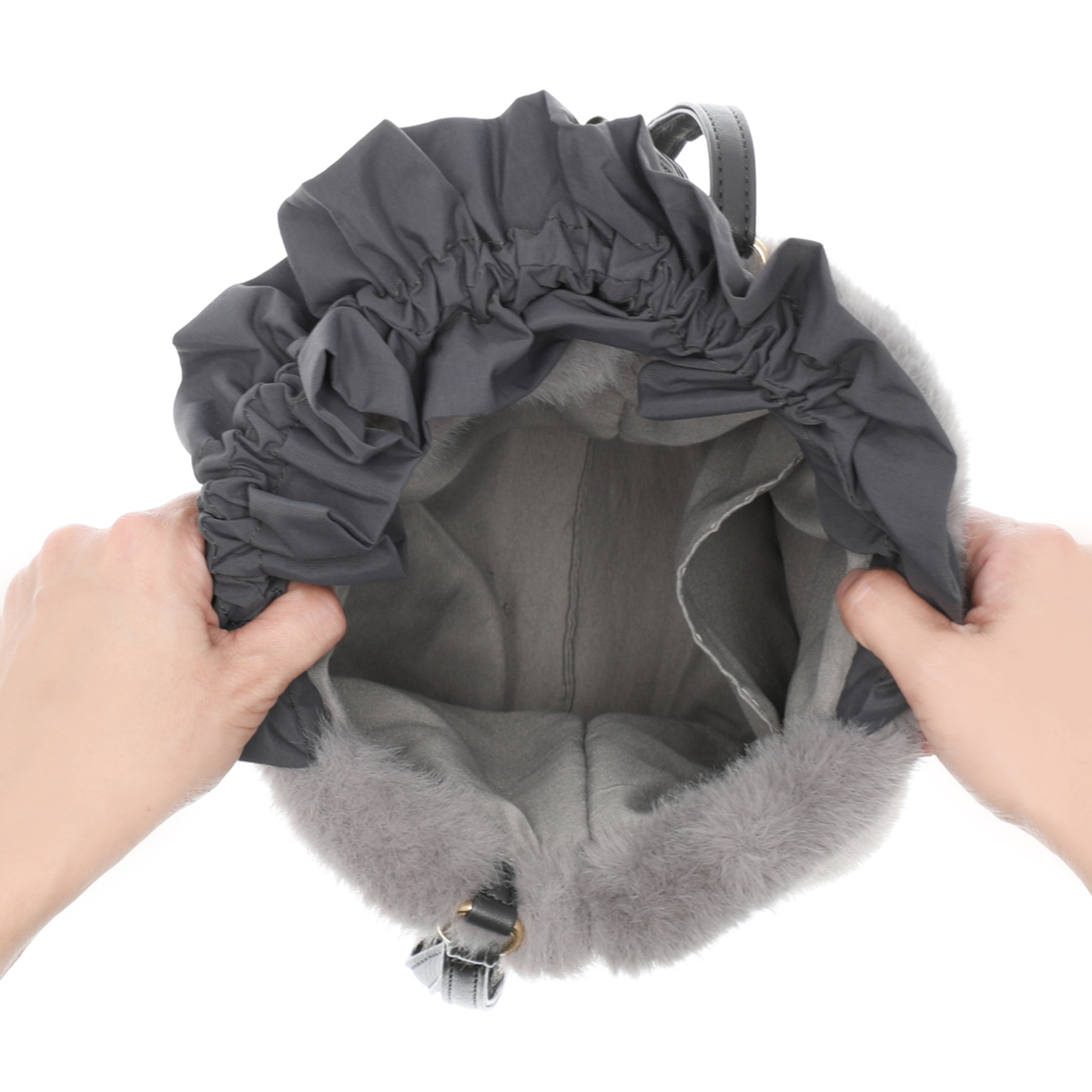 エコファーとギャザーフリルの異素材コンビ。大きめのギャザーフリルハンドルがアクセントになり、カジュアルにもきれいめコーデにも似合います