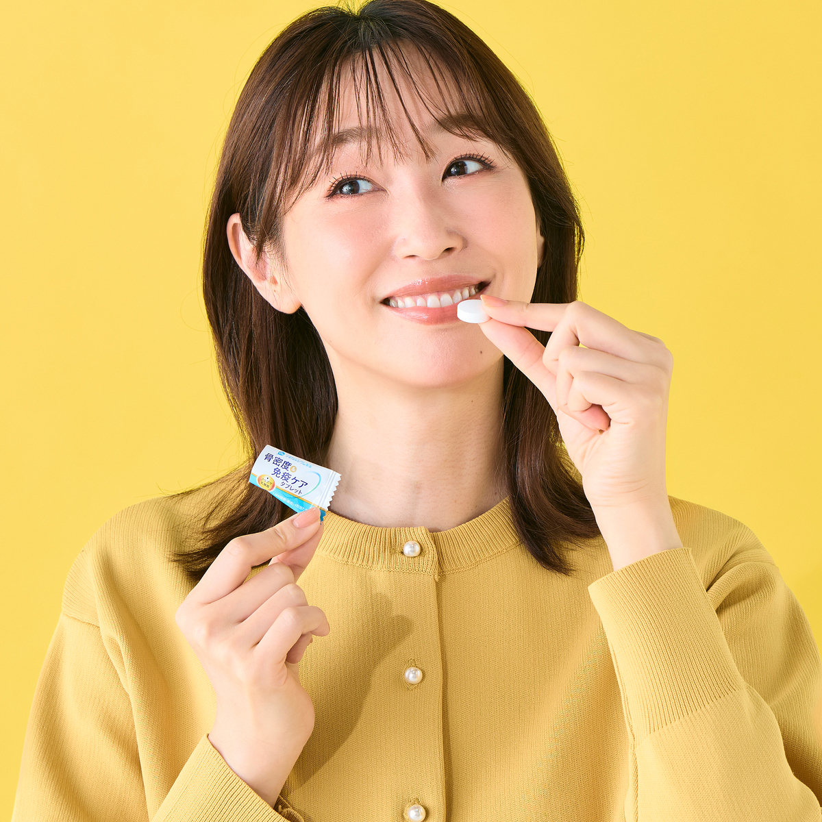 1日あたりの摂取目安量は4粒。4粒に、マルトビオン酸Ca(*1)を2.98g、プラズマ乳酸菌(L. lactis strain Plasma)(*1)を1000億個含んでいます。また、1日分(2.5g×4粒=10g)で250mgのカルシウムが摂取できます(*2)